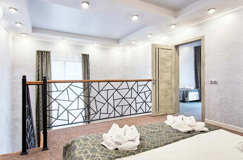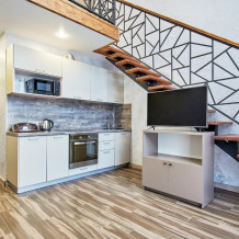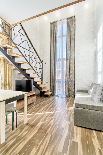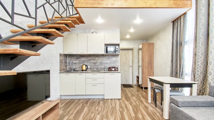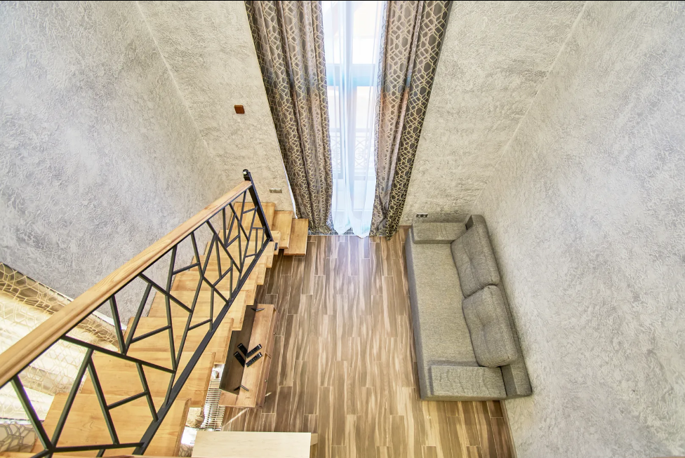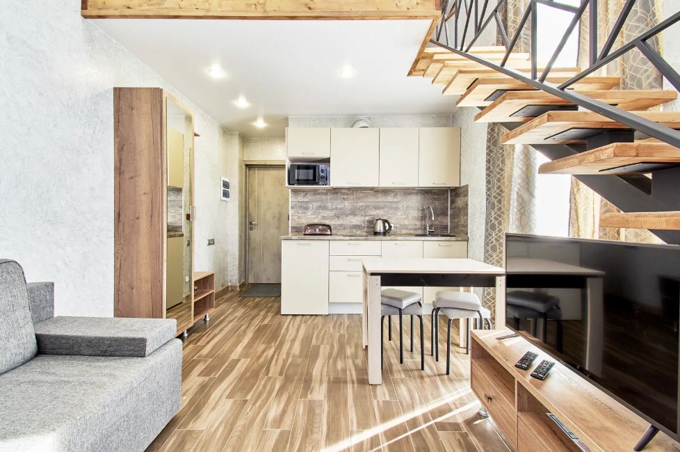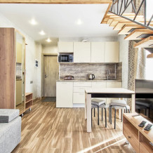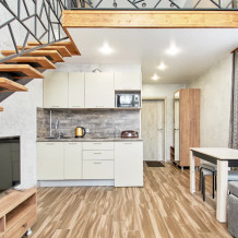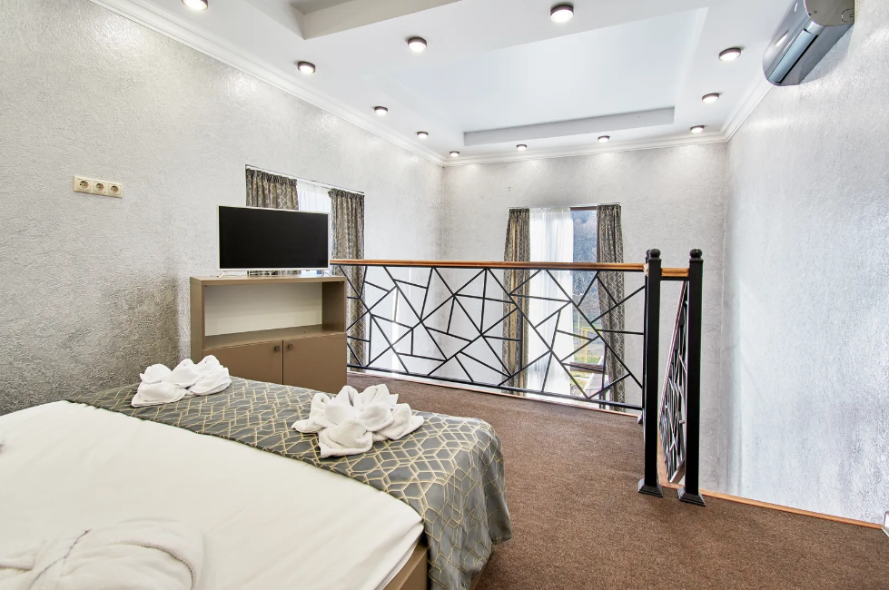 Двухуровневые апартаменты с двуспальной кроватью и балконом с видом на горы. В Апартаментах всё необходимое для комфортного проживания: две односпальные кровати, раскладной диван, два телевизора, Wi-Fi, кухня с микроволновой печью, индукционной варочной плитой, электро-чайником и холодильником, душ, туалет, фен, диван, шкаф.