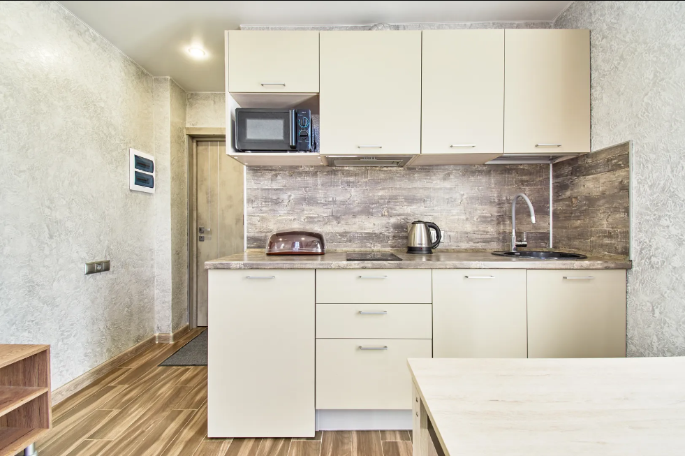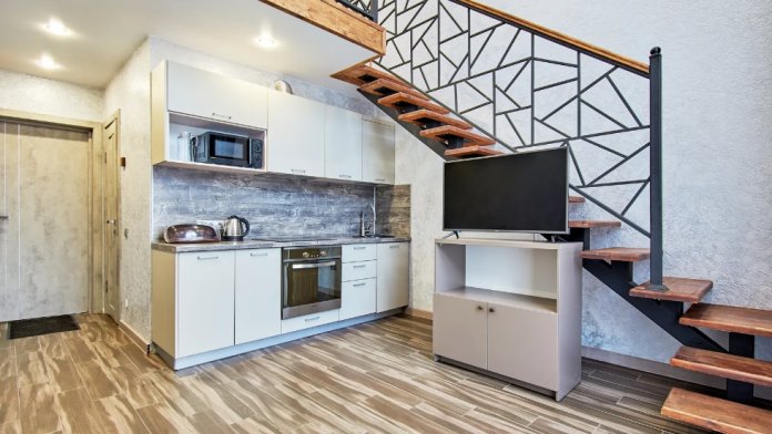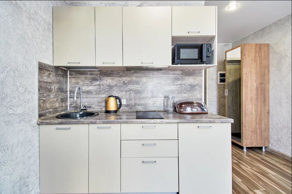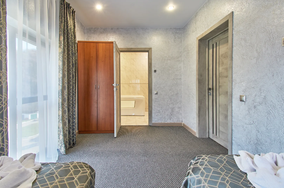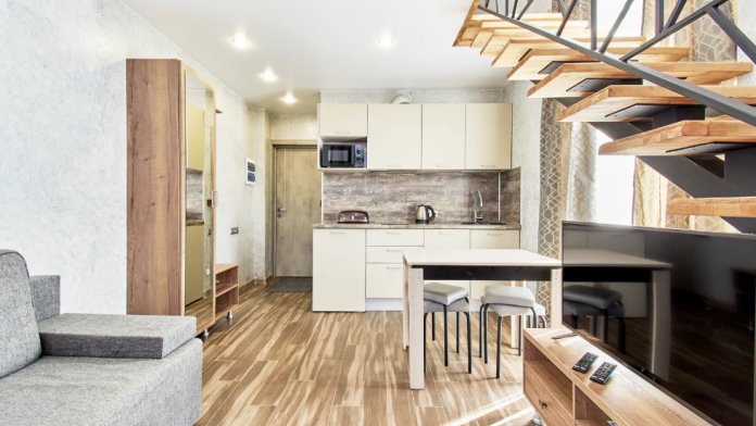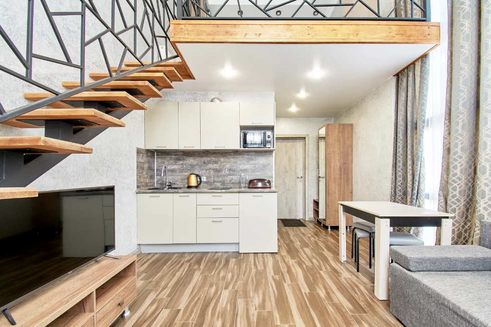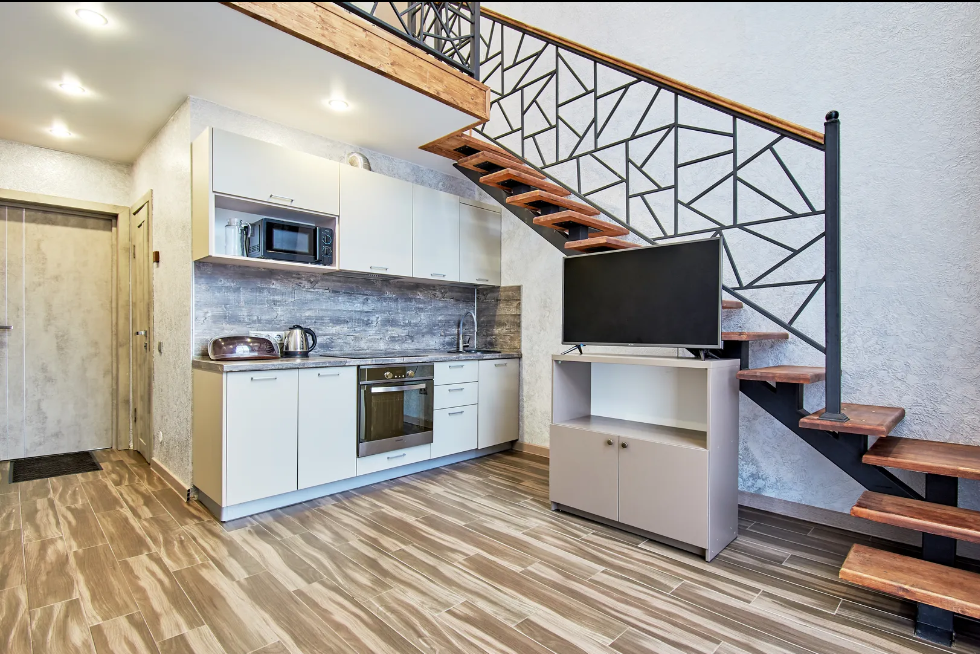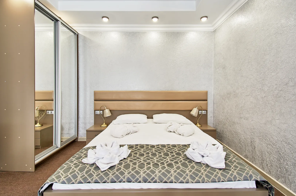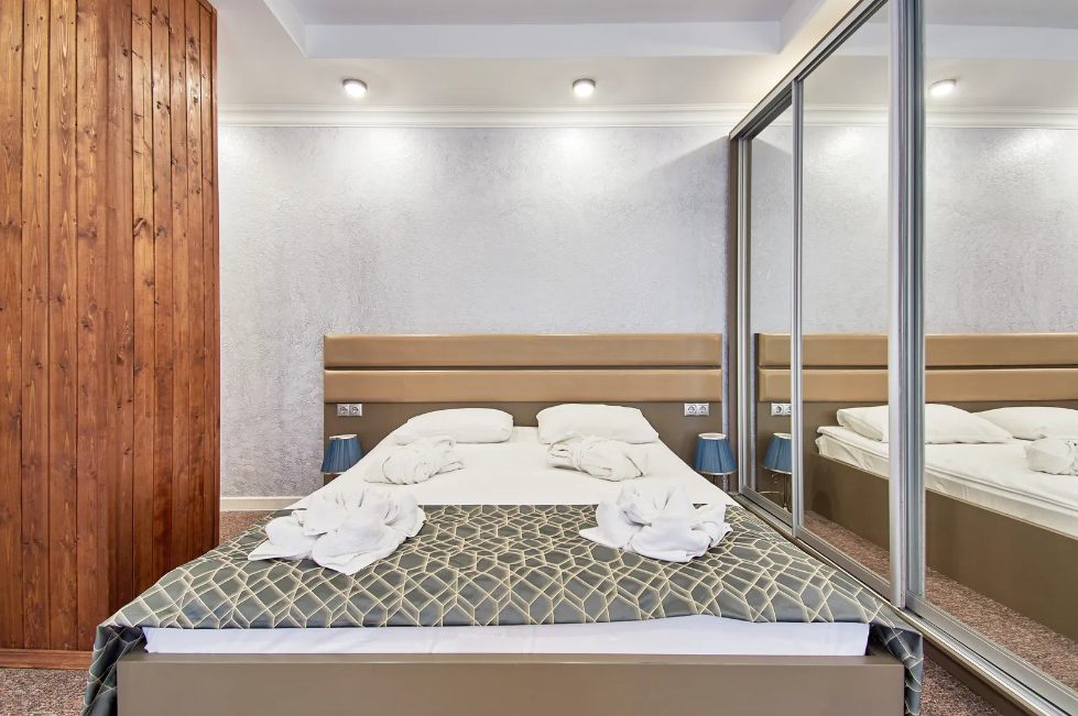 В Апартаментах всё необходимое для комфортного проживания: двуспальная кровать, две односпальные кровати, раскладной диван, два телевизора, Wi-Fi, кухня с микроволновой печью, индукционной варочной плитой, электро-чайником и холодильником, душ,ванная, два туалет, фен, диван, шкаф.