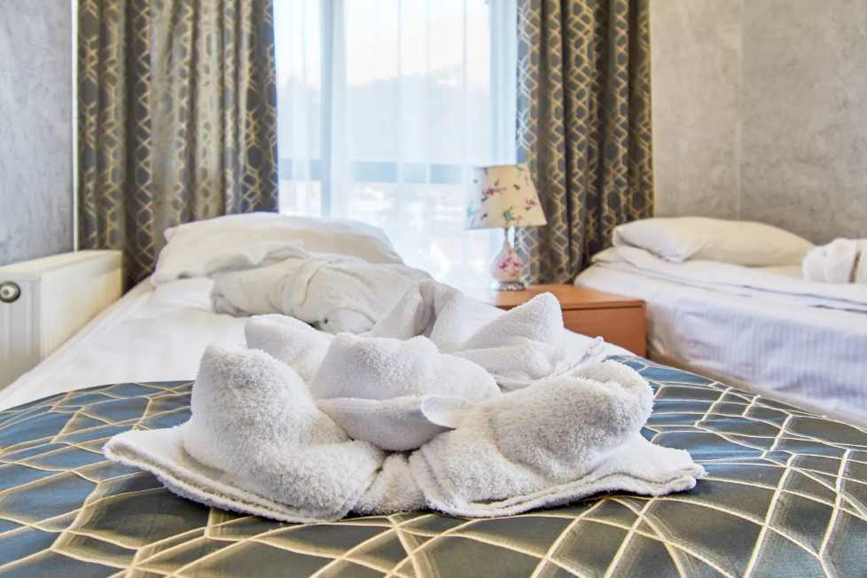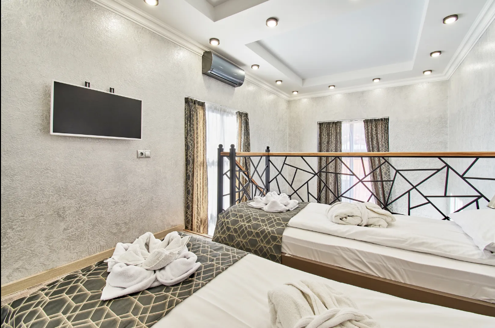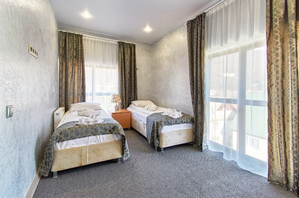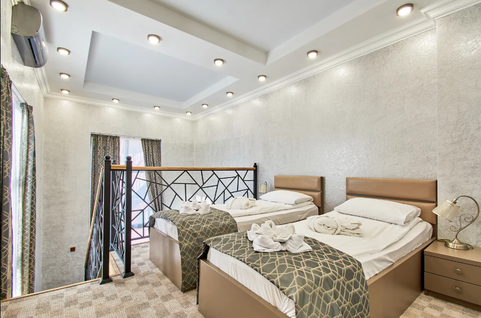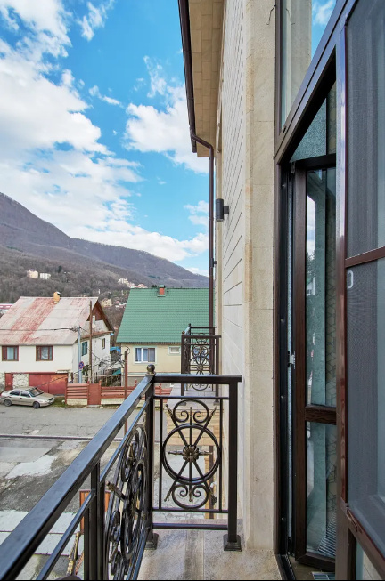 Двухуровневые апартаменты с двумя 1,5 спальными кроватями с балконом и видом на горы. В Апартаментах всё необходимое для комфортного проживания: две односпальные кровати, раскладной диван, два телевизора, Wi-Fi, кухня с микроволновой печью, индукционной варочной плитой, электро-чайником и холодильником, душ, туалет, фен, диван, шкаф.