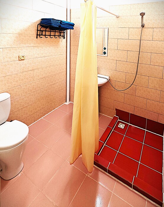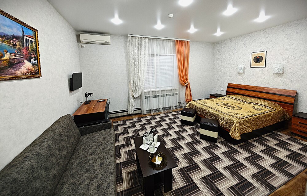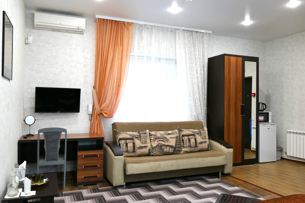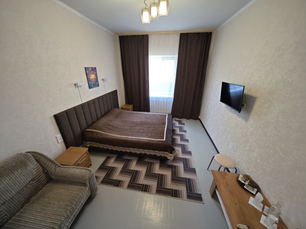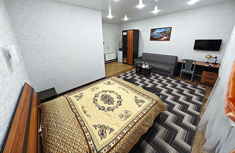 №14. Просторный улучшенный номер находится в отдельном корпусе от основного здания для тех, кому важно уют и тишина от соседей, отвечает всем современным требованиям комфорта. Оснащение номера: оборудован двуспальной кроватью и просторным диваном, телевизор с плоским экраном 32», сплит система, холодильник, микроволновка, чайник, письменный стол и журнальный столик с необходимой посудой и многое другое. В ванной комнате: ванная, туалет, фен, бесплатные гигиенические принадлежности: мыло, шампунь, комплект полотенец. Утюг с гладильной доской на 1 этаже основного корпуса.
