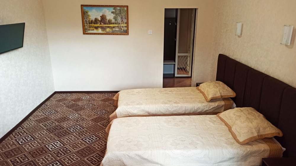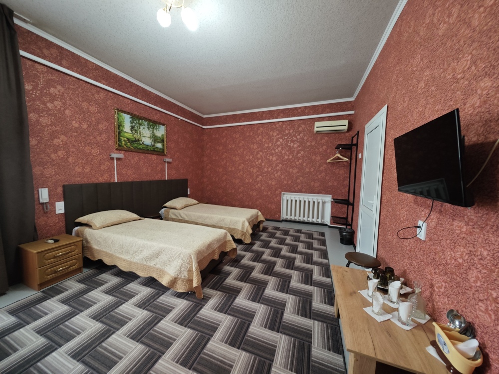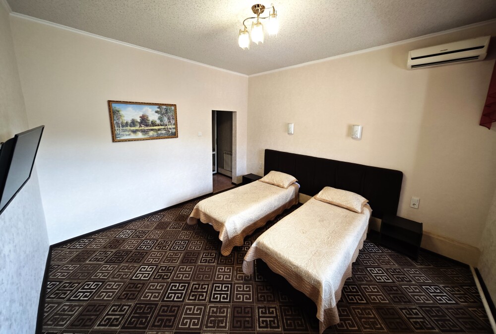 №13. Просторный улучшенный номер находится в отдельном корпусе от основного здания для тех, кому важно уют и тишина от соседей, отвечает всем современным требованиям комфорта. Оснащение номера: оборудован двуспальной кроватью и просторным диваном, телевизор с плоским экраном 32», сплит система, холодильник, микроволновка, чайник, письменный стол и журнальный столик с необходимой посудой и многое другое. В ванной комнате: ванная, туалет, фен, бесплатные гигиенические принадлежности: мыло, шампунь, комплект полотенец. Утюг с гладильной доской на 1 этаже основного корпуса.