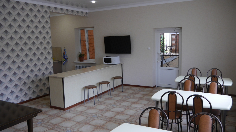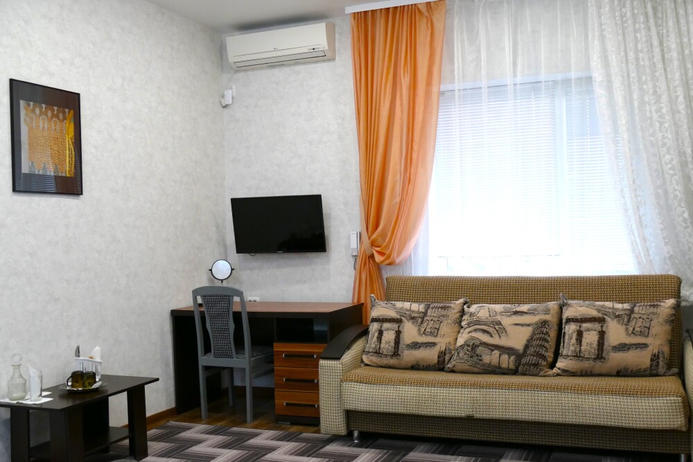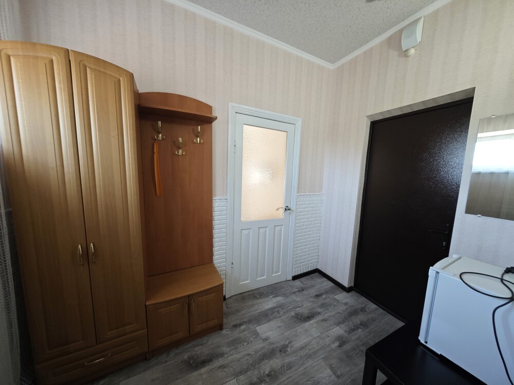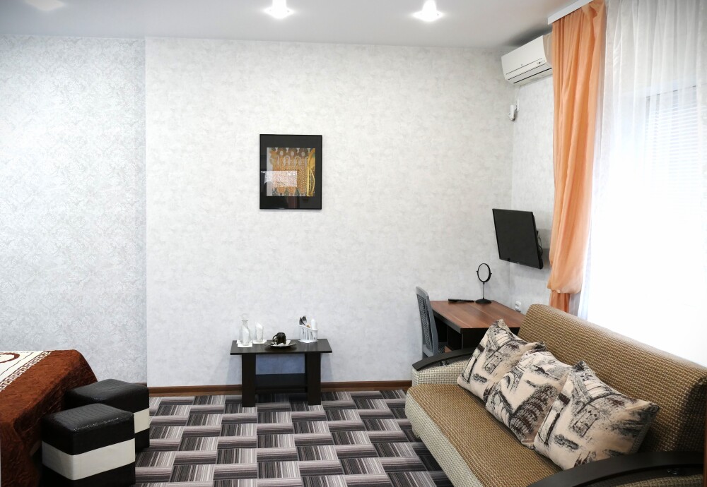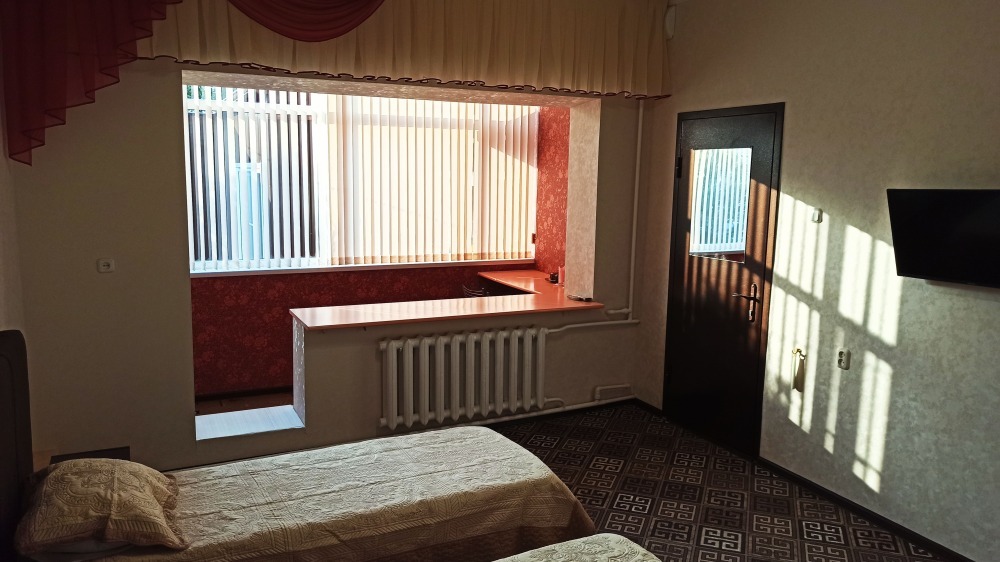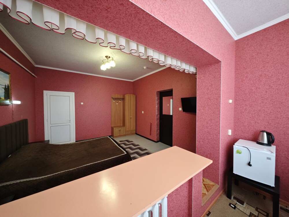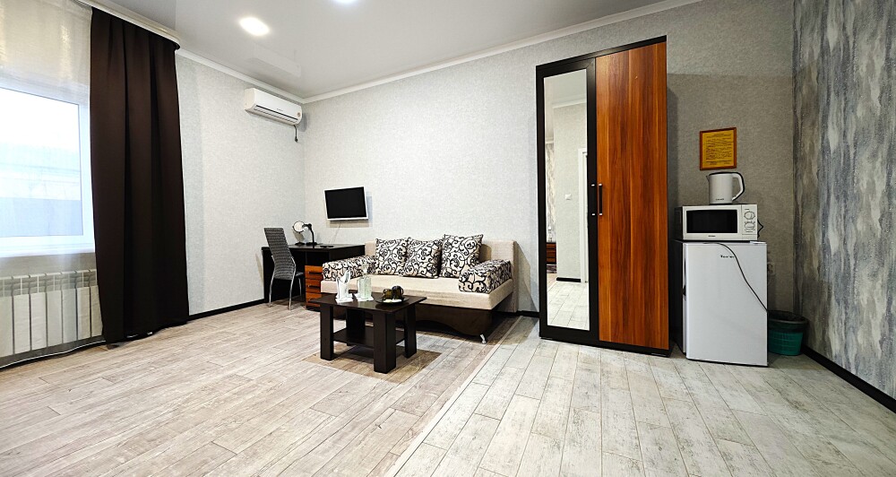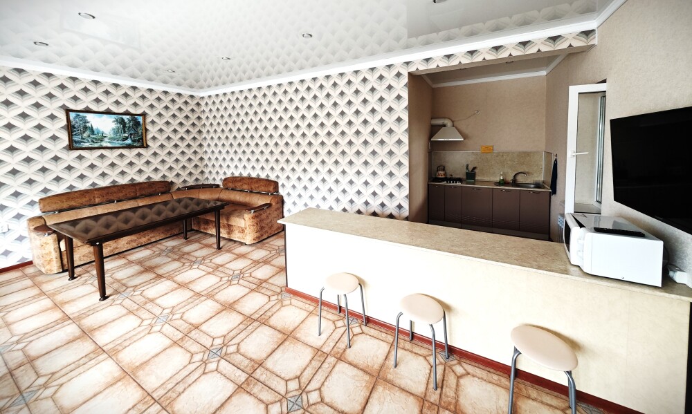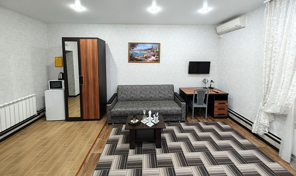 №11. Просторный улучшенный номер находится в отдельном корпусе от основного здания для тех, кому важно уют и тишина от соседей, отвечает всем современным требованиям комфорта. Оснащение номера: оборудован двуспальной кроватью и просторным диваном, телевизор с плоским экраном 32», сплит система, холодильник, микроволновка, чайник, письменный стол и журнальный столик с необходимой посудой и многое другое. В ванной комнате: душ, туалет, фен, бесплатные гигиенические принадлежности: мыло, шампунь, комплект полотенец. Утюг с гладильной доской на 1 этаже основного корпуса.