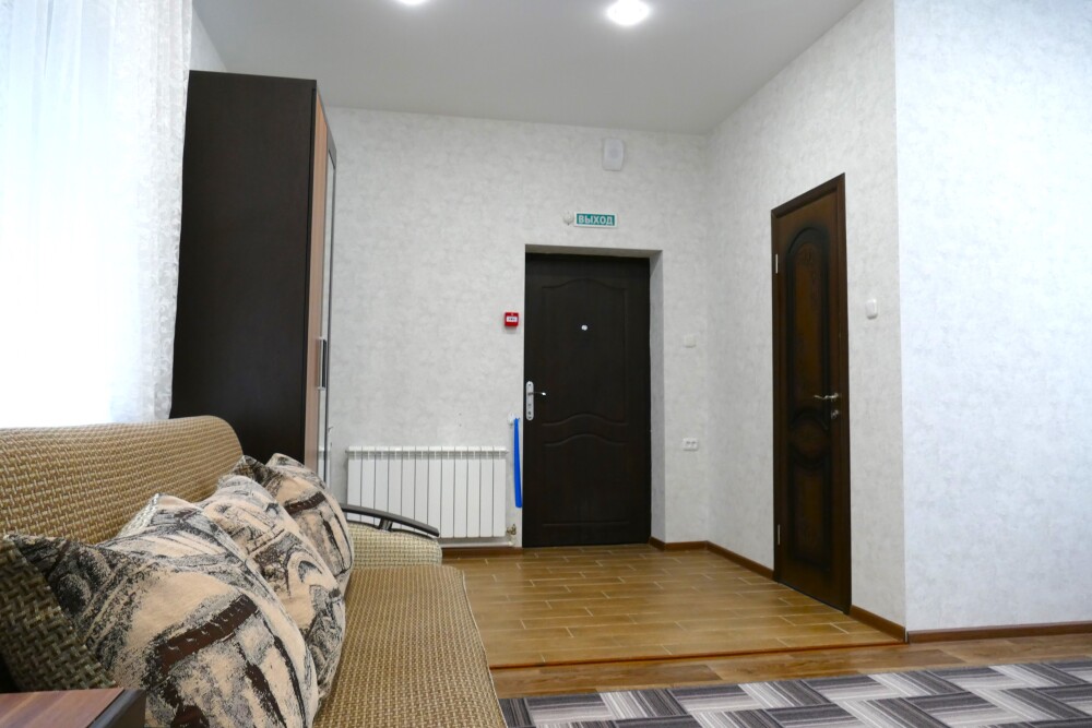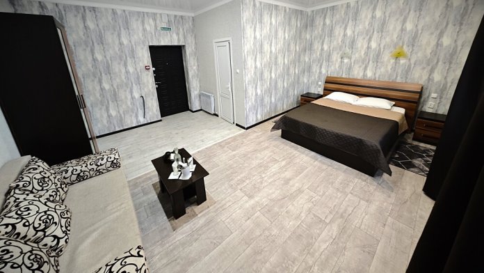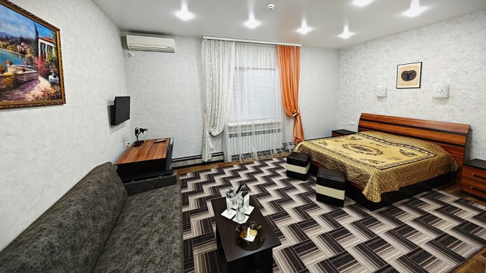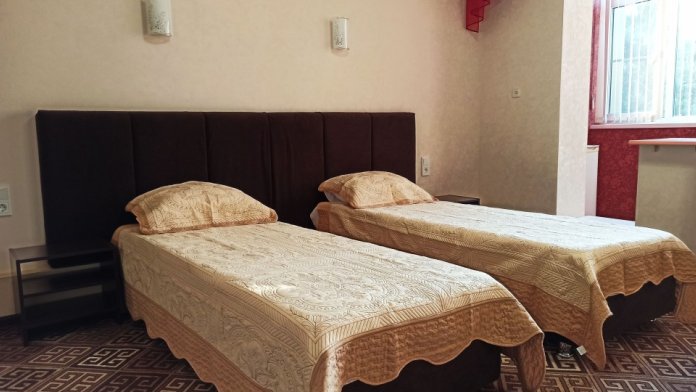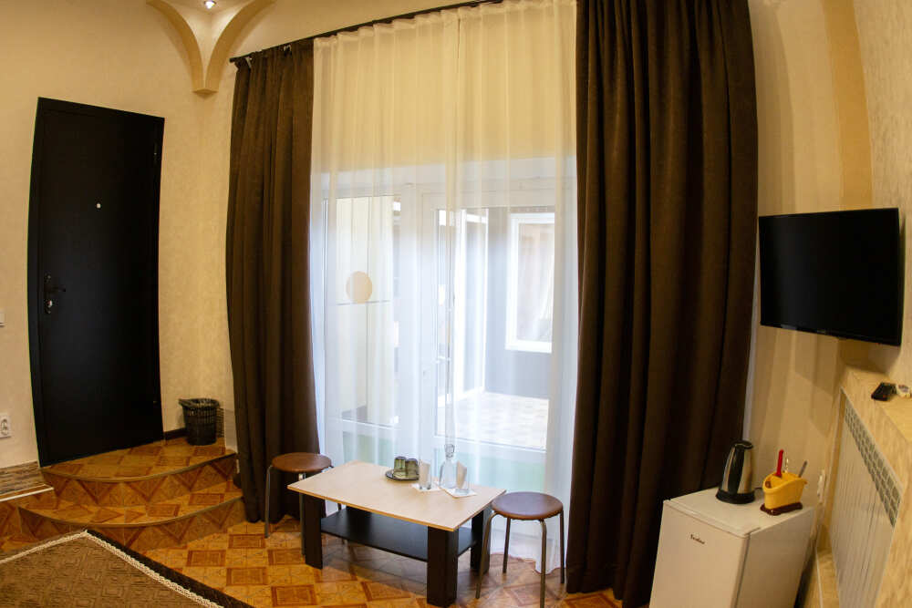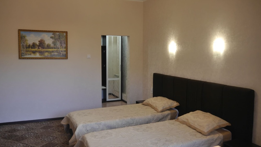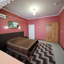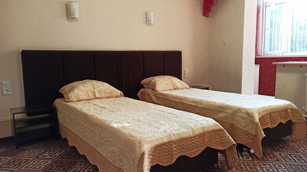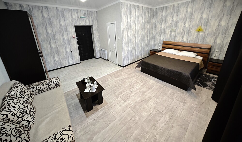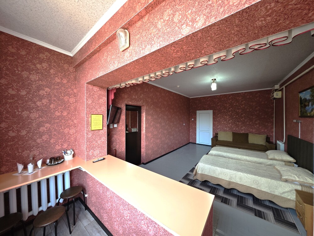 №12. Просторный улучшенный номер находится в отдельном корпусе от основного здания для тех, кому важно уют и тишина от соседей, отвечает всем современным требованиям комфорта. Оснащение номера: оборудован двуспальной кроватью и просторным диваном, телевизор с плоским экраном 32», сплит система, холодильник, микроволновка, чайник, письменный стол и журнальный столик с необходимой посудой и многое другое. В ванной комнате: ванная, туалет, фен, бесплатные гигиенические принадлежности: мыло, шампунь, комплект полотенец. Утюг с гладильной доской на 1 этаже основного корпуса.