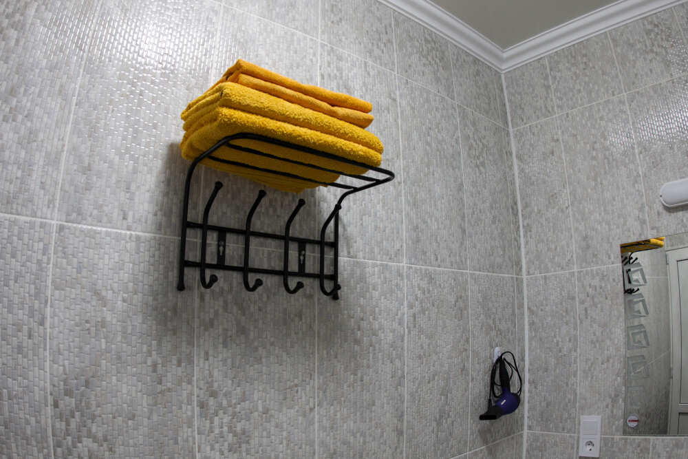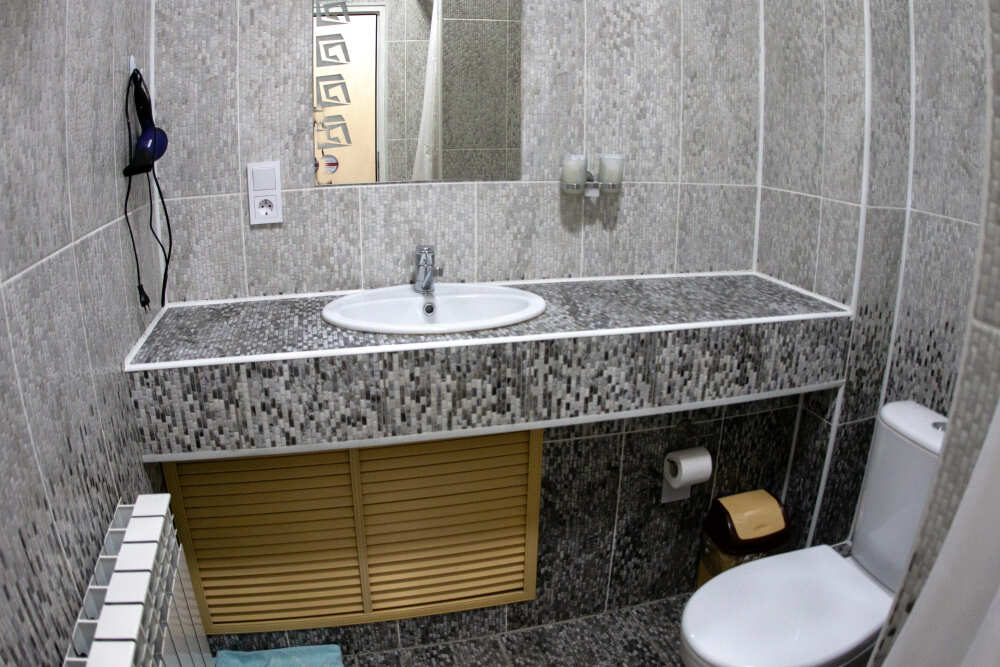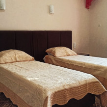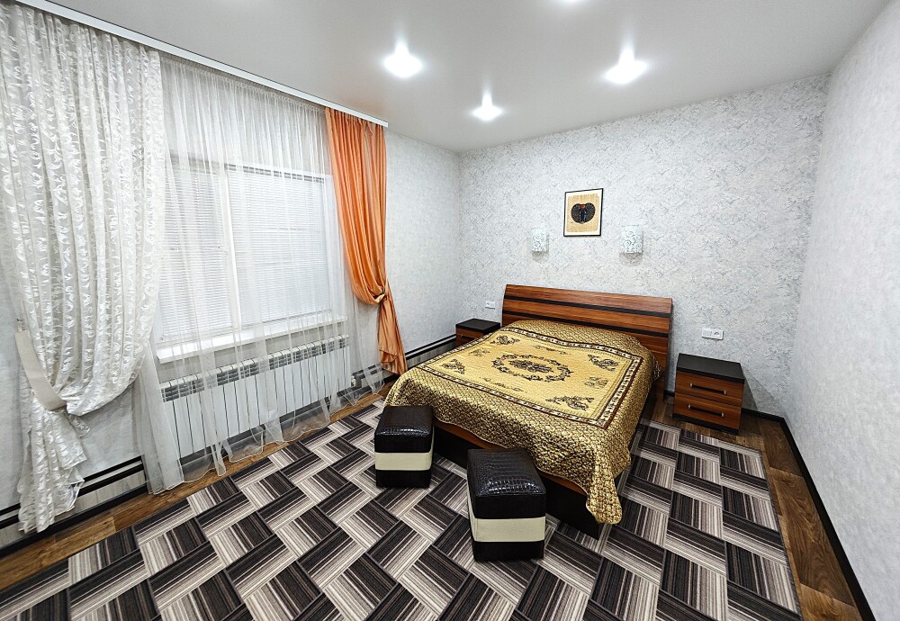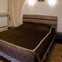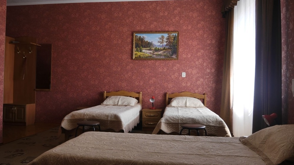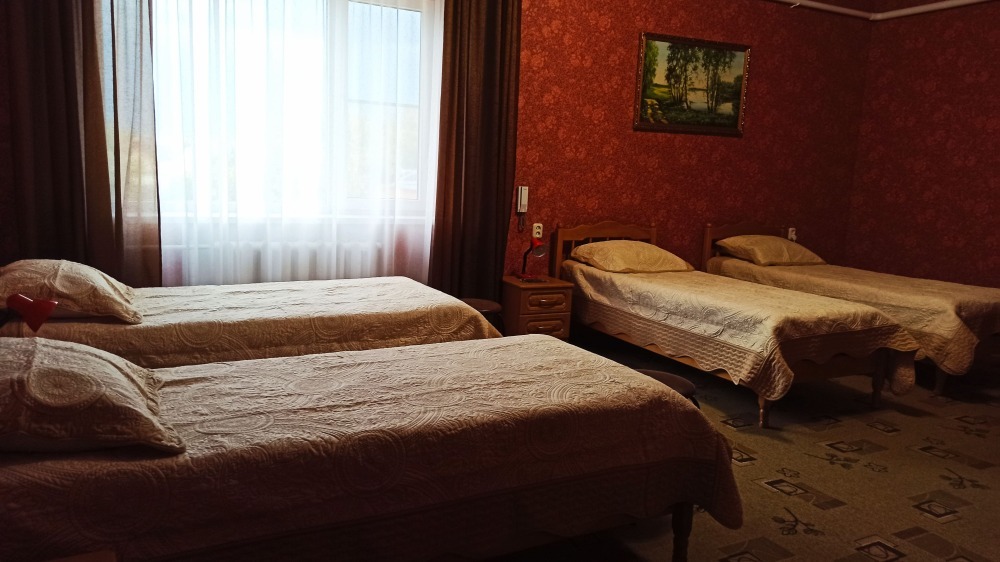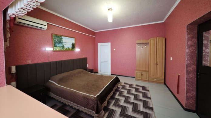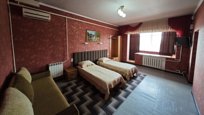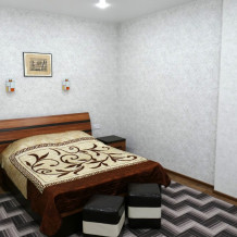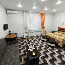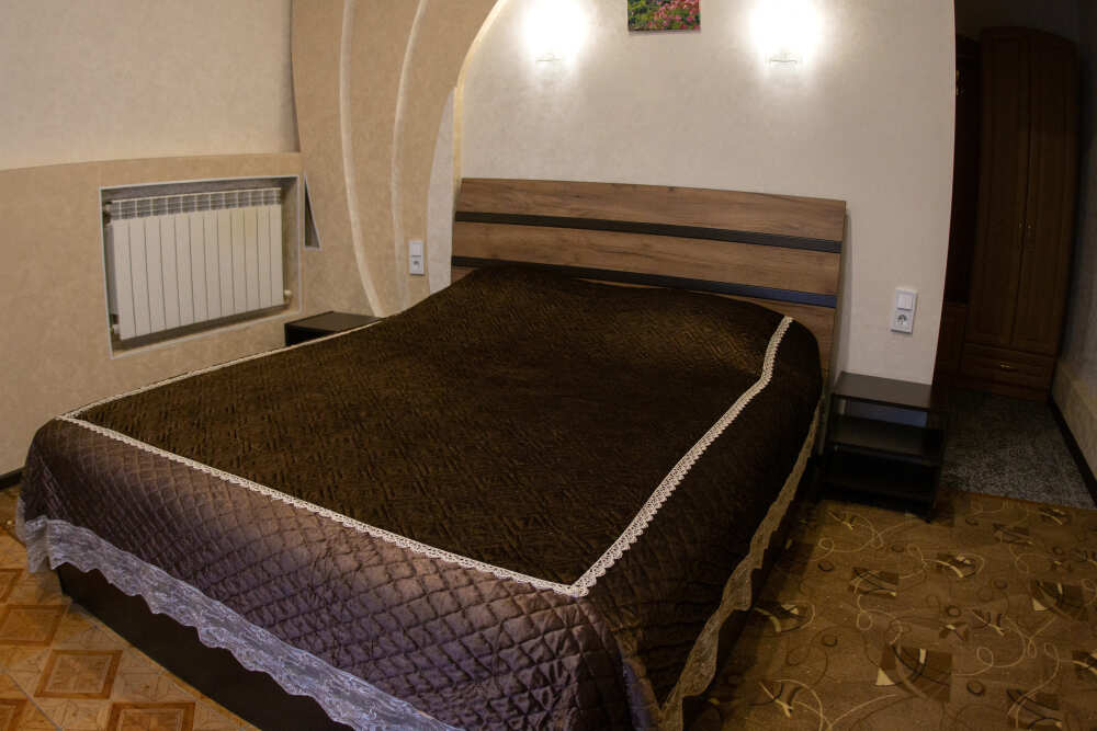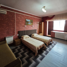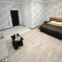 №12. Просторный улучшенный номер находится в отдельном корпусе от основного здания для тех, кому важно уют и тишина от соседей, отвечает всем современным требованиям комфорта. Оснащение номера: оборудован двуспальной кроватью и просторным диваном, телевизор с плоским экраном 32», сплит система, холодильник, микроволновка, чайник, письменный стол и журнальный столик с необходимой посудой и многое другое. В ванной комнате: ванная, туалет, фен, бесплатные гигиенические принадлежности: мыло, шампунь, комплект полотенец. Утюг с гладильной доской на 1 этаже основного корпуса.
