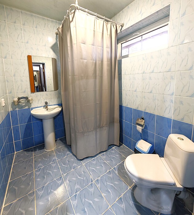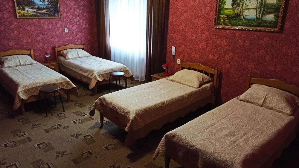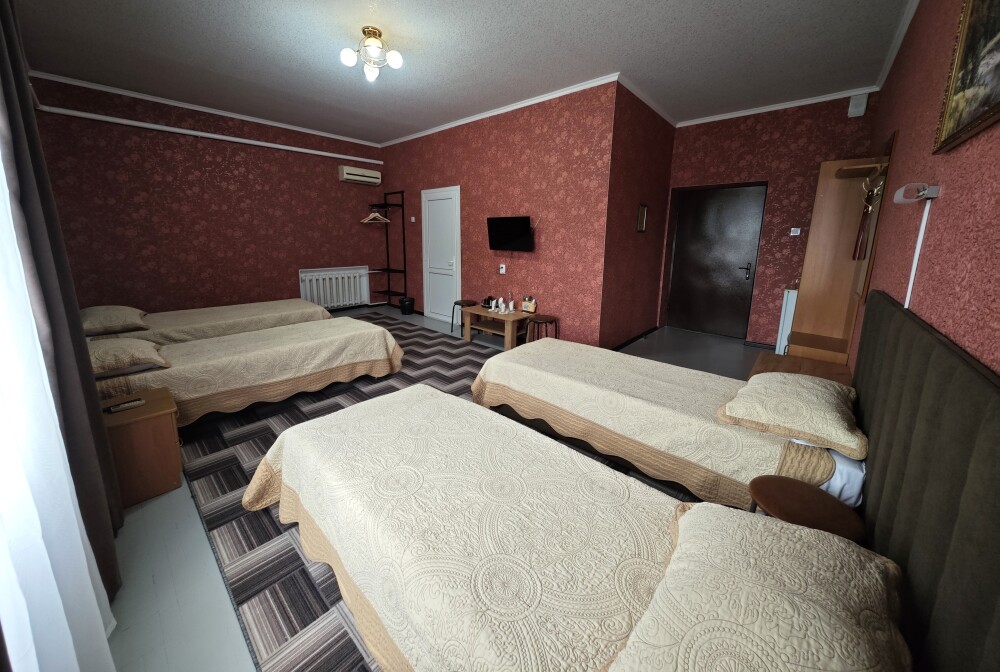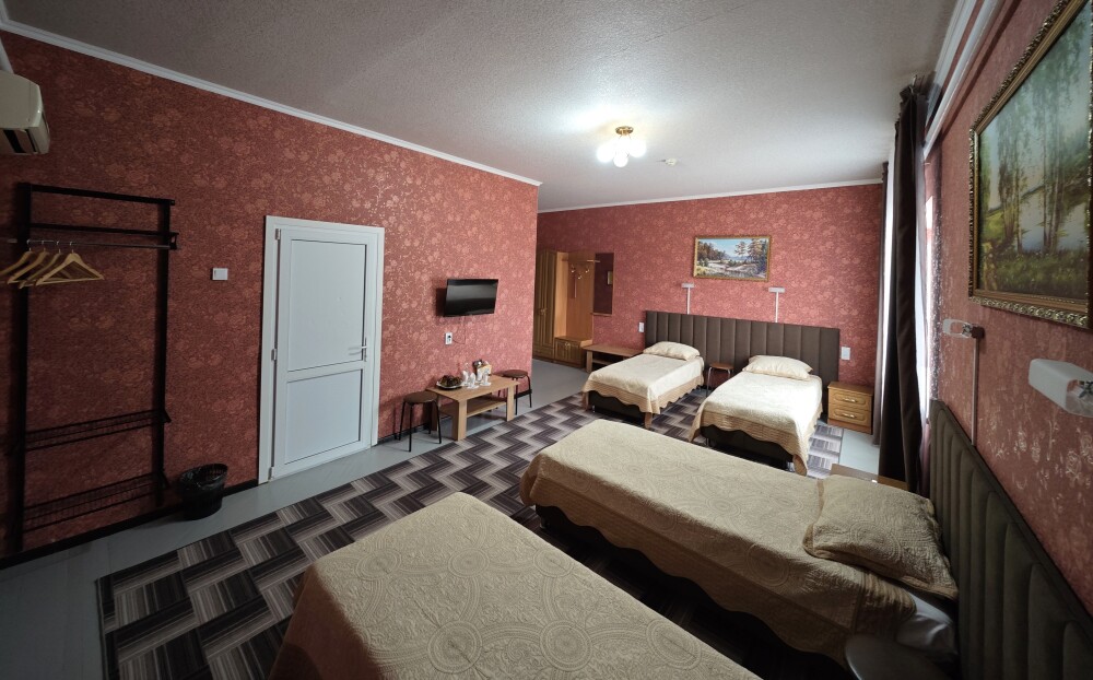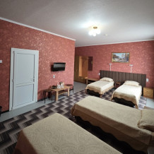 №4. Просторный номер на втором этаже отвечает всем современным требованиям комфорта. Оснащение номера: оборудован 4 раздельными кроватями, телевизор с плоским экраном 32», сплит система, чайник, обеденный стол с необходимой посудой и многое другое. В ванной комнате: душ, туалет, бесплатные гигиенические принадлежности: мыло, шампунь, комплект полотенец. Утюг с гладильной доской, холодильник, микроволновка на этаже. На территории для Вашего комфорта находится современная просторная кухня-столовая для самостоятельного приготовления пищи.