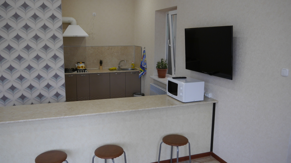 №6. Просторный номер с собственной лоджией на втором этаже отвечает всем современным требованиям комфорта. Оснащение номера: оборудован двуспальной кроватью, телевизор с плоским экраном 32», сплит система, холодильник, микроволновка, чайник, барная стойка с необходимой посудой и многое другое. В ванной комнате: душ, туалет, бесплатные гигиенические принадлежности: мыло, шампунь, комплект полотенец. Утюг с гладильной доской на 1 этаже. На территории для Вашего комфорта находится современная просторная кухня-столовая.