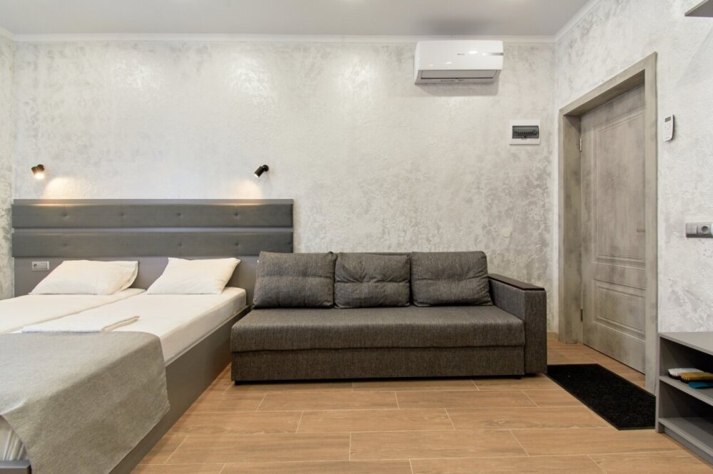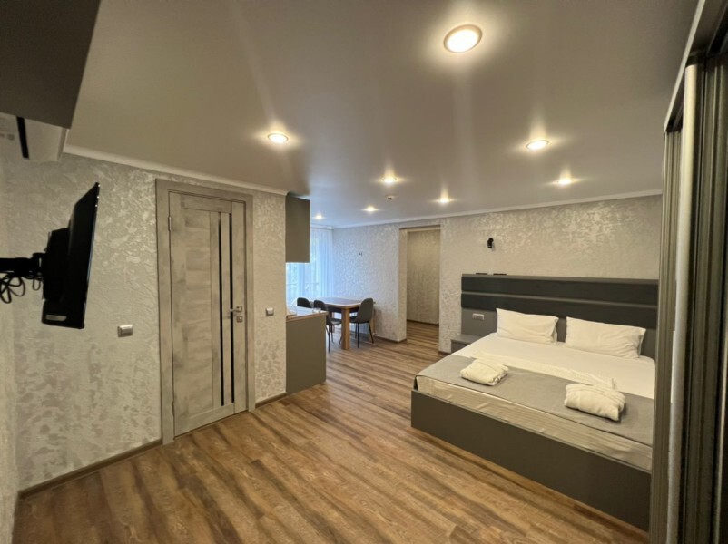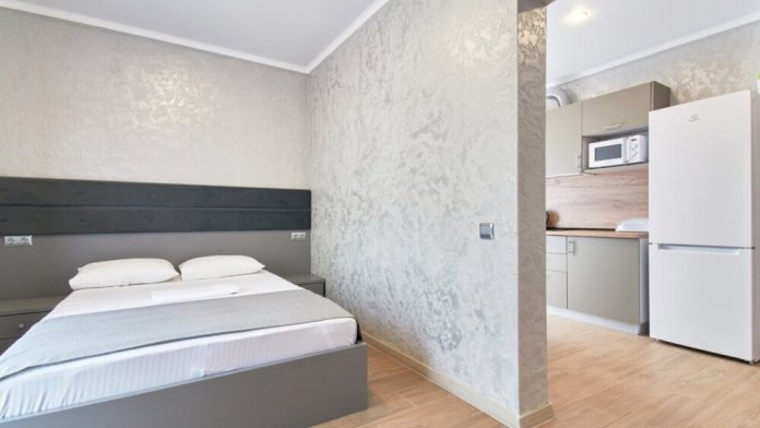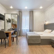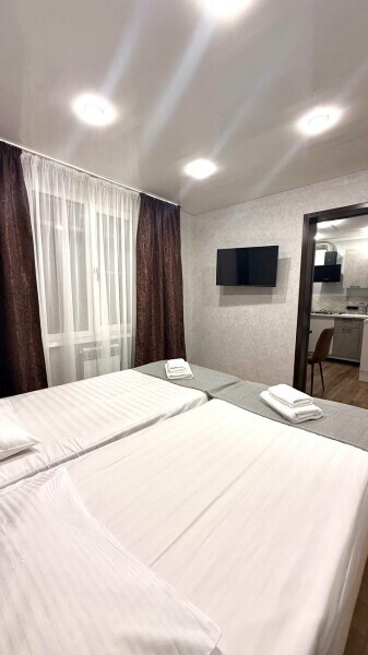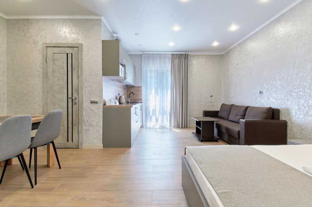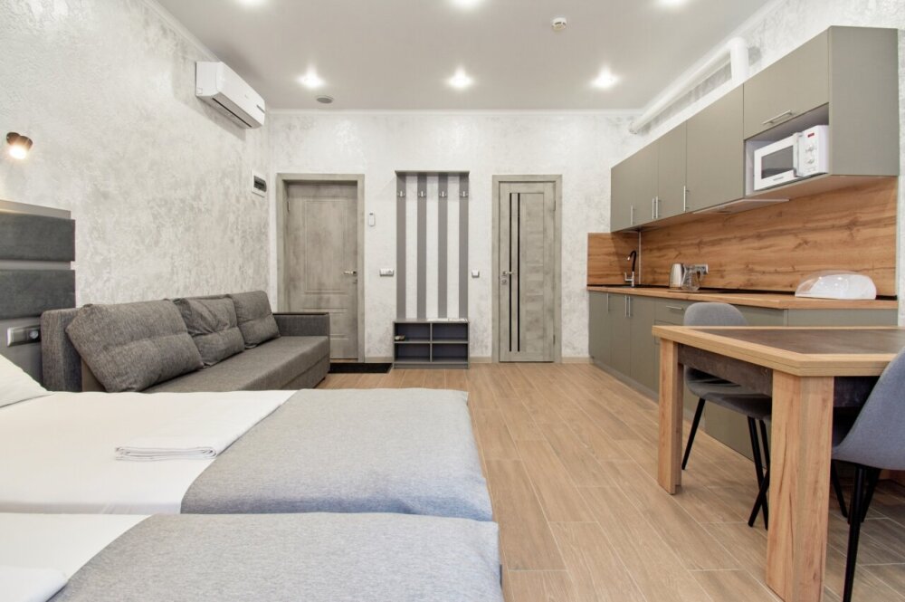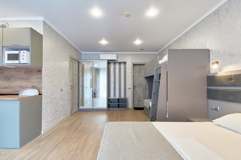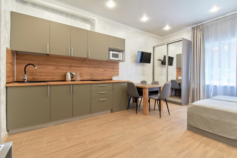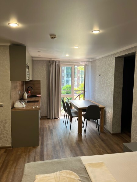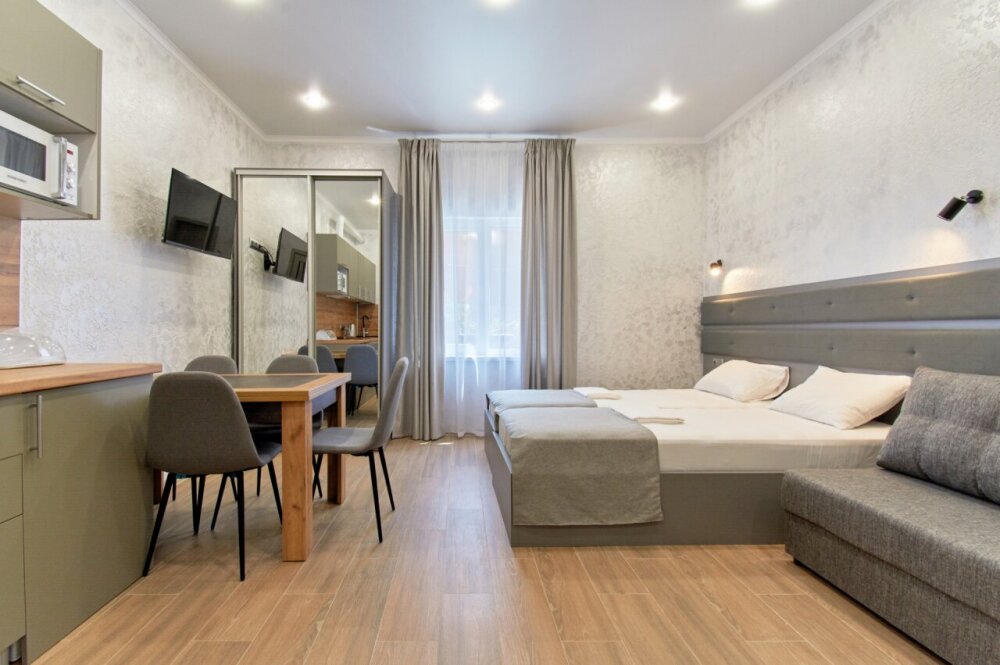 Апартаменты на 1-4 человека с двуспальной кроватью и диваном-кроватью без балкона, дети от 0-6 лет размещаются бесплатно на имеющихся кроватях с родителями. В номере есть санузел с душем, телевизор SMART, кухня, посуда, холодильник, микроволновая печь, чайник, посуда, постельное белье, халаты и тапочки (в зимний период).