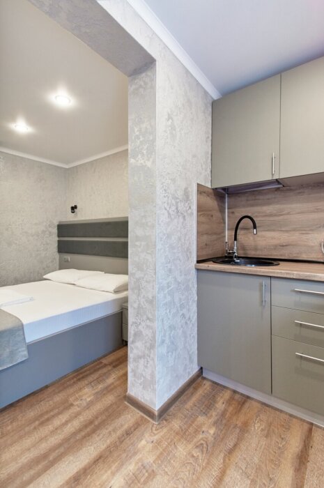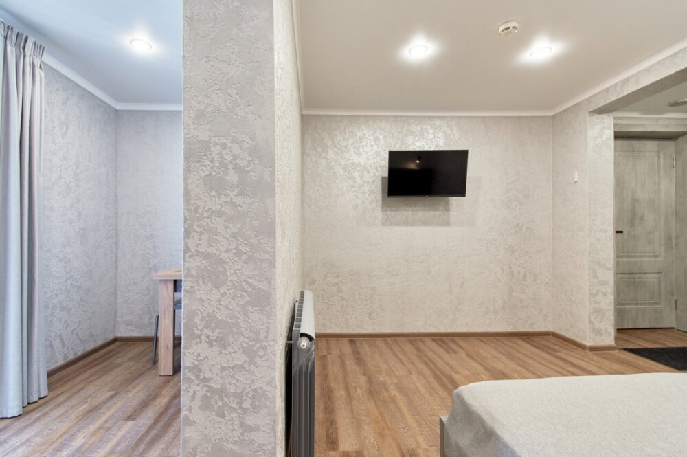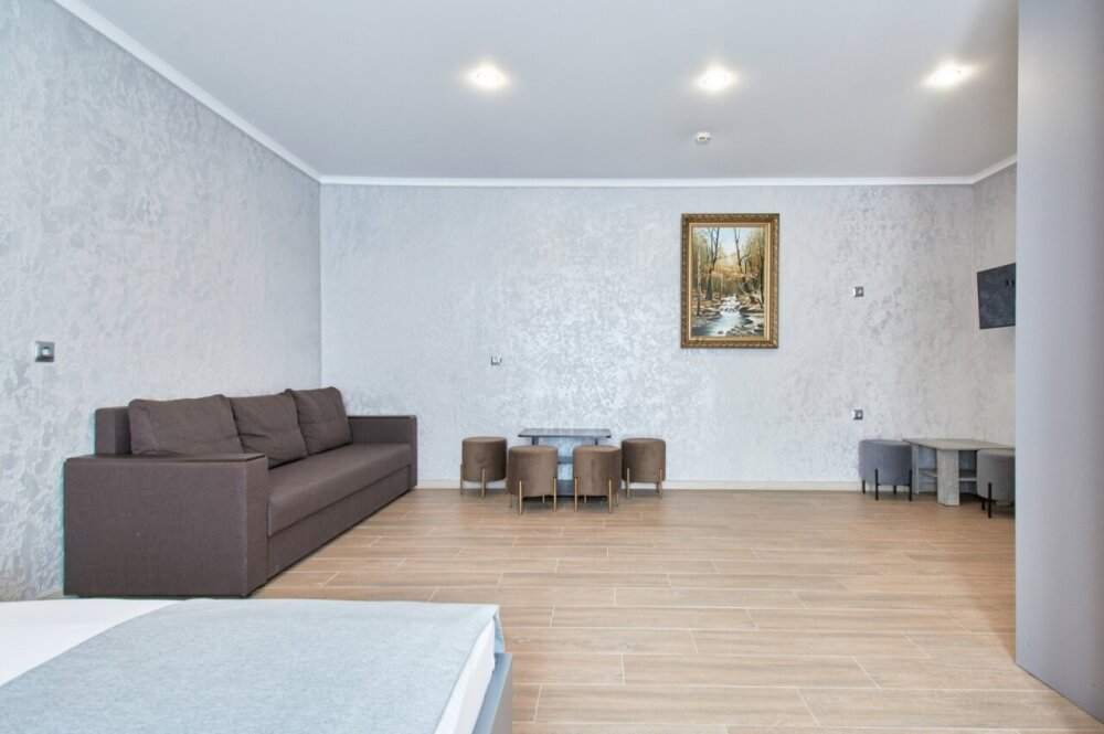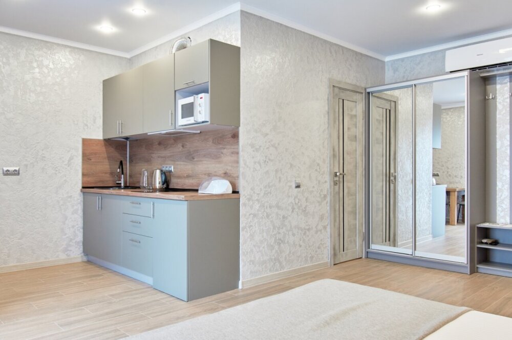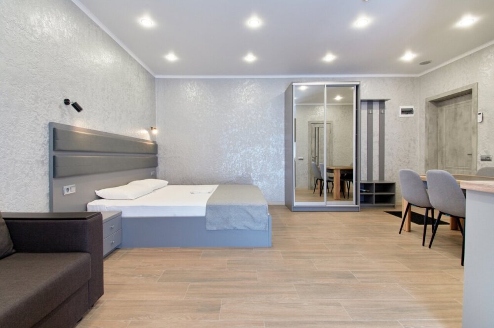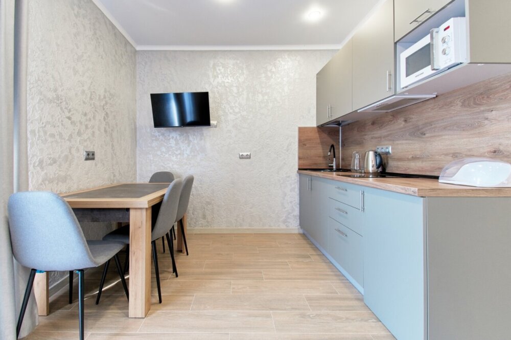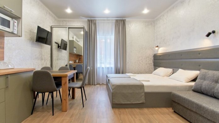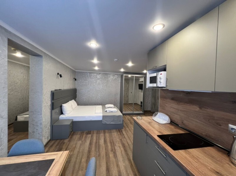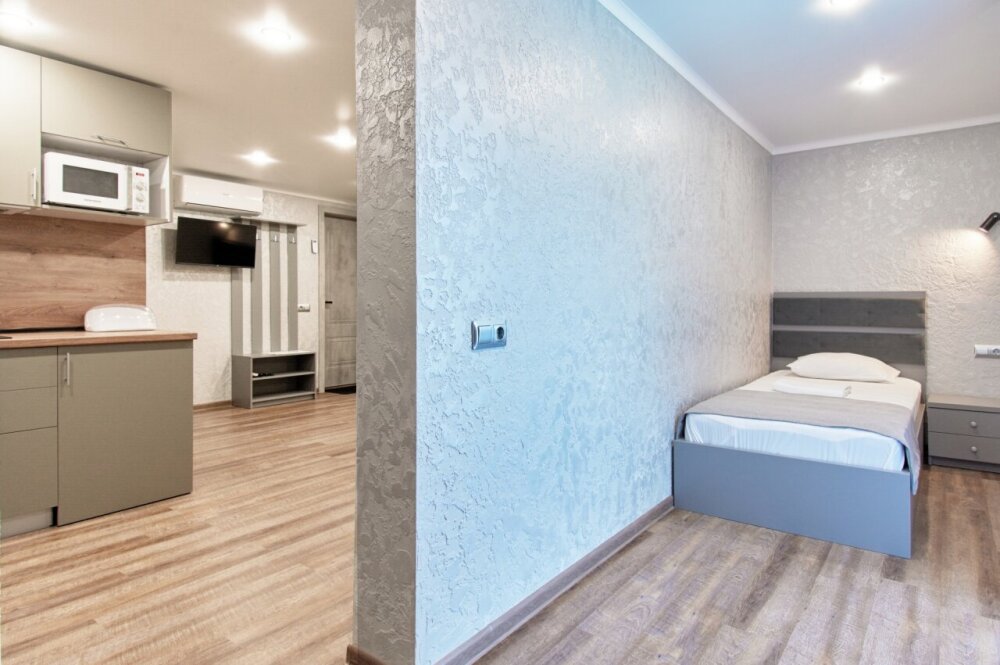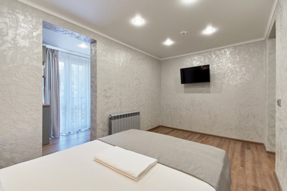 Апартаменты на 1-4 человека с двуспальной кроватью и диваном-кроватью без балкона, дети от 0-6 лет размещаются бесплатно на имеющихся кроватях с родителями. В номере есть санузел с душем, телевизор SMART, кухня, посуда, холодильник, микроволновая печь, чайник, посуда, постельное белье, халаты и тапочки (в зимний период).
