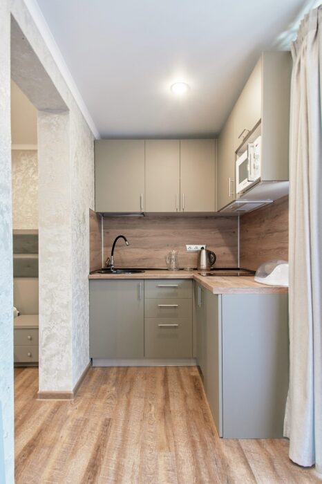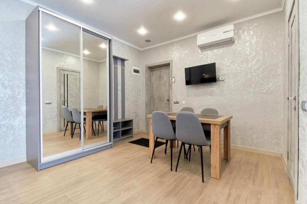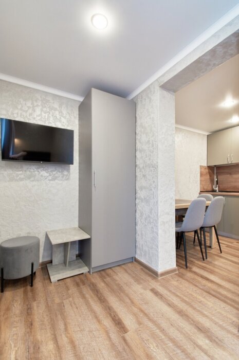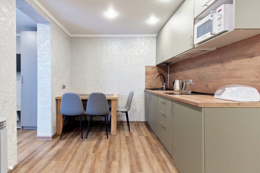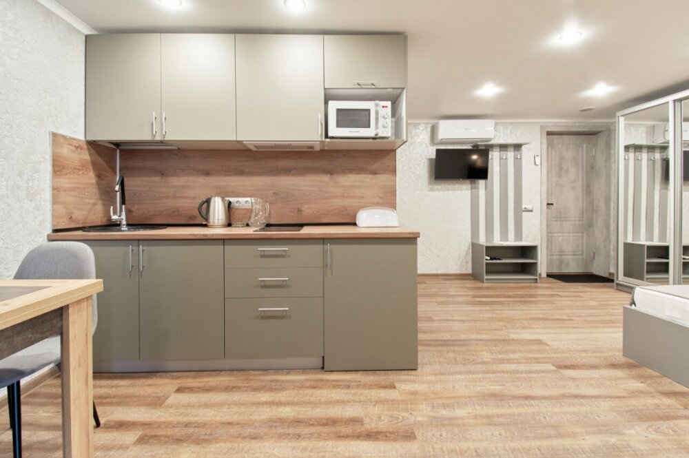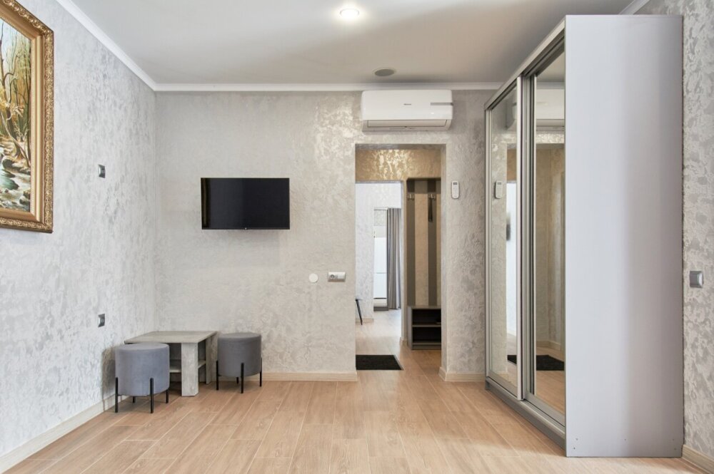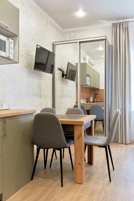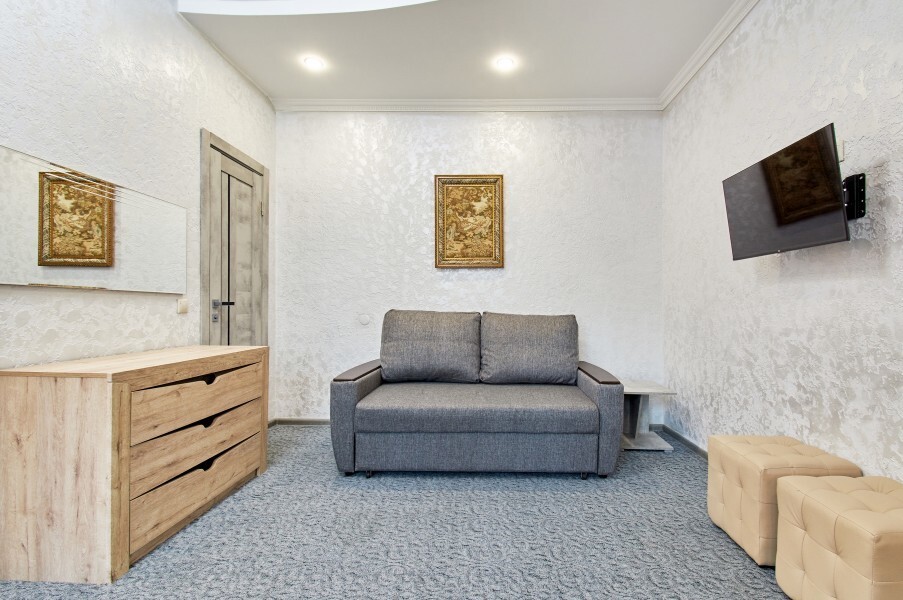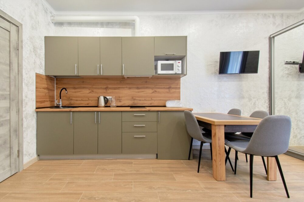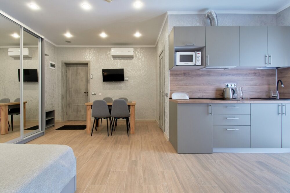 Апартаменты на 1-4 человека с двуспальной кроватью и диваном-кроватью без балкона, дети от 0-6 лет размещаются бесплатно на имеющихся кроватях с родителями. В номере есть санузел с душем, телевизор SMART, кухня, посуда, холодильник, микроволновая печь, чайник, посуда, постельное белье, халаты и тапочки (в зимний период).