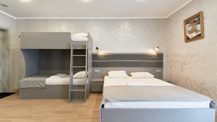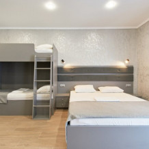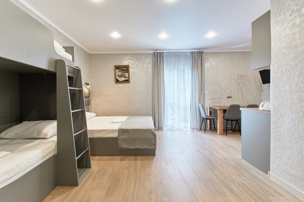 Апартаменты на 1-4 человека с двуспальной кроватью и двухъярусной кроватью с балконом, дети от 0-6 лет размещаются бесплатно на имеющихся кроватях с родителями. В номере есть санузел с душем, телевизор SMART, кухня, посуда, холодильник, микроволновая печь, чайник, посуда, постельное бельё, халаты и тапочки (в зимний период).