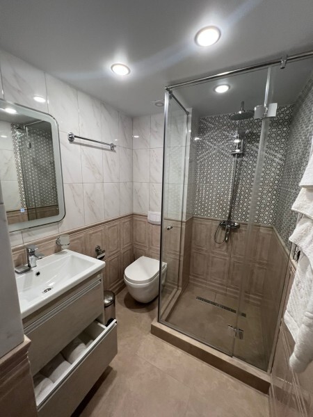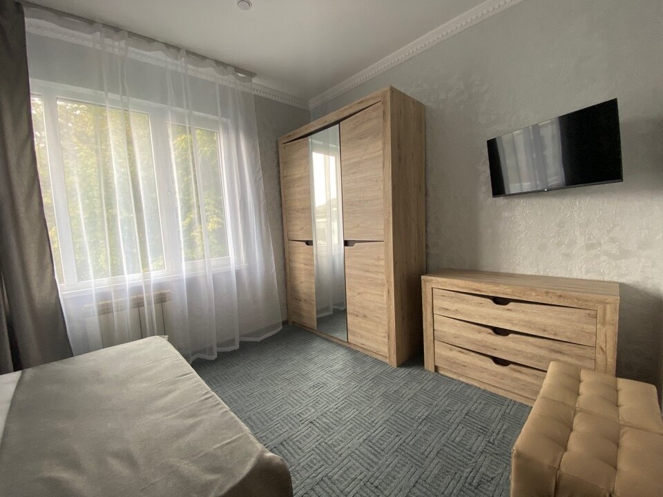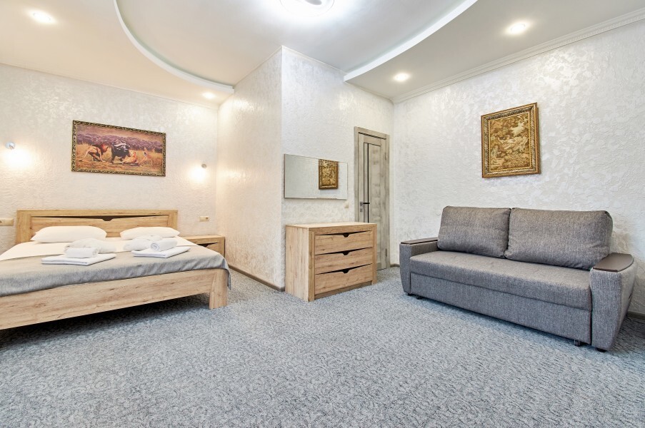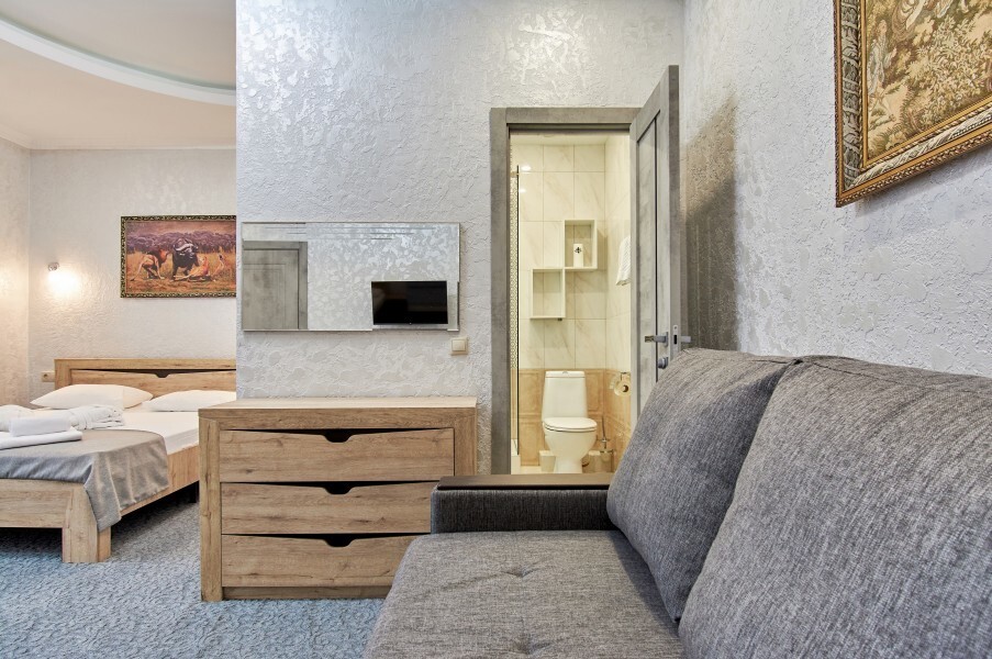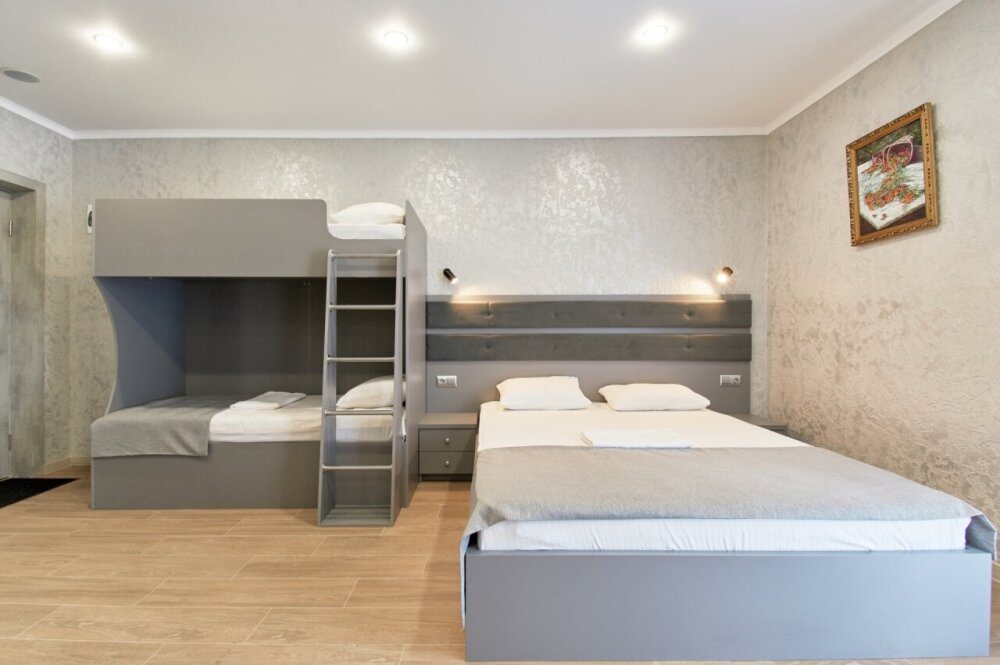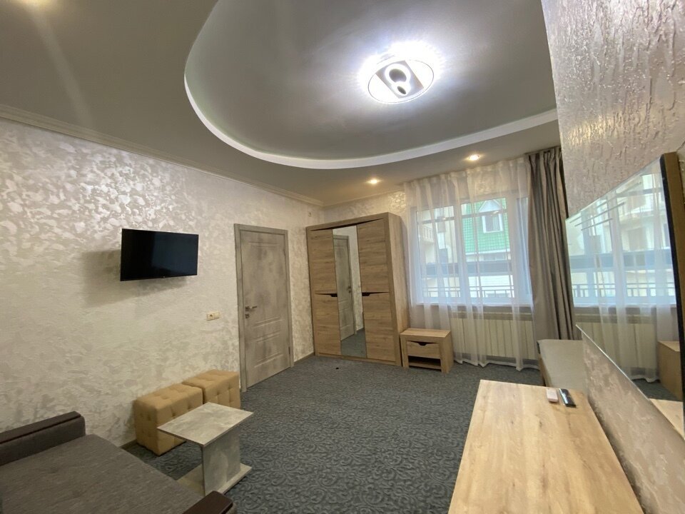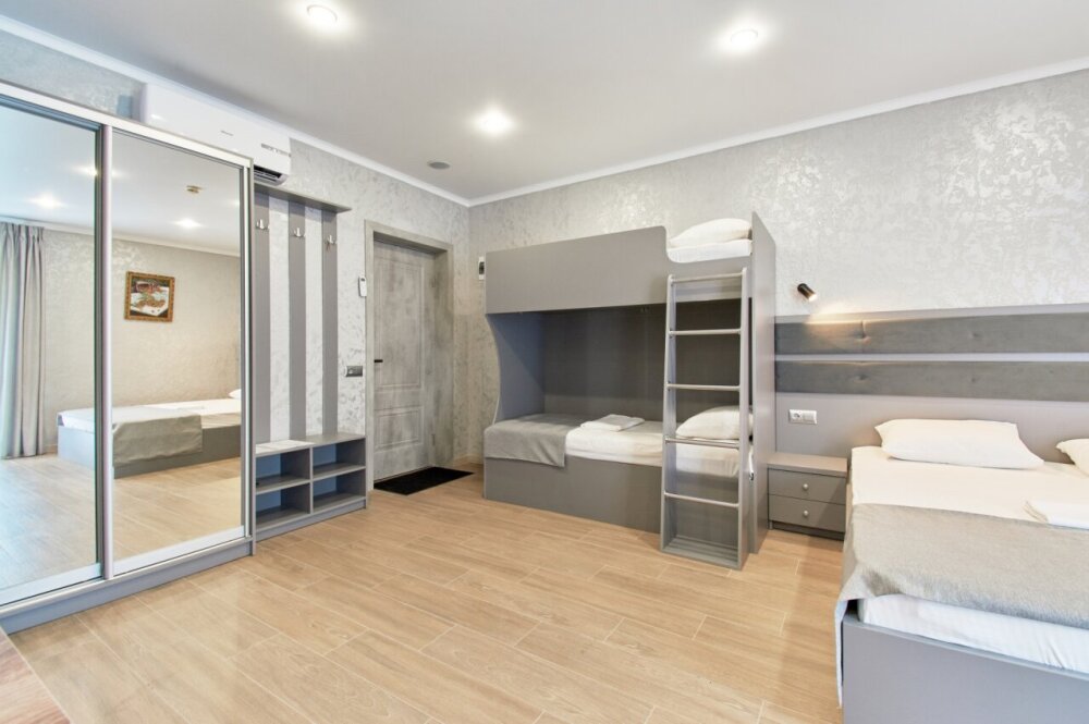 Четырёхместный номер рассчитан на 1-4 человека, дети от 0-6 лет размещаются бесплатно на имеющихся кроватях с родителями. В номере двуспальная кровать и двуспальный раскладной диван. В номере есть: кондиционер, холодильник, чайник, телевизор SMART, душ, туалет, постельное белье, полотенца, халаты и тапочки (в зимний период).