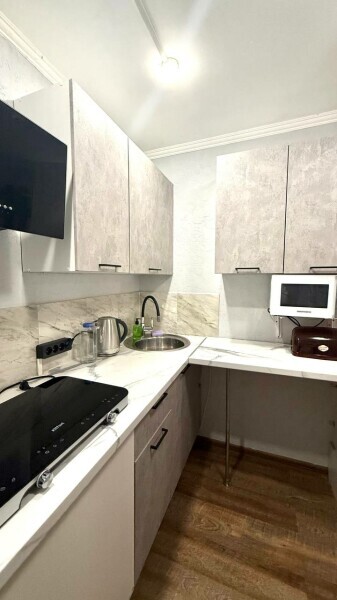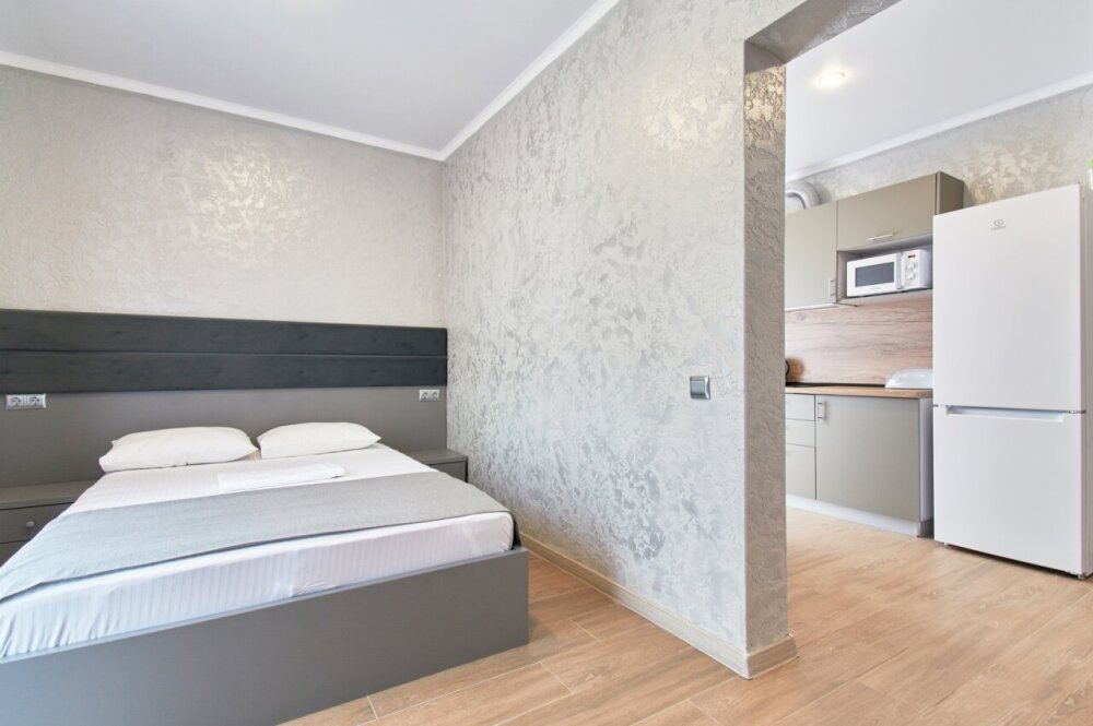 Двухместные апартаменты «Студио» с балконом и видом на горы. Апартаменты на 1-2 человека с двуспальной кроватью и кухней,дети от 0-6 лет размещаются бесплатно на имеющихся кроватях с родителями. В номере есть санузел с душем, телевизор SMART, кухня, посуда, холодильник, микроволновая печь, чайник, посуда, постельное бельё, халаты и тапочки (в зимний период).