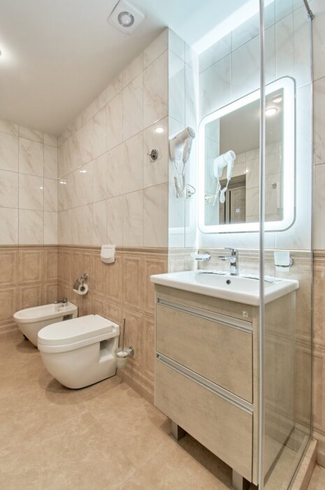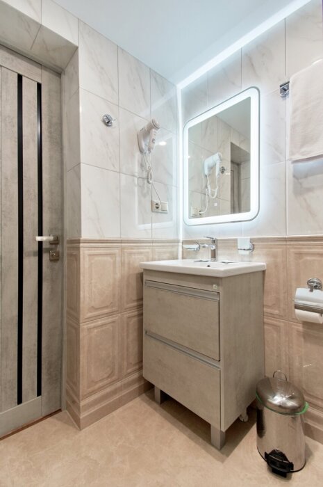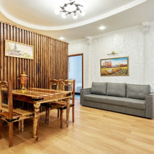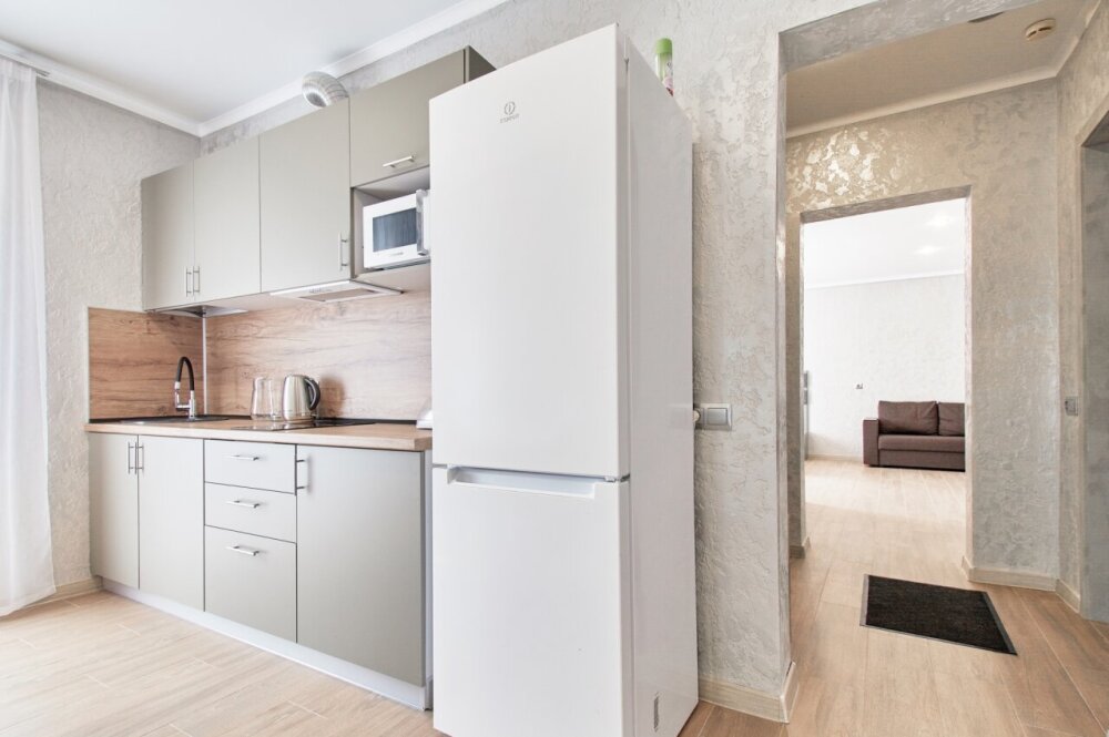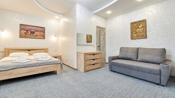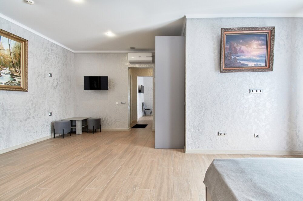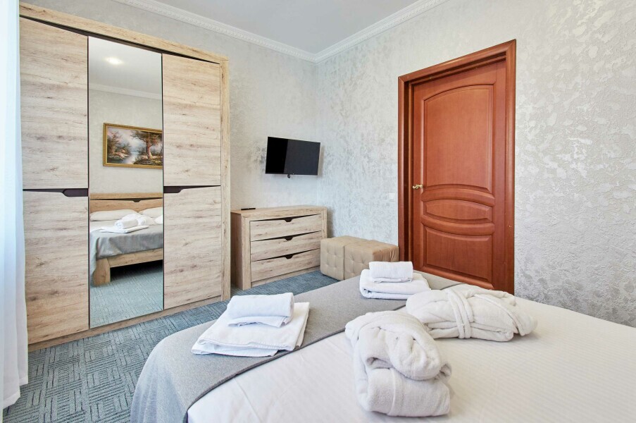 Двухкомнатные апартаменты на 1-6 человека с двуспальными кроватями и диваном-кроватью, дети от 0-6 лет размещаются бесплатно на имеющихся кроватях с родителями. В номере есть санузел с душем, телевизор SMART, кухня, посуда, холодильник, микроволновая печь, чайник, посуда, постельное бельё, халаты и тапочки (в зимний период).