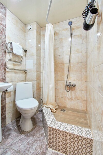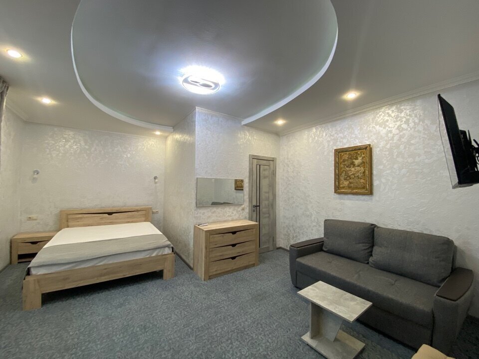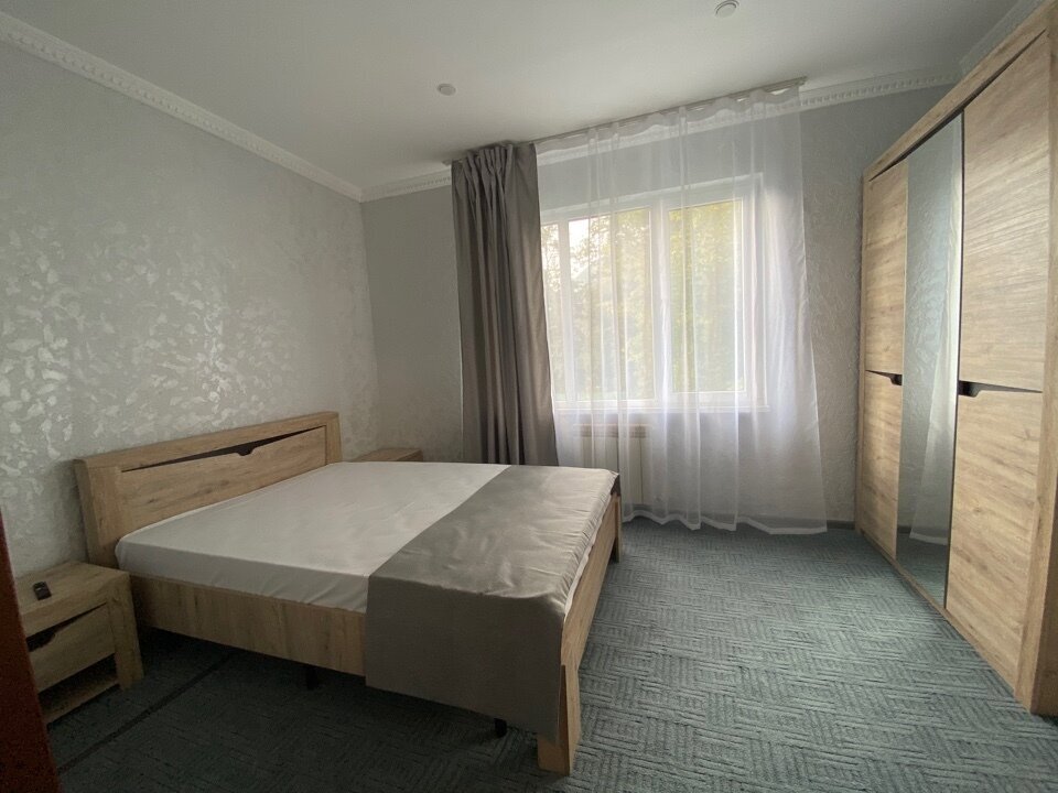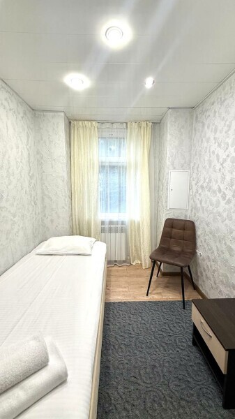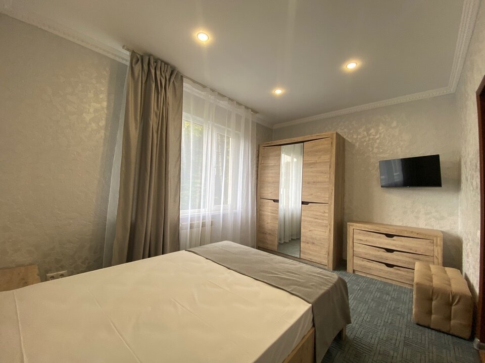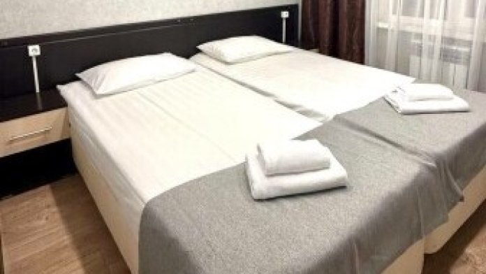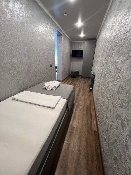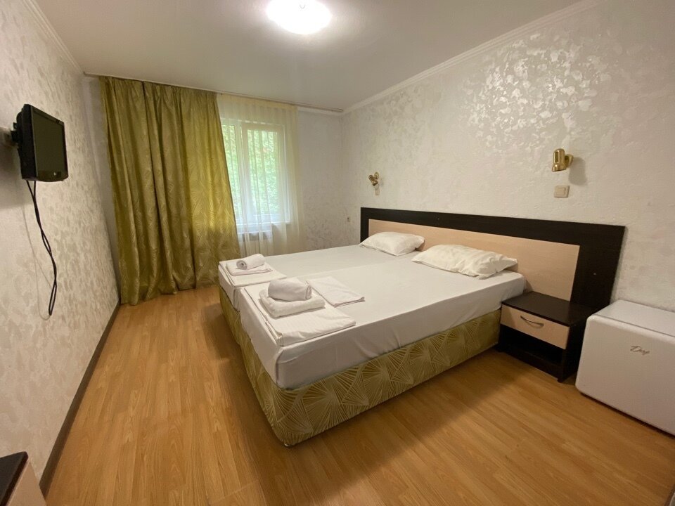 Номер «Эконом» на 1-2 человека с двуспальной кроватью. В номере есть санузел с душем, телевизор, холодильник, чайник, постельное белье.
