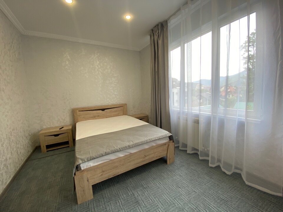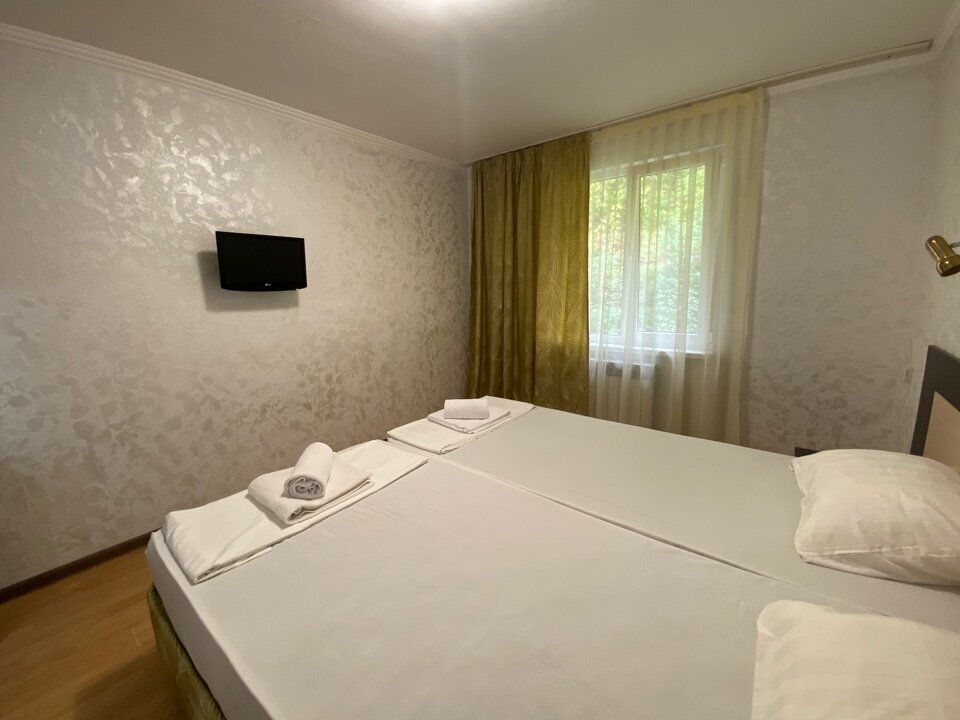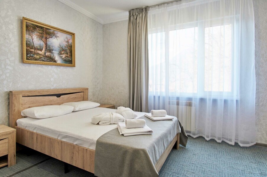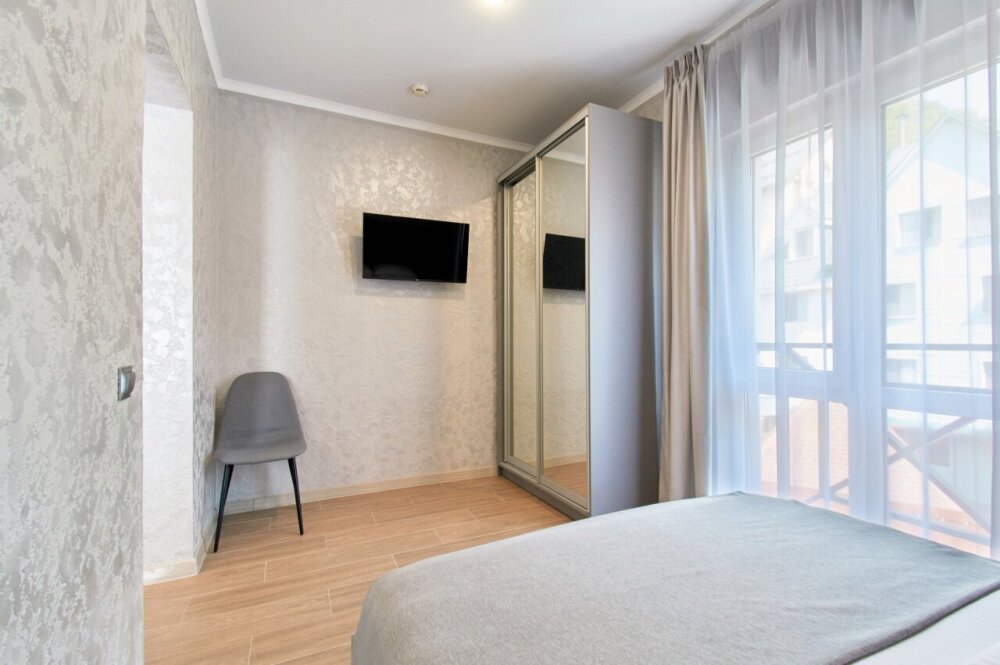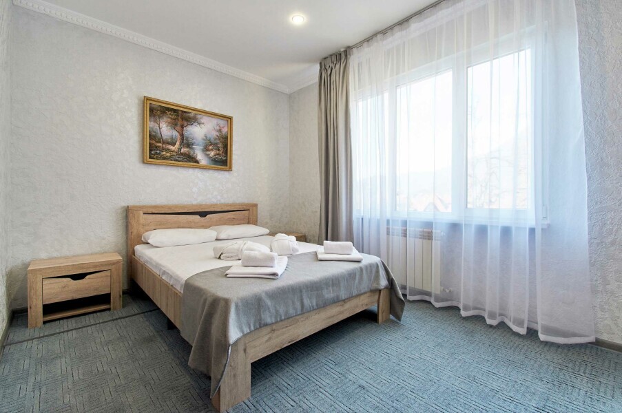 Двухкомнатные трехместные апартаменты с видом на горы на 1-3 человека с двуспальной и одной односпальной кроватью, дети от 0-6 лет размещаются бесплатно на имеющихся кроватях с родителями. В номере есть санузел с душем, телевизор SMART, кухня, посуда, холодильник, микроволновая печь, чайник, посуда, постельное бельё, халаты и тапочки (в зимний период).
