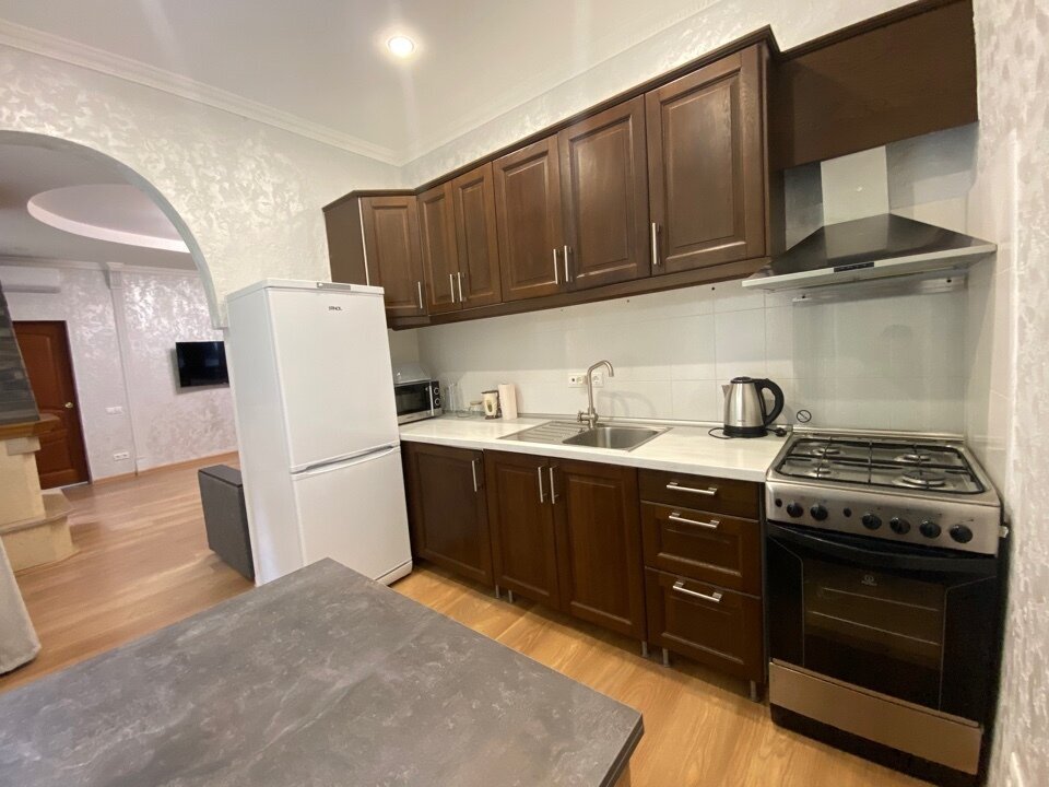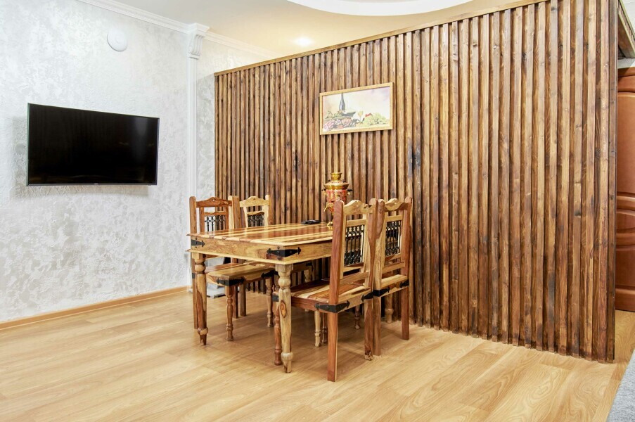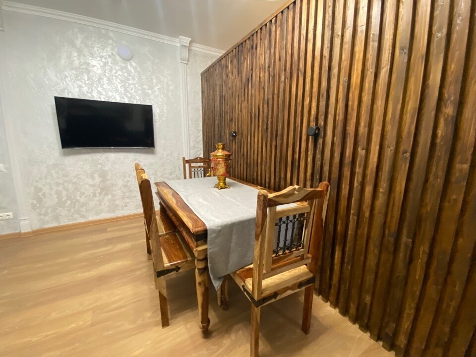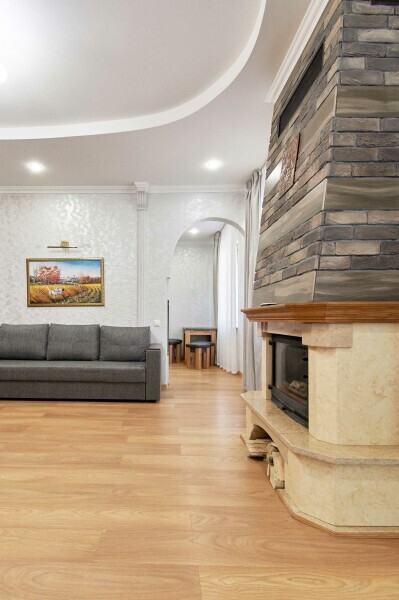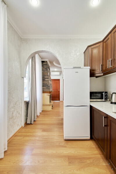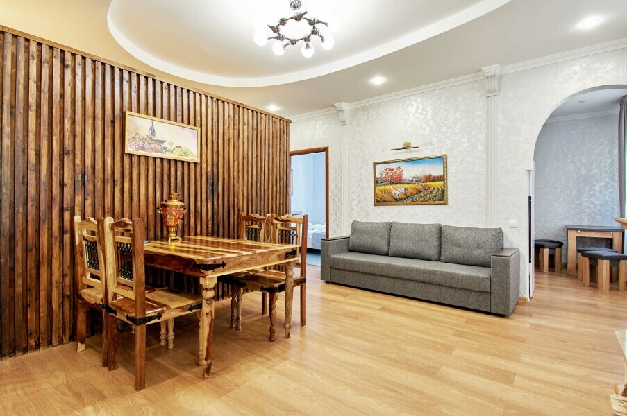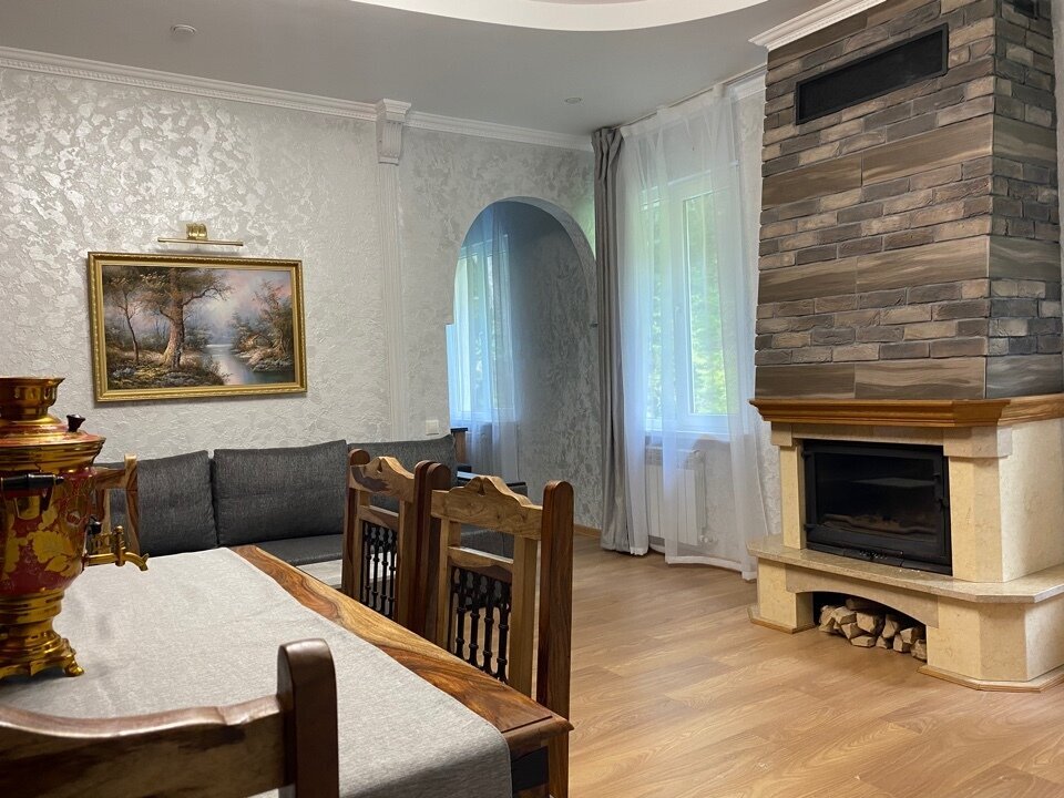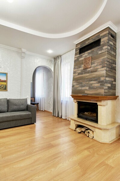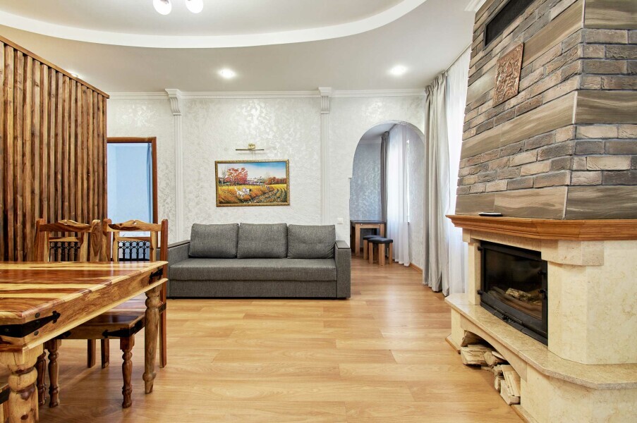 Двухкомнатная квартира с кухней и камином на 1-4 гостя, дети от 0-6 лет размещаются бесплатно на имеющихся кроватях с родителями. В квартире своя оборудованная кухня со всем необходимым для приготовления пищи. В квартире изолированная спальня с двуспальной кроватью, в зале раскладной двуспальный диван. В номере есть санузел с душем, телевизор SMART, кухня, посуда, холодильник, микроволновая печь, чайник, посуда, постельное бельё, халаты и тапочки (в зимний период).