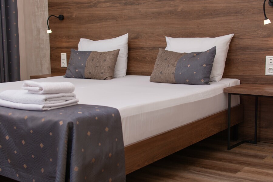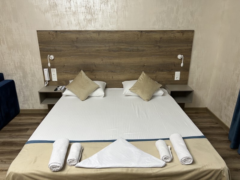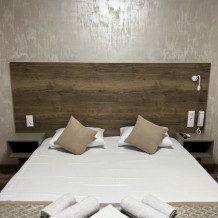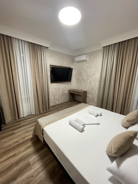 Чистый уютный номер с двуспальной кроватью и видом на море, в котором есть все необходимое: WIFI, кондиционер, телевизор, холодильник с мини-баром, рабочее место, С/У, а так же телефон для связи с ресепшеном 24/7.