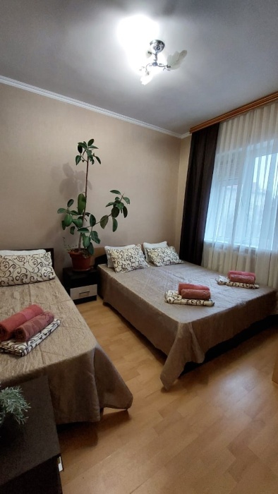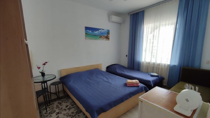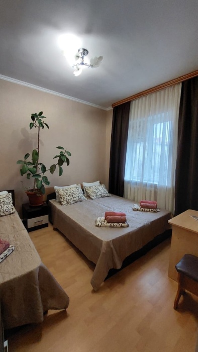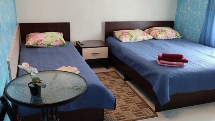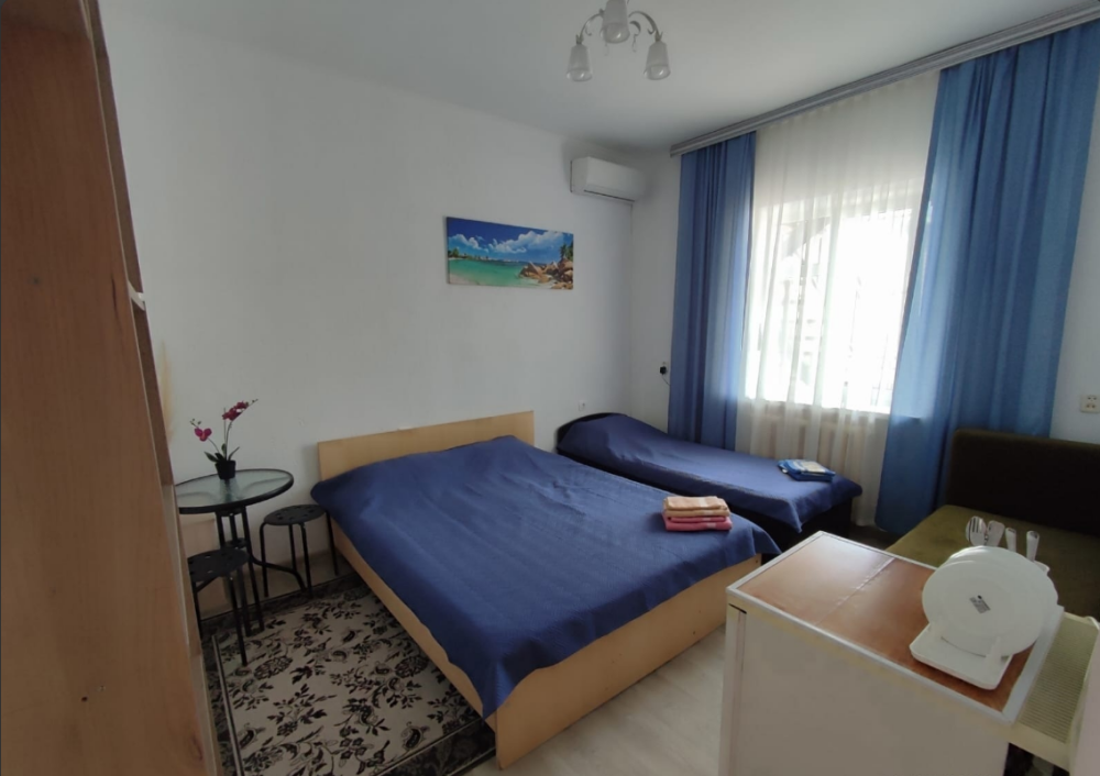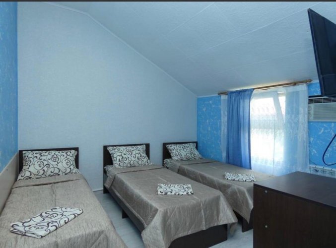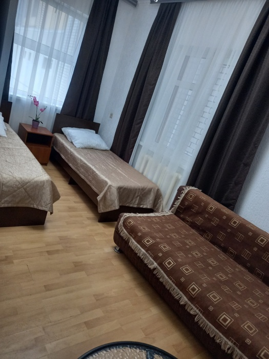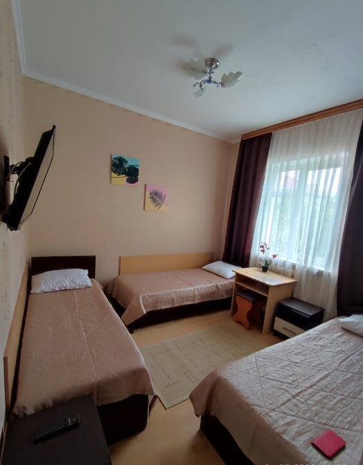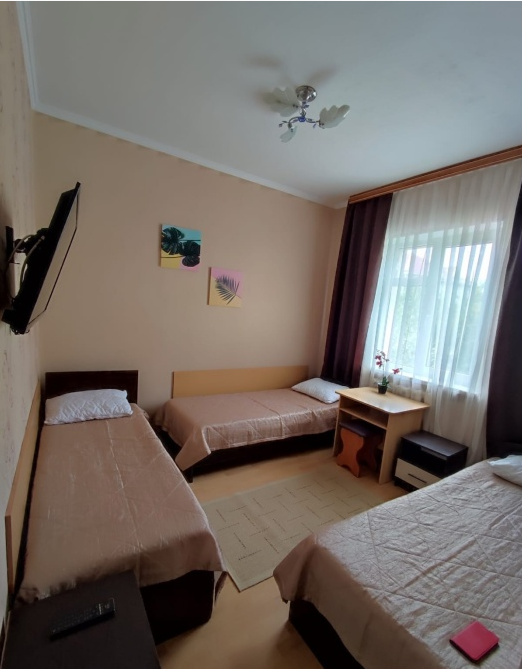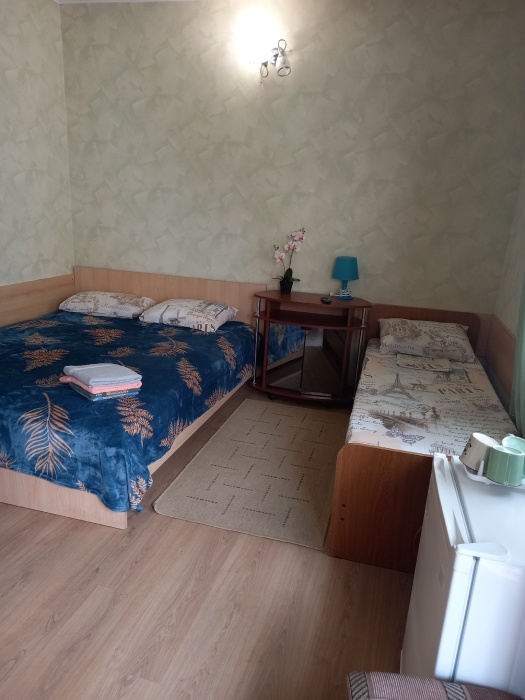 В номере одна двухспальная кровать и две односпальные (либо двухъярусная кровать, либо софа-кровать, уточняйте).