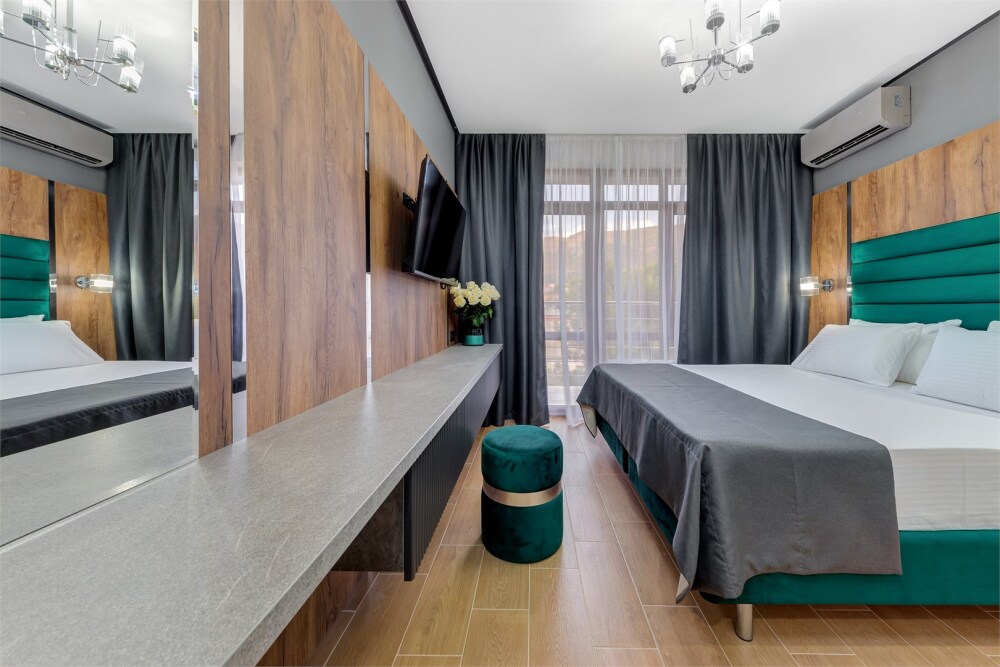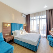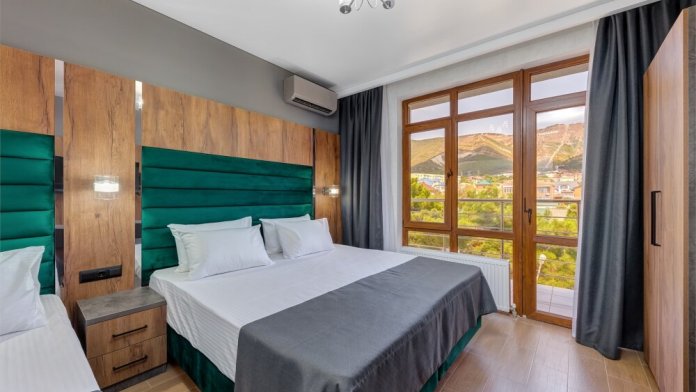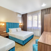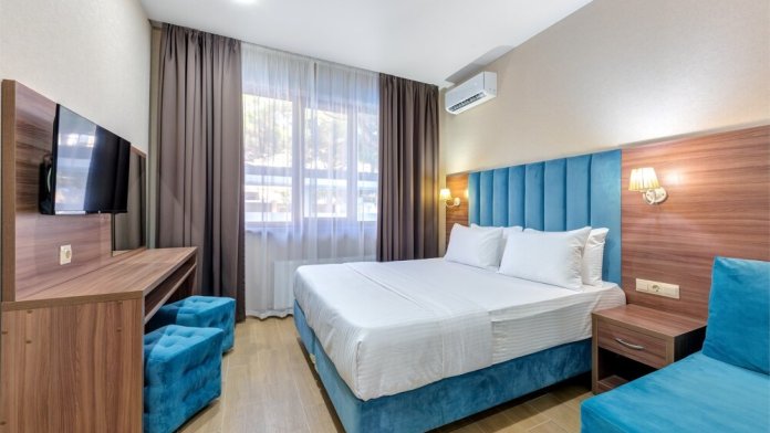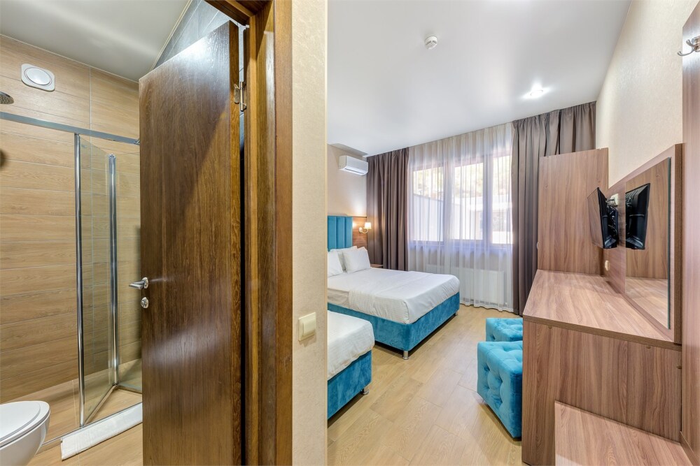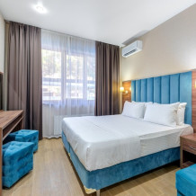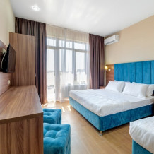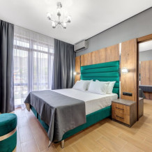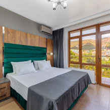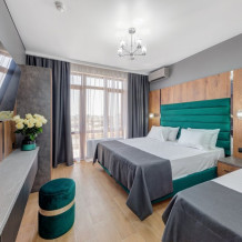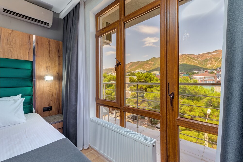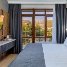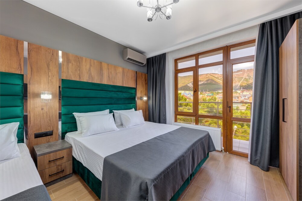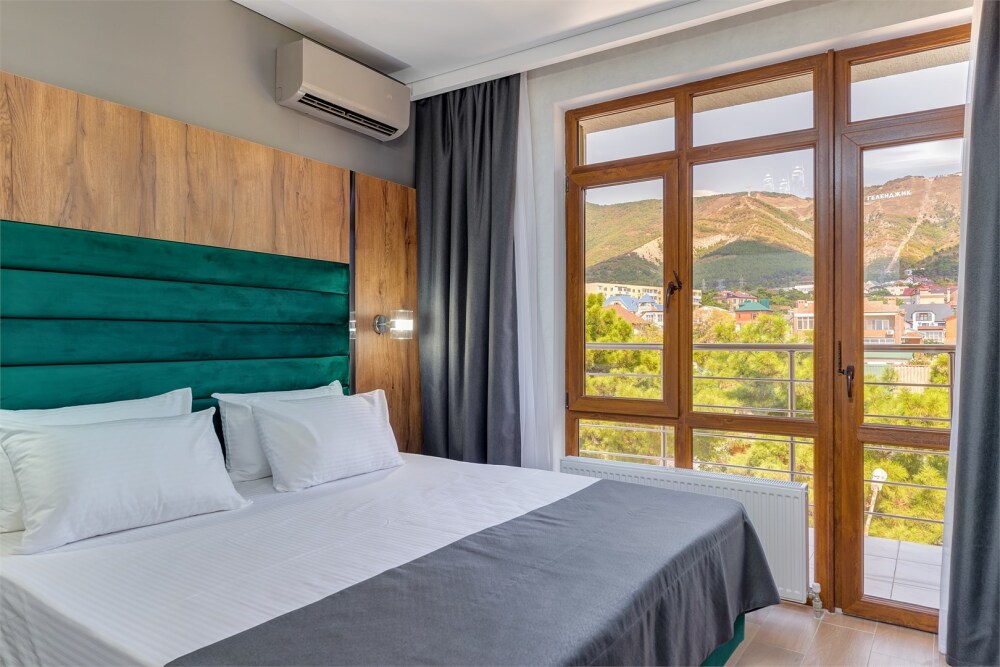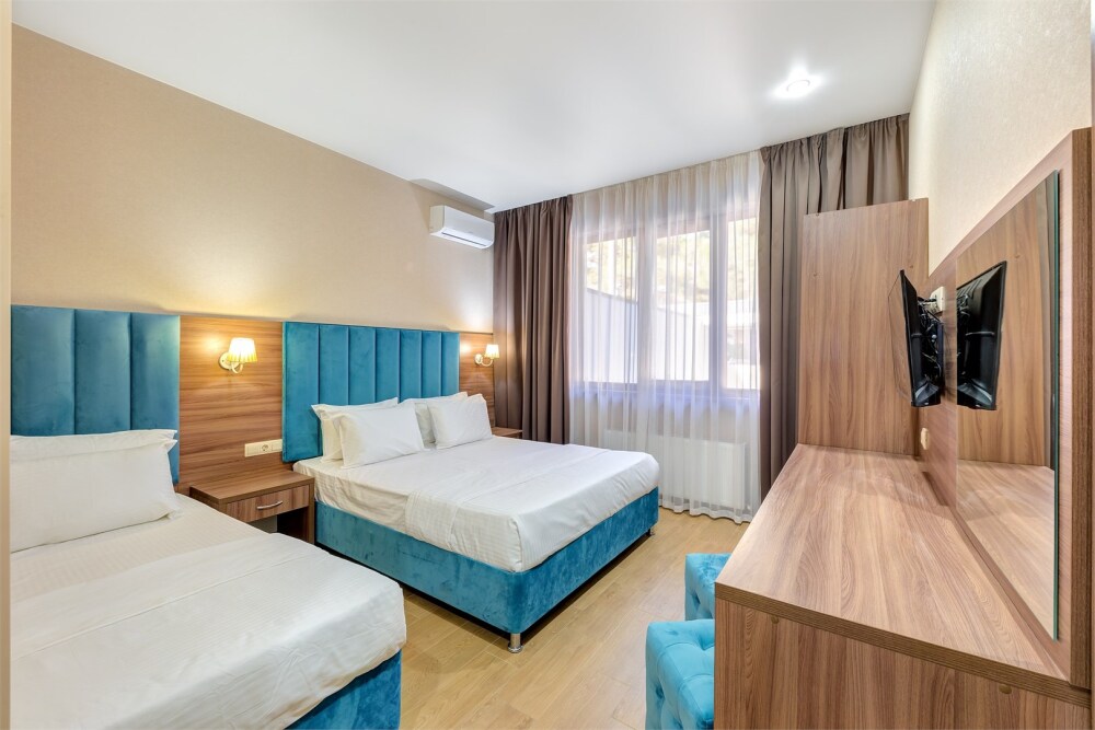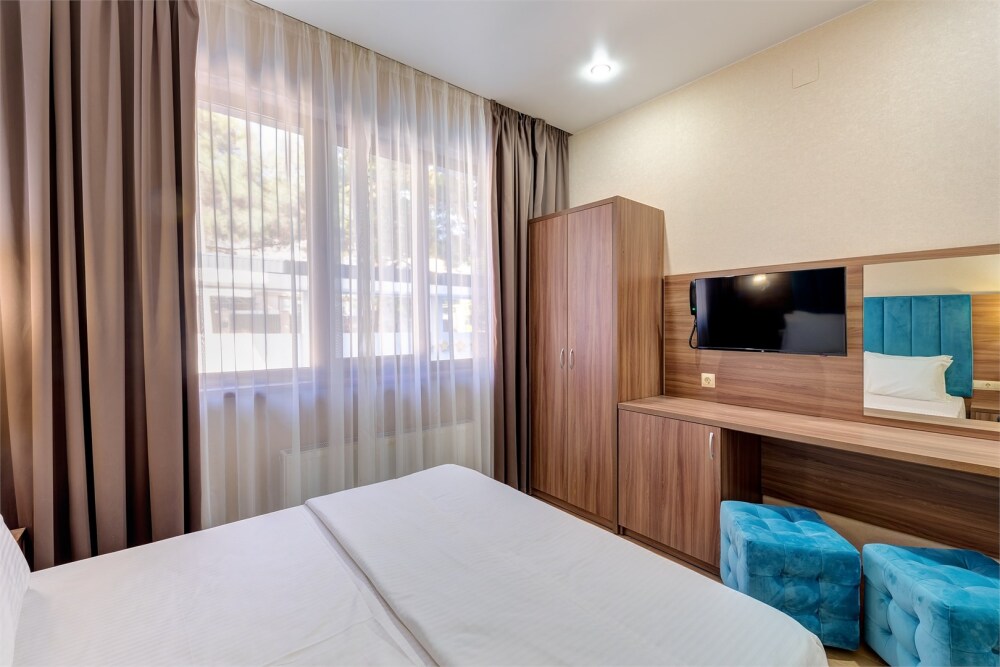 Для семьи из 4-х человек номера можно объединить между собой открыв двери между комнатами и получить 2-комнатный люкс с двумя балконами, с которых открывается чудесный вид на горы и город. Номер оснащен современной мебелью и техникой для комфортного проживания наших гостей.