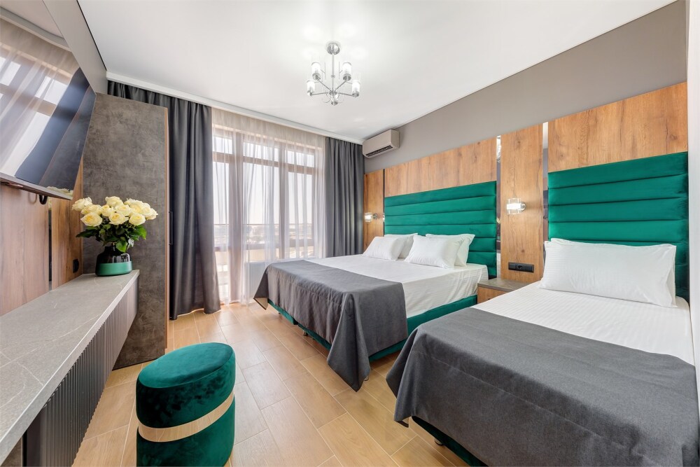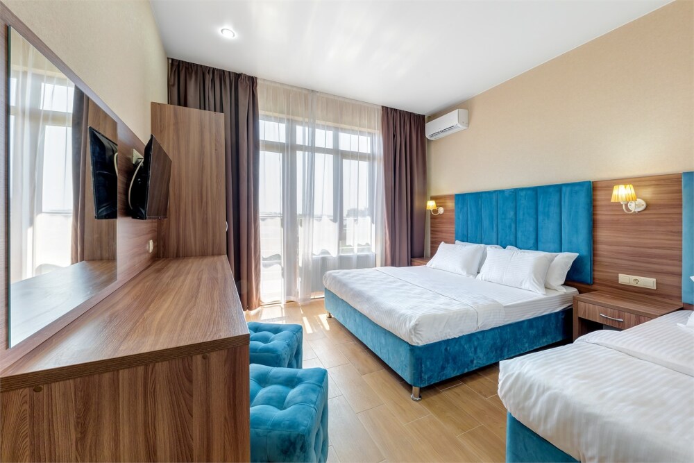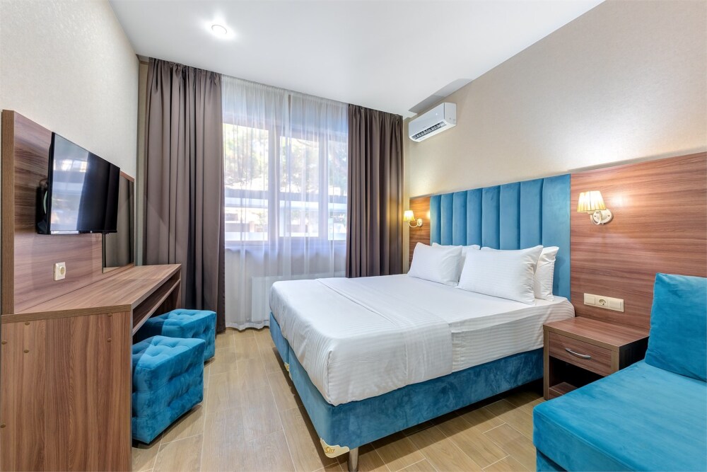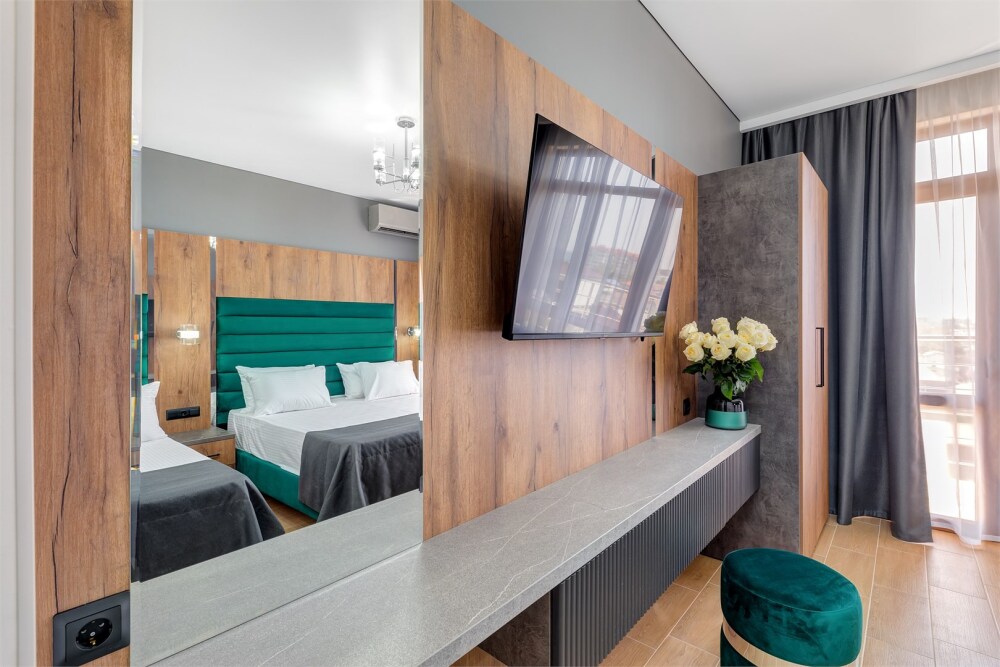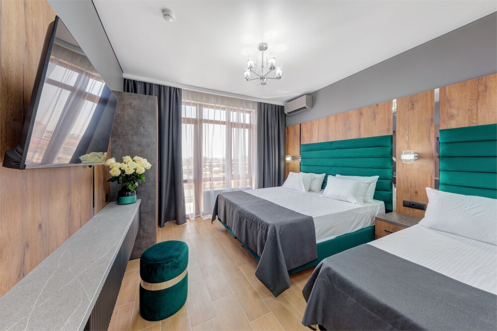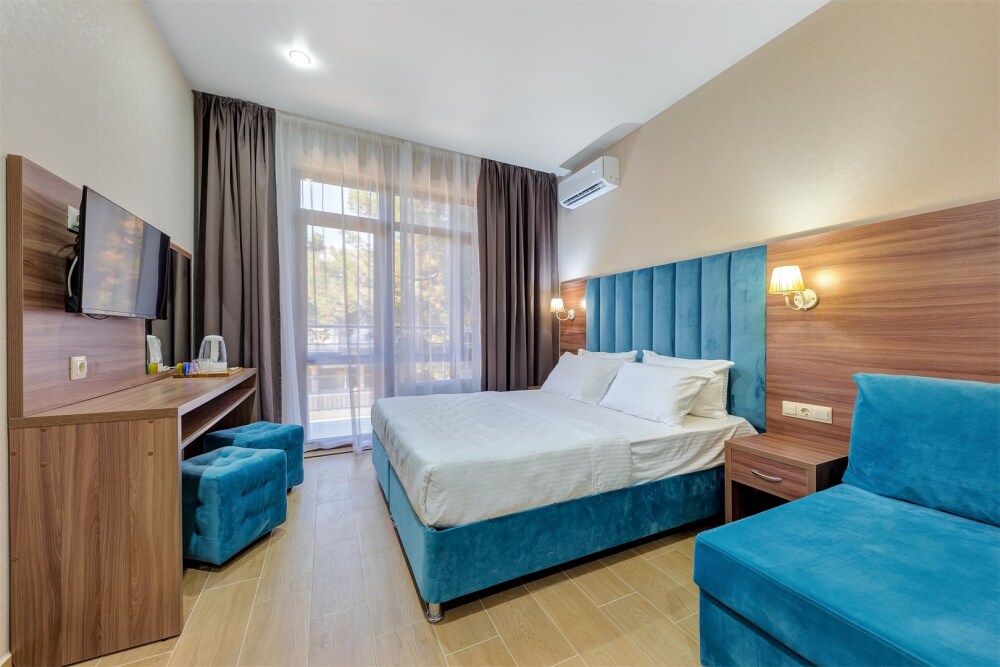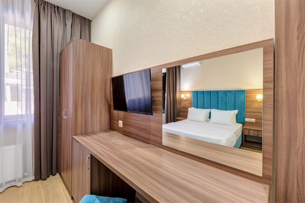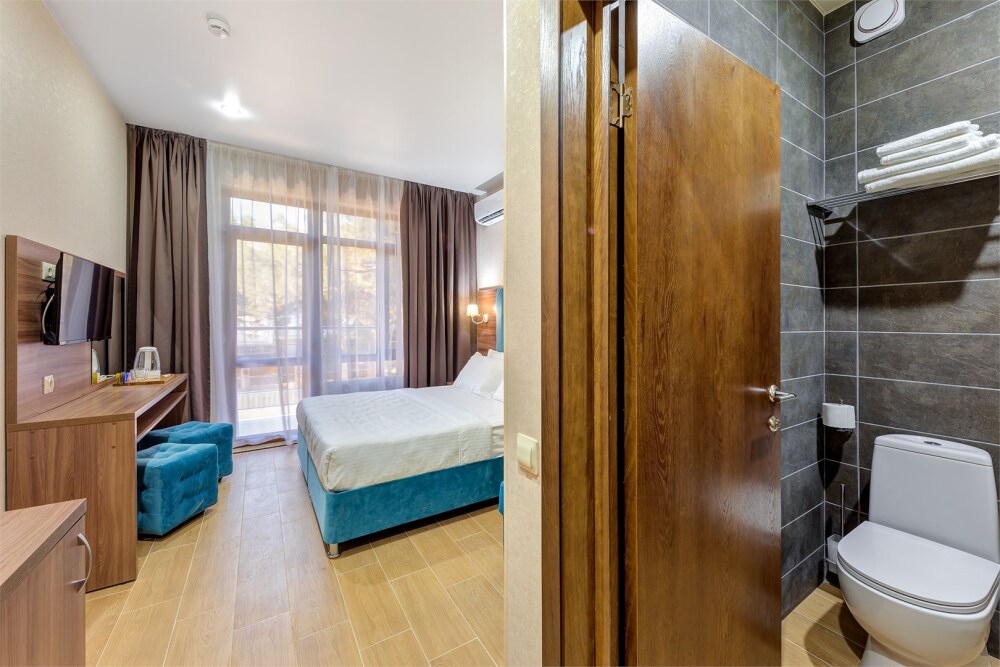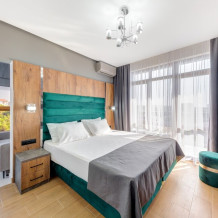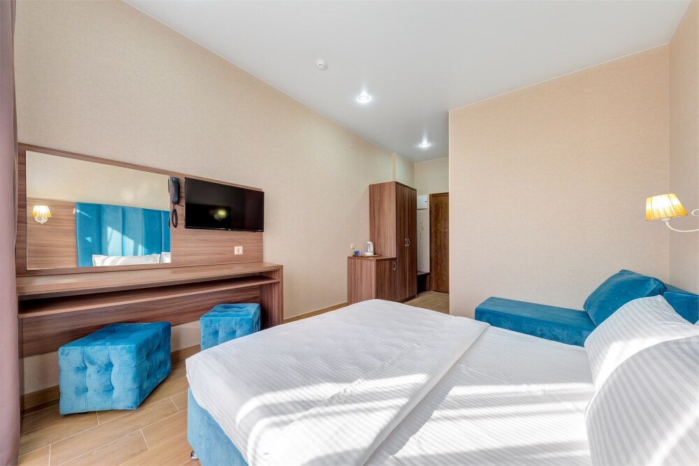 Для семьи из 4-х человек номера можно объединить между собой открыв двери между комнатами и получить 2-комнатный люкс с двумя балконами, с которых открывается чудесный вид на горы и город. Номер оснащен современной мебелью и техникой для комфортного проживания наших гостей.