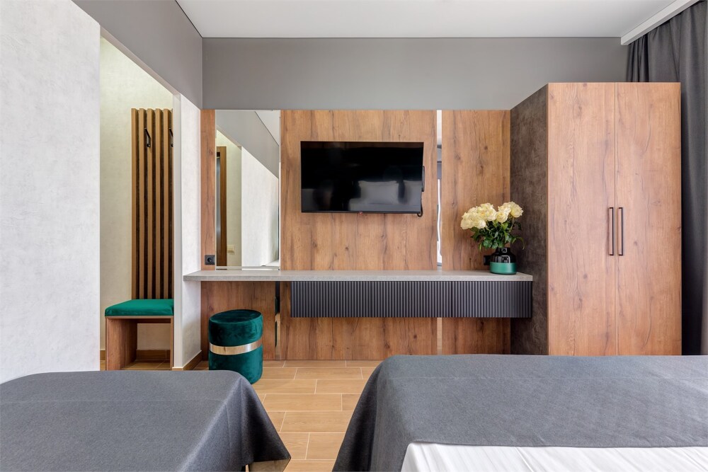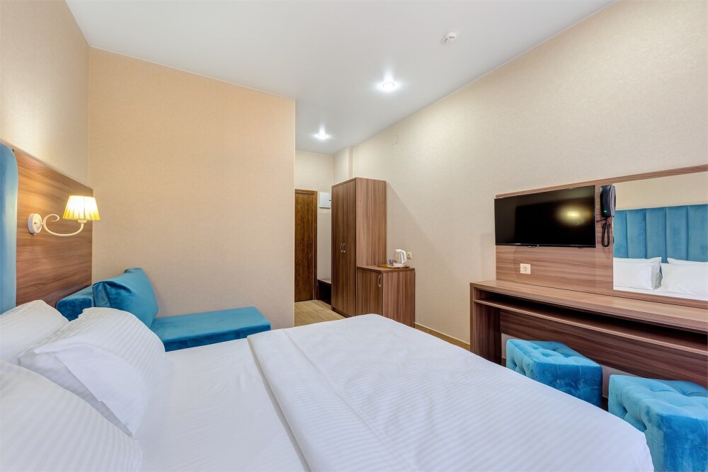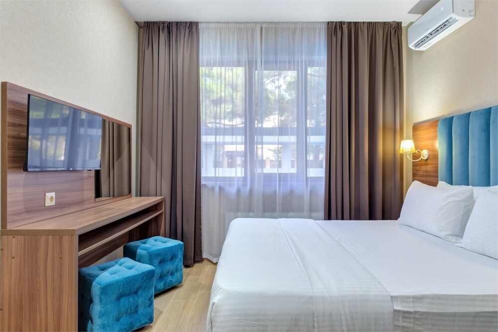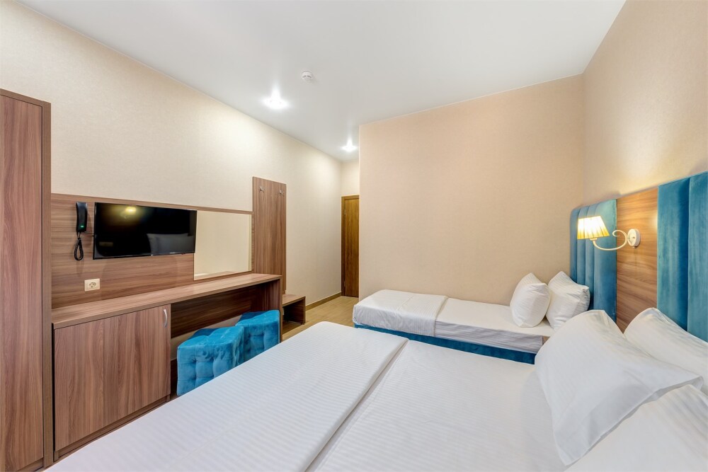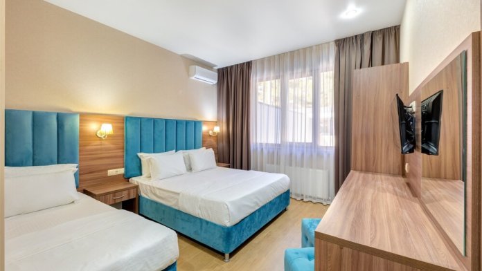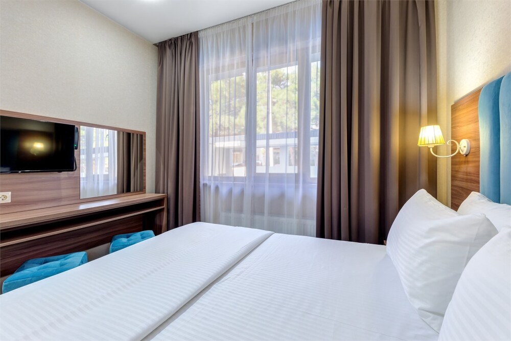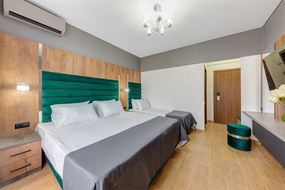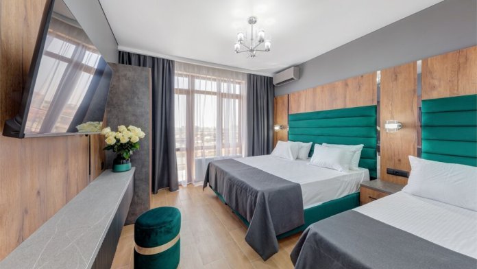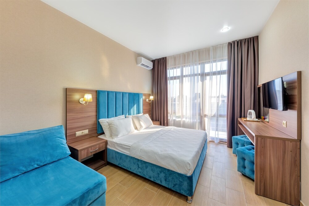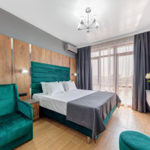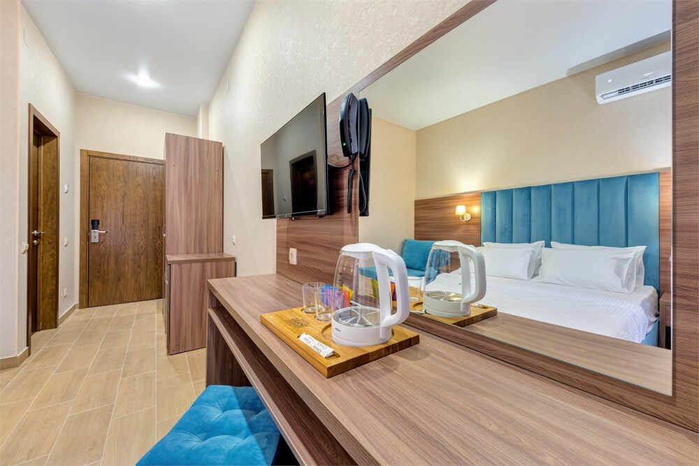 Для семьи из 4-х человек номера можно объединить между собой открыв двери между комнатами и получить 2-комнатный люкс с двумя балконами, с которых открывается чудесный вид на горы и город. Номер оснащен современной мебелью и техникой для комфортного проживания наших гостей.