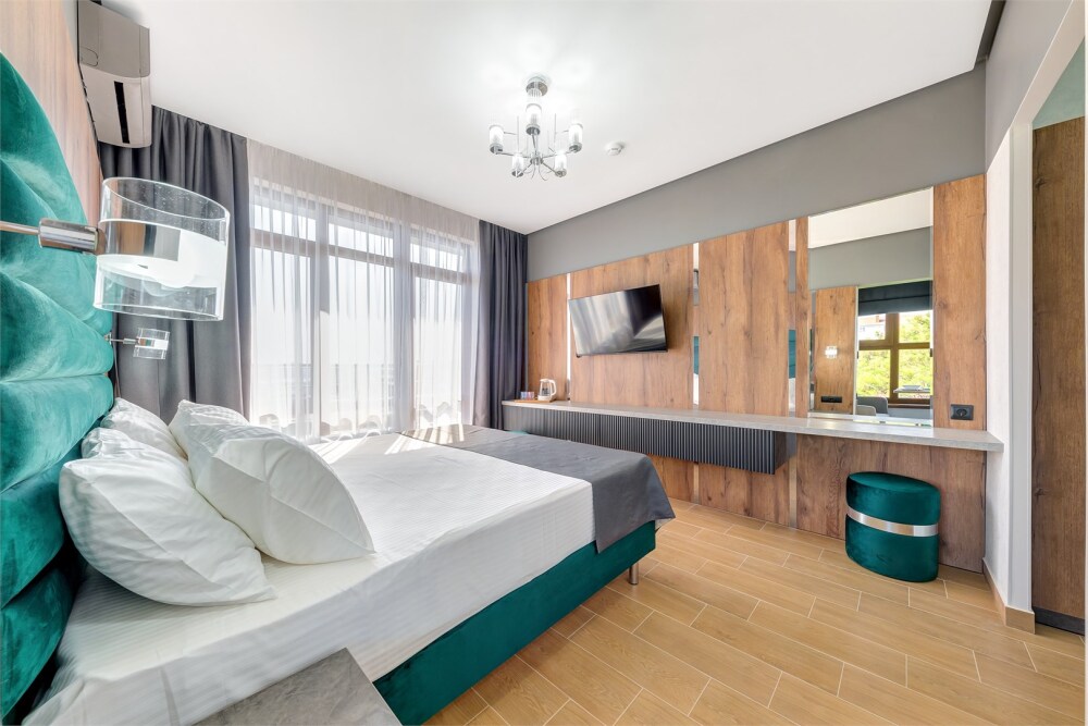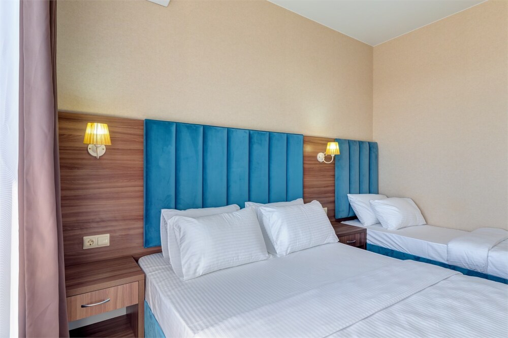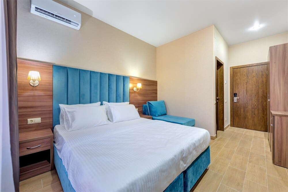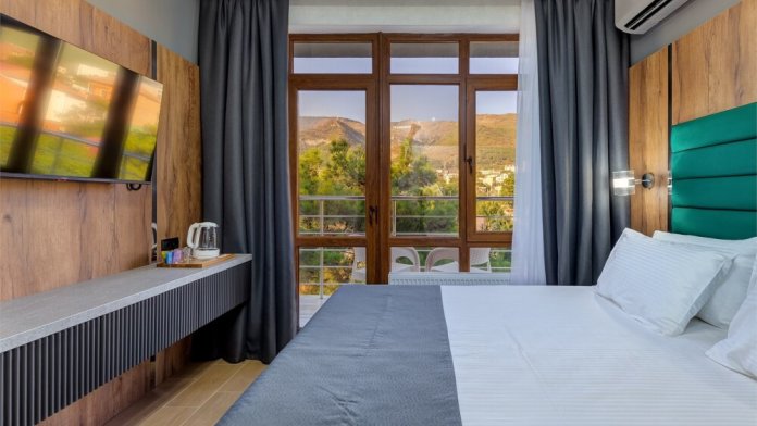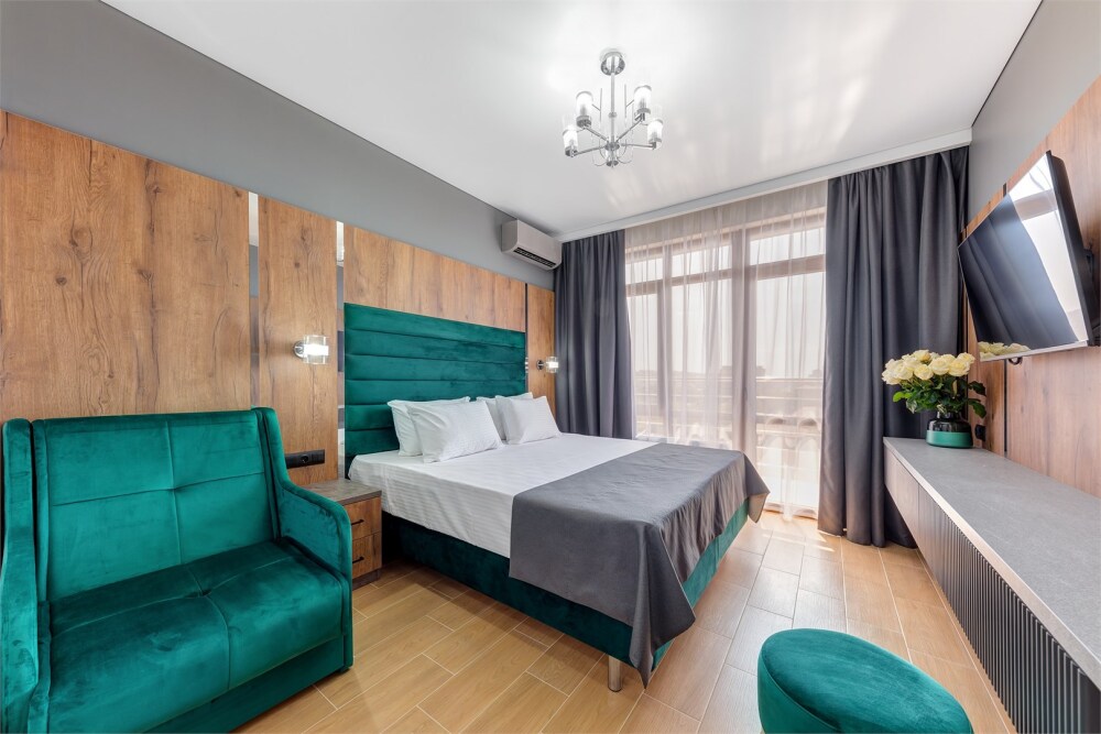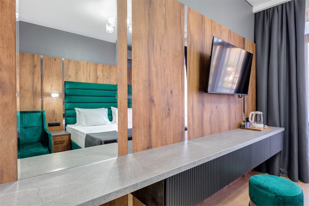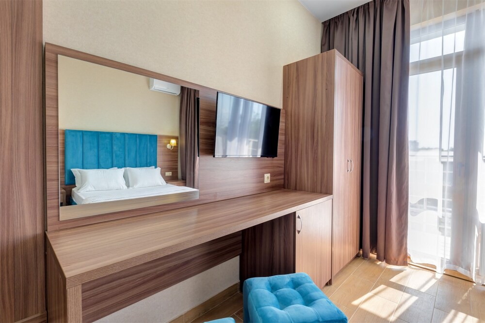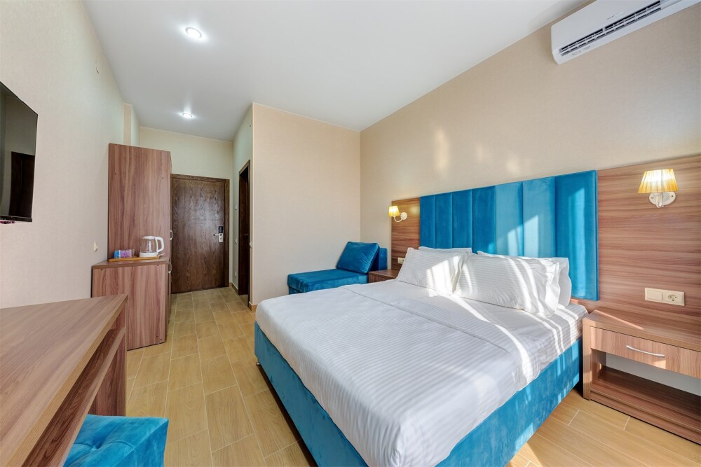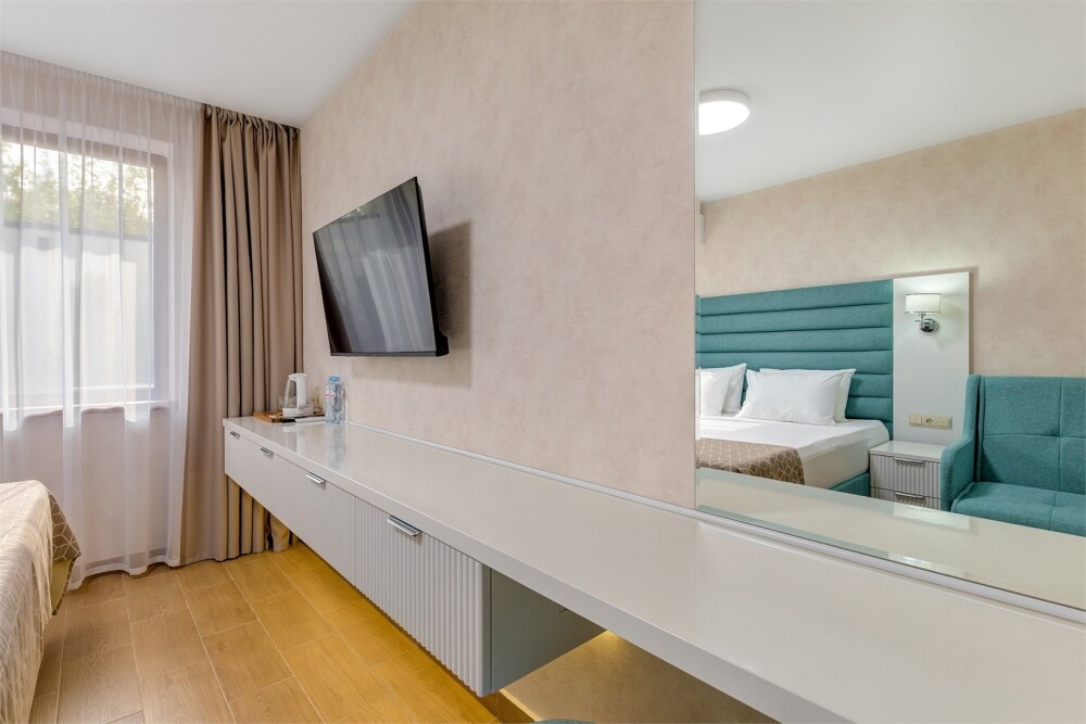 Для семьи из 4-х человек номера можно объединить между собой открыв двери между комнатами и получить 2-комнатный люкс с двумя балконами, с которых открывается чудесный вид на горы и город. Номер оснащен современной мебелью и техникой для комфортного проживания наших гостей.