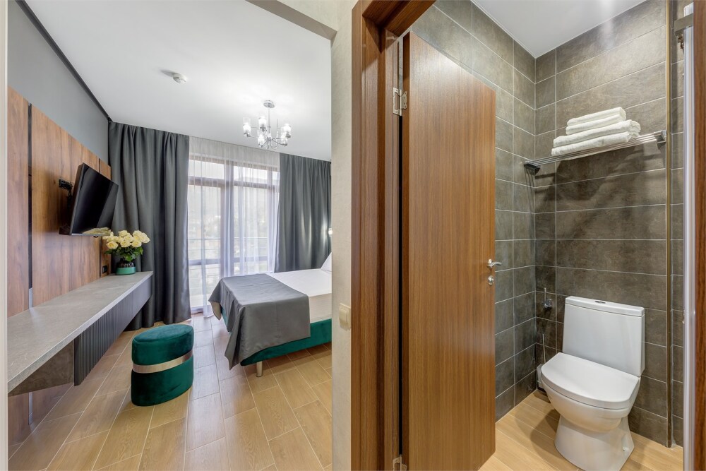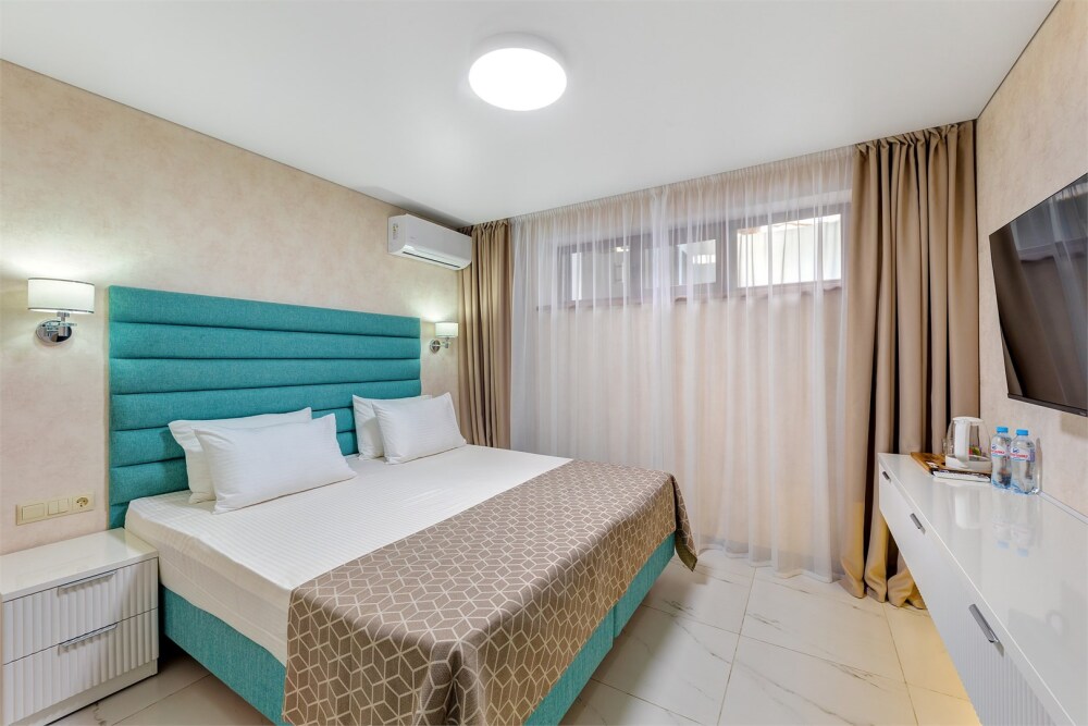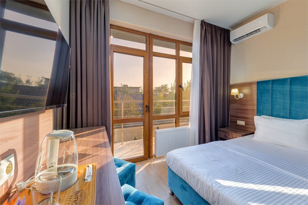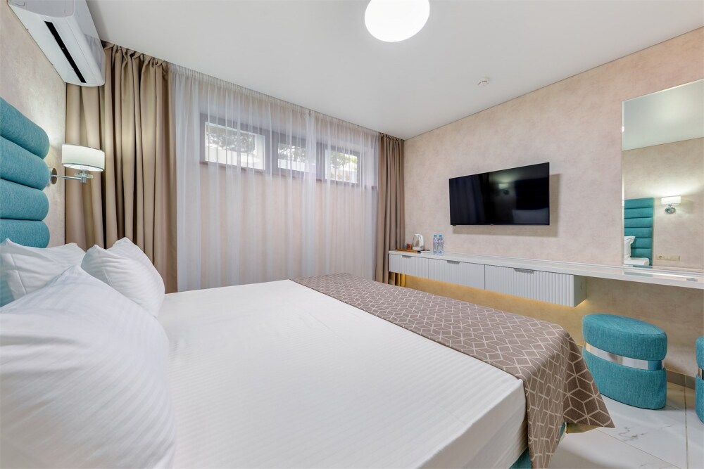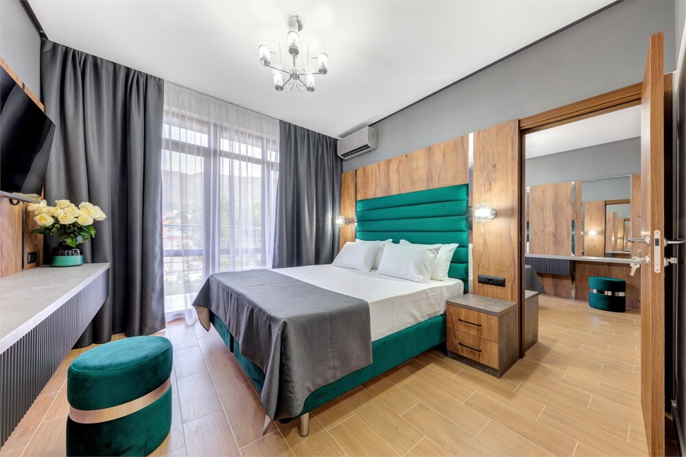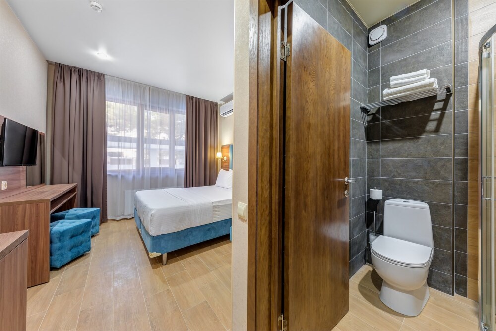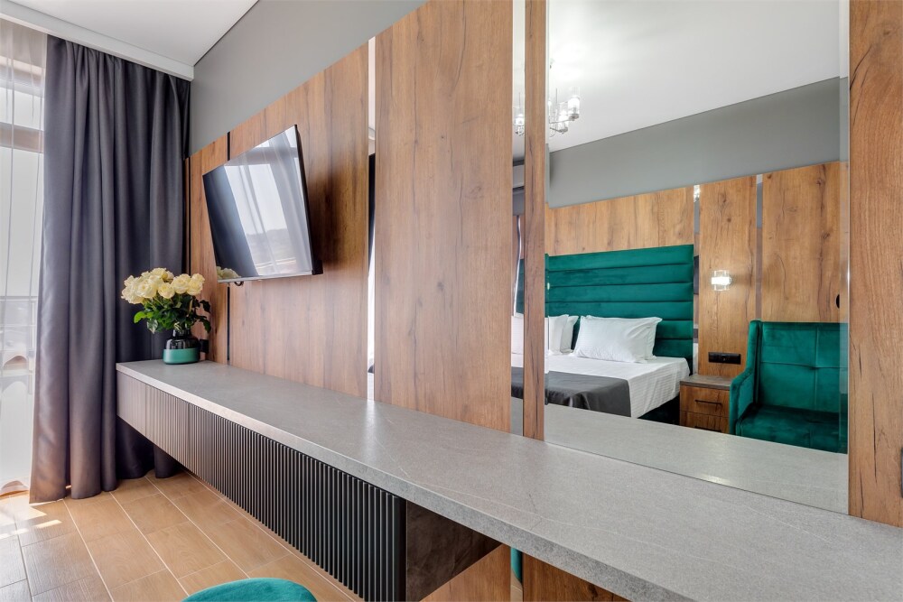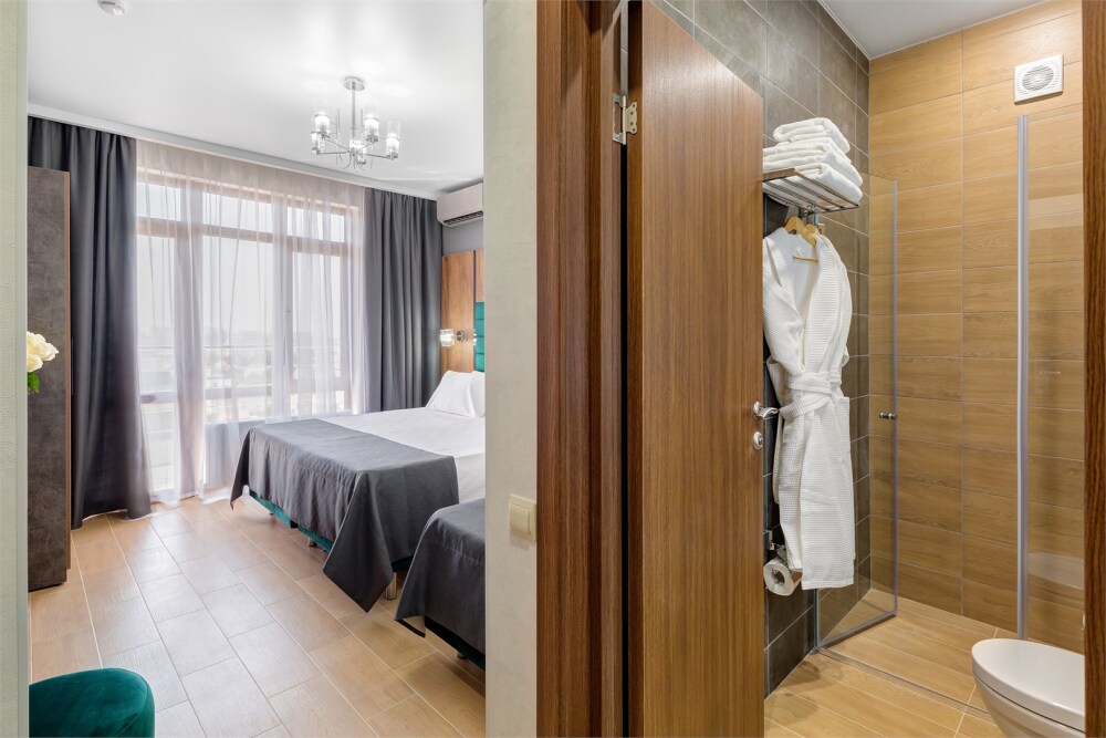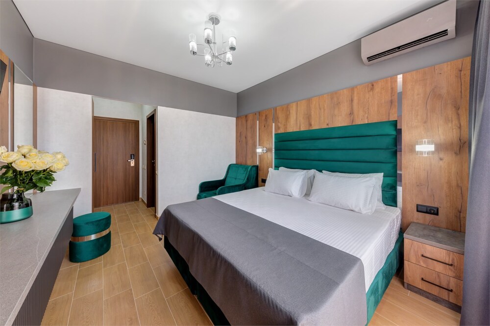 Для семьи из 4-х человек номера можно объединить между собой открыв двери между комнатами и получить 2-комнатный люкс с двумя балконами, с которых открывается чудесный вид на горы и город. Номер оснащен современной мебелью и техникой для комфортного проживания наших гостей.
