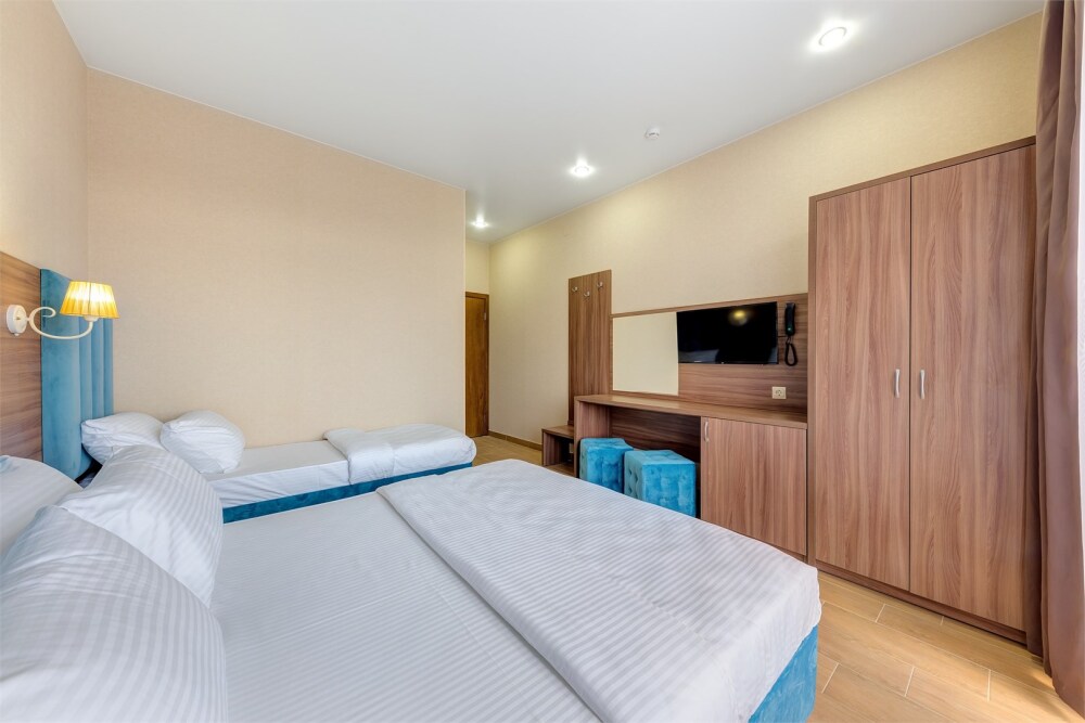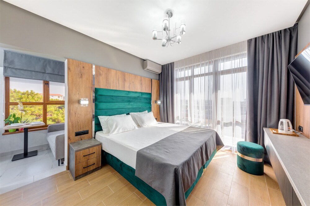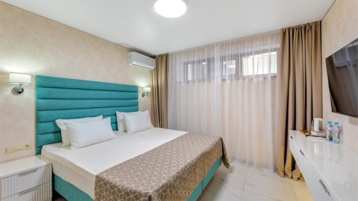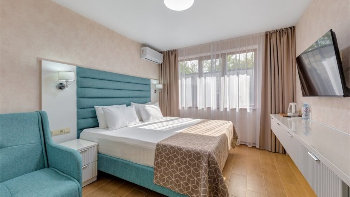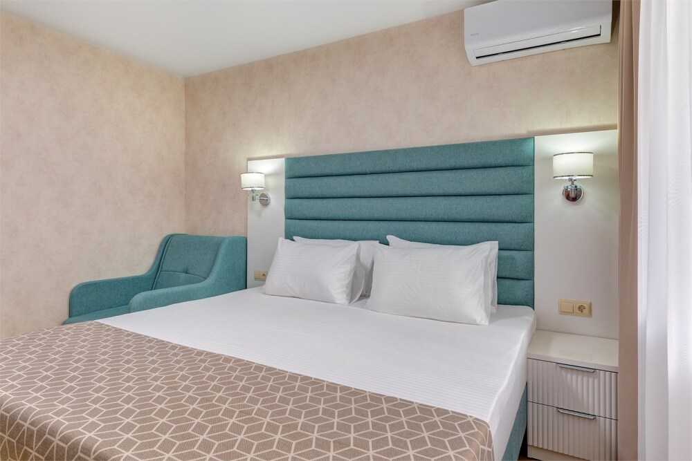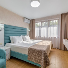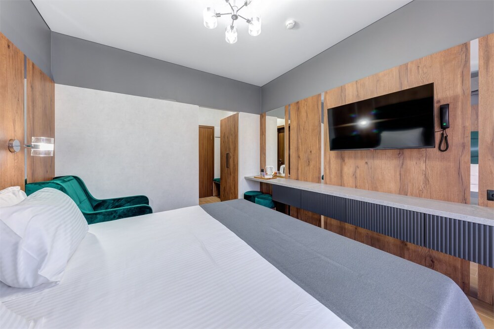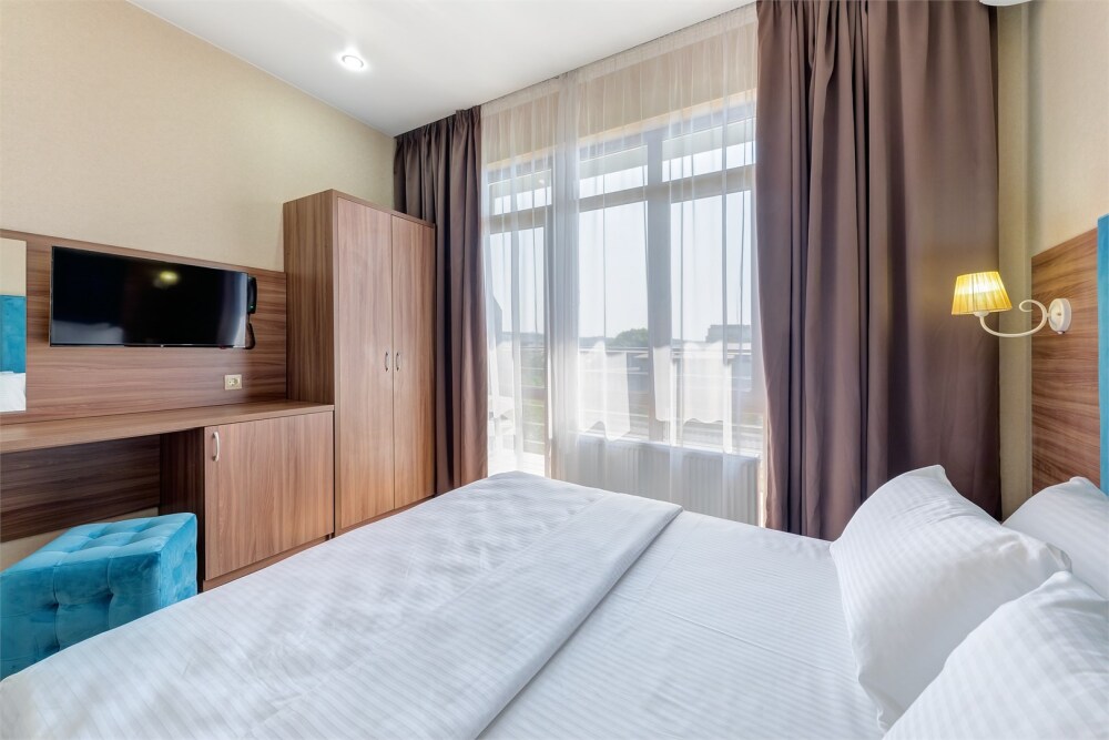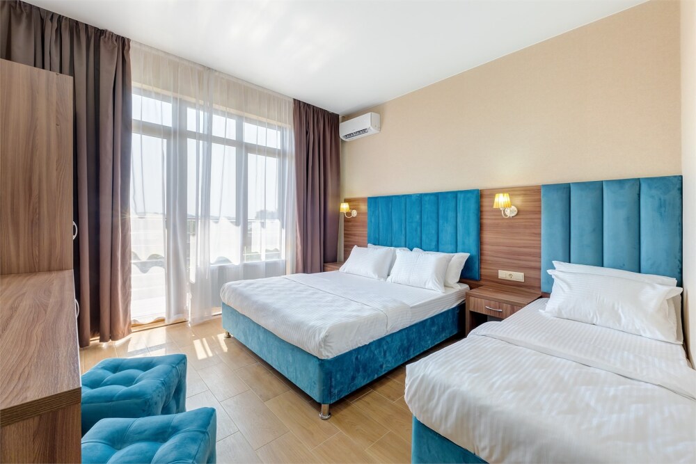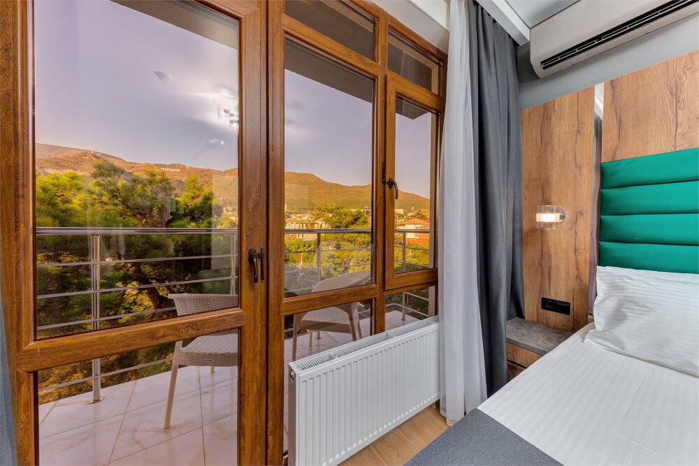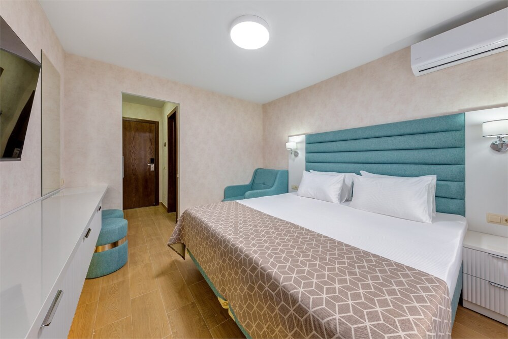 Для семьи из 4-х человек номера можно объединить между собой открыв двери между комнатами и получить 2-комнатный люкс с двумя балконами, с которых открывается чудесный вид на горы и город. Номер оснащен современной мебелью и техникой для комфортного проживания наших гостей.