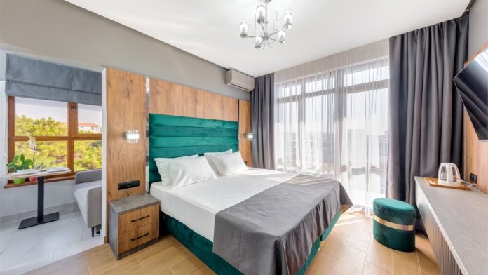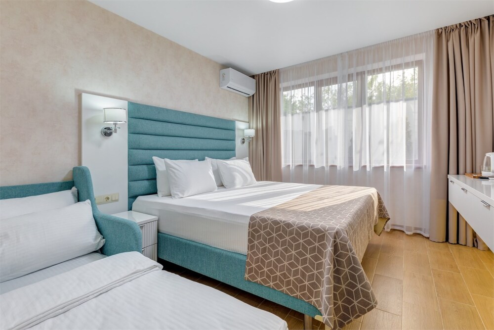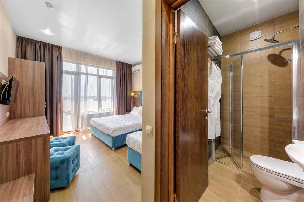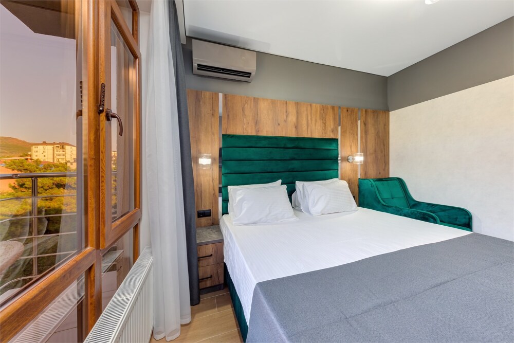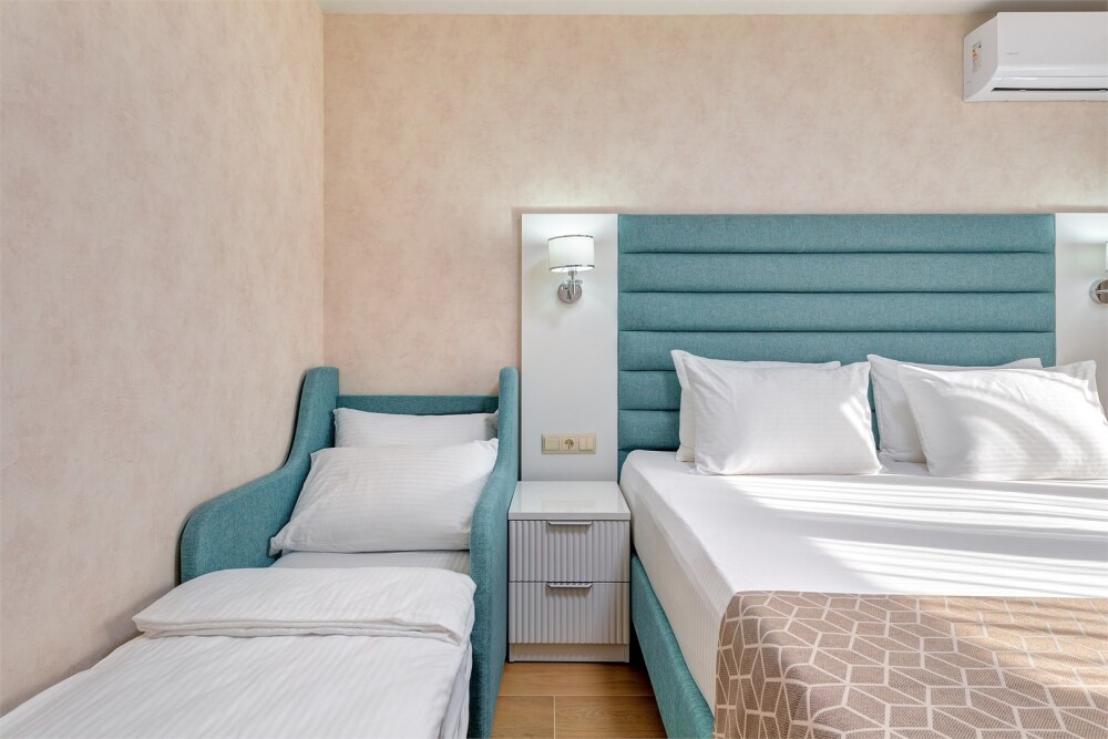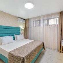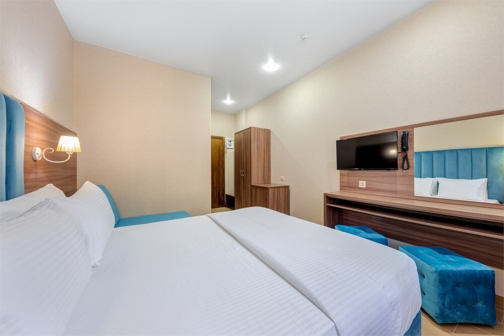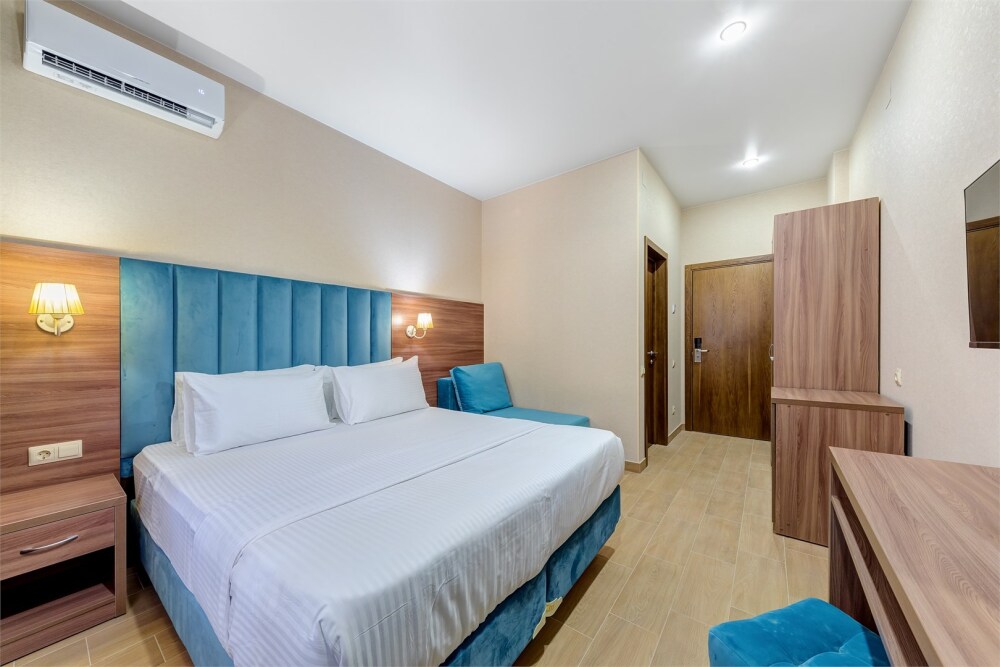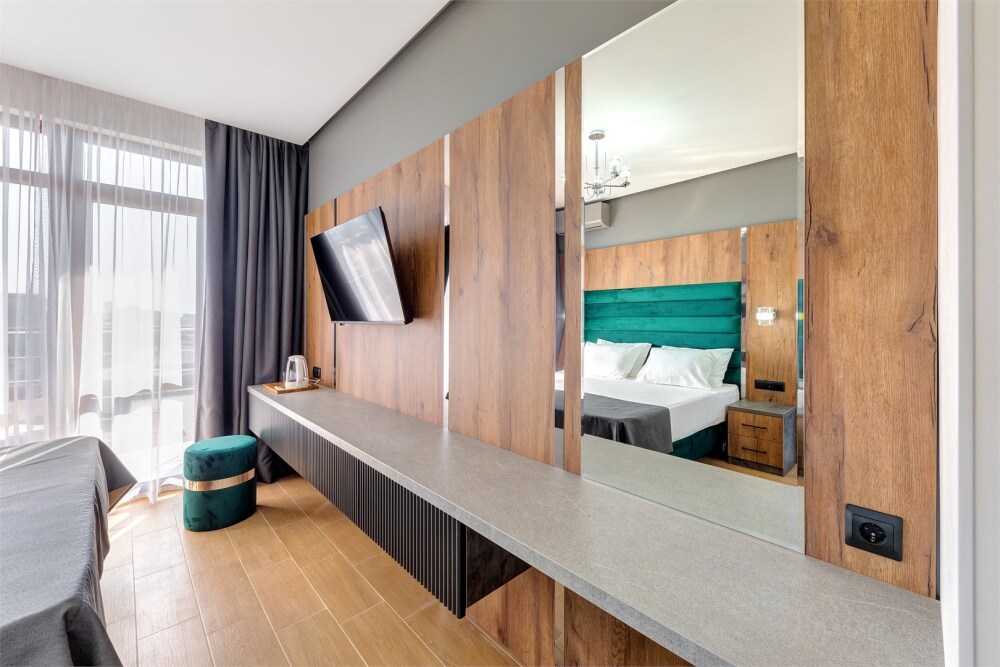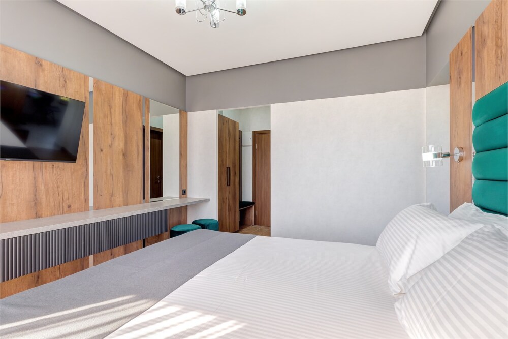 Для семьи из 4-х человек номера можно объединить между собой открыв двери между комнатами и получить 2-комнатный люкс с двумя балконами, с которых открывается чудесный вид на горы и город. Номер оснащен современной мебелью и техникой для комфортного проживания наших гостей.