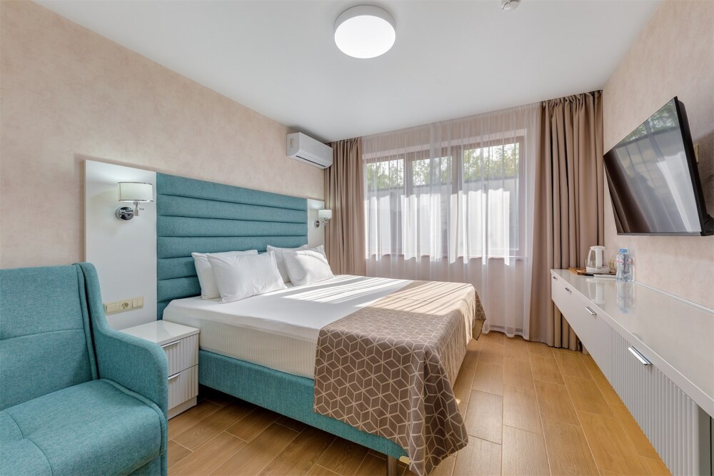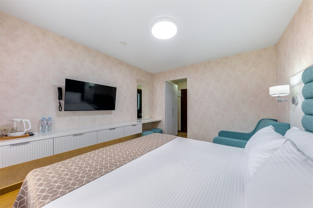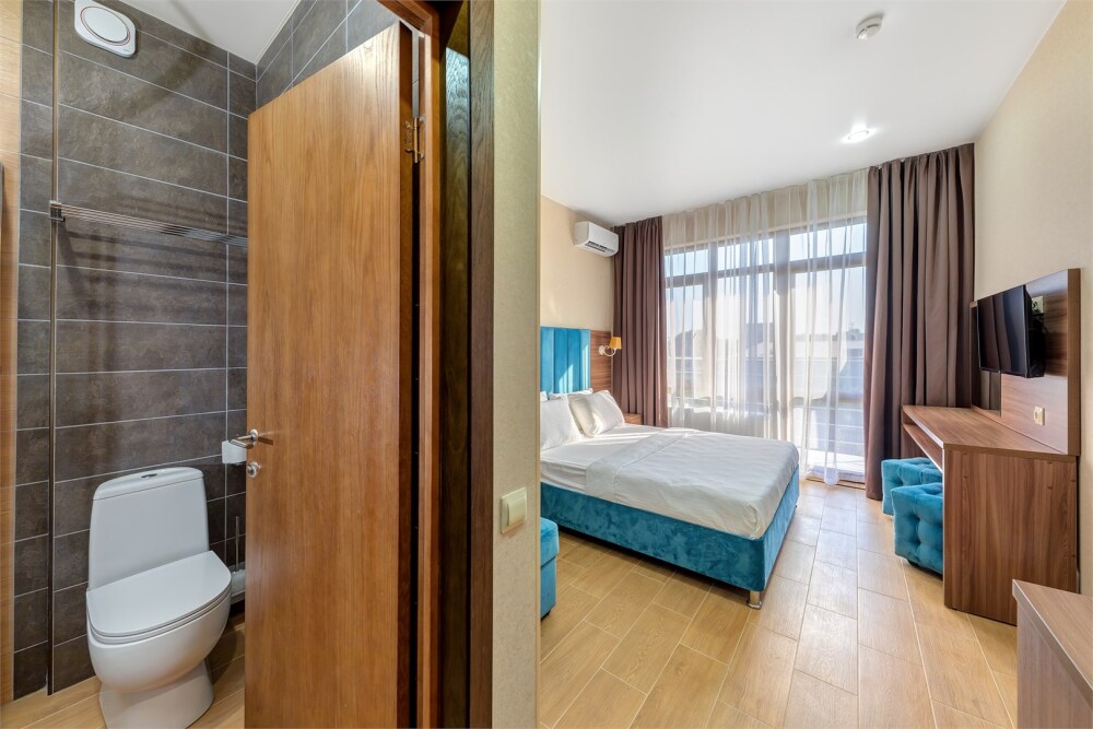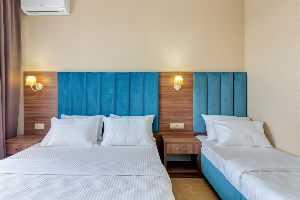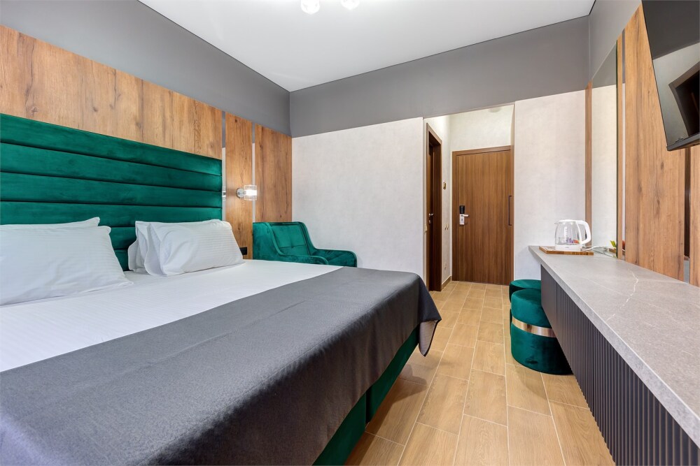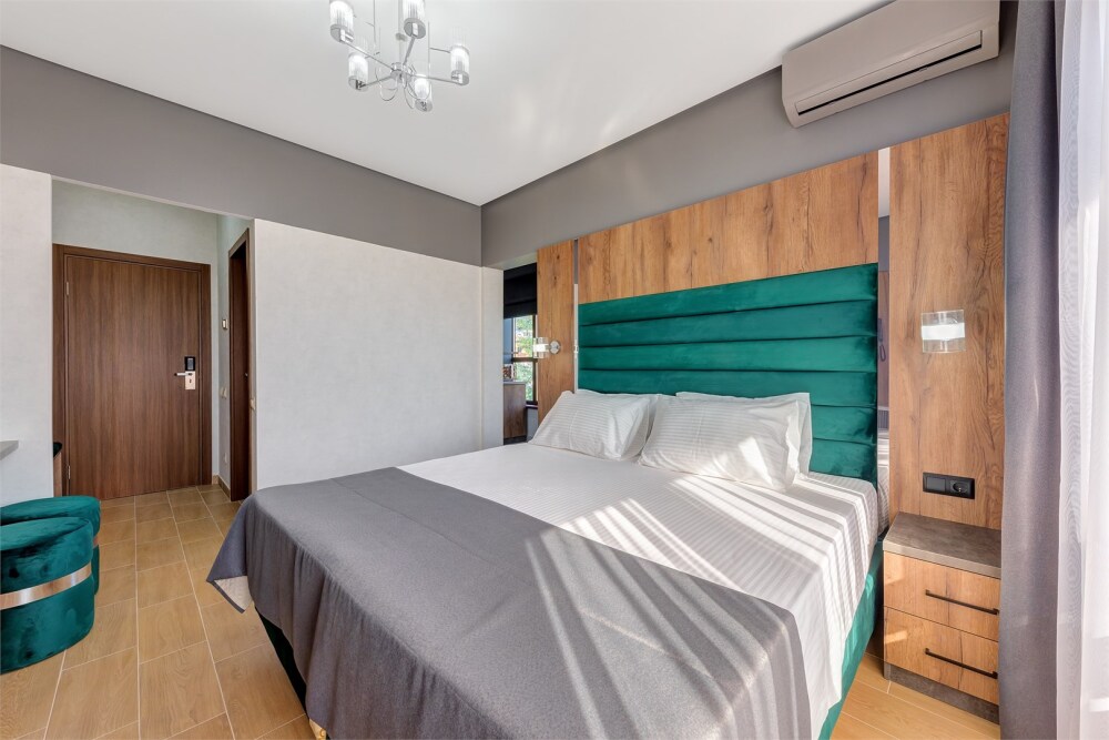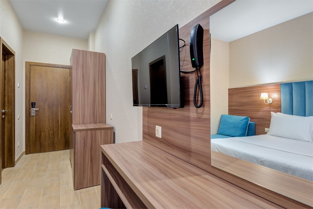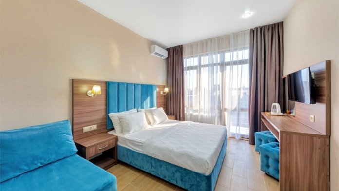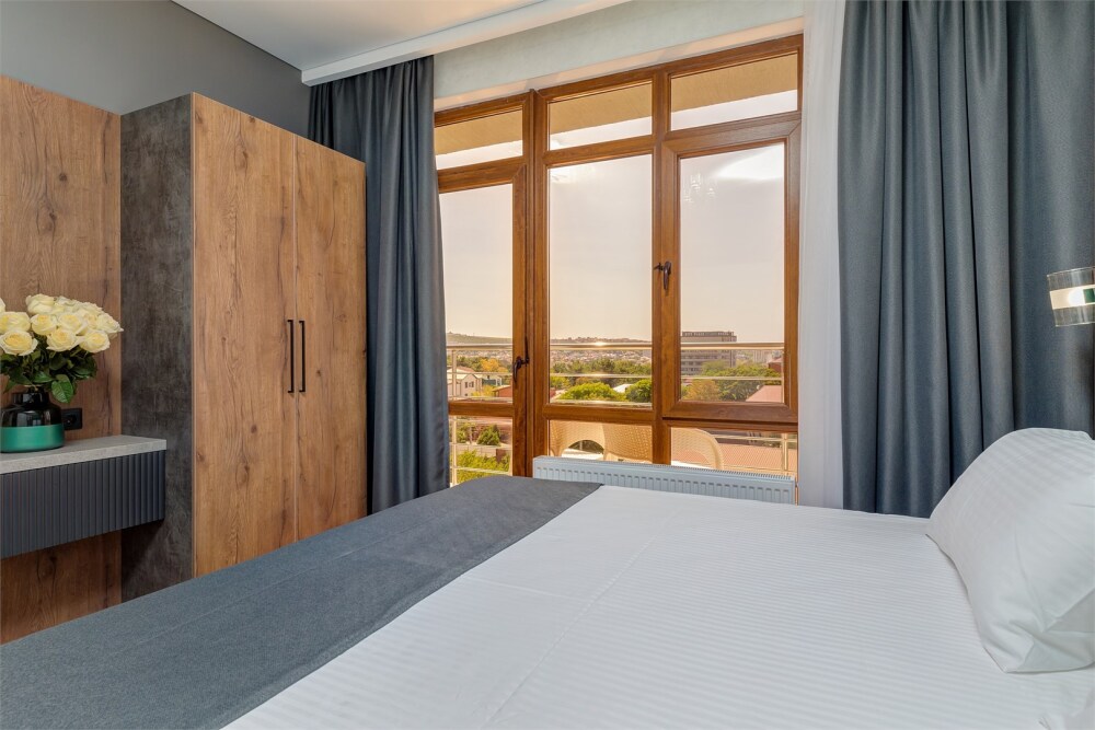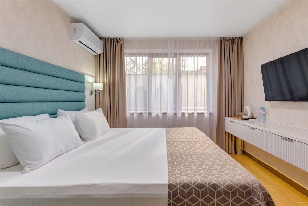 Для семьи из 4-х человек номера можно объединить между собой открыв двери между комнатами и получить 2-комнатный люкс с двумя балконами, с которых открывается чудесный вид на горы и город. Номер оснащен современной мебелью и техникой для комфортного проживания наших гостей.