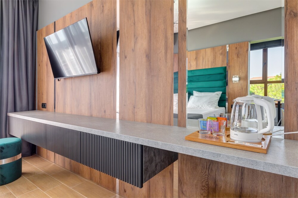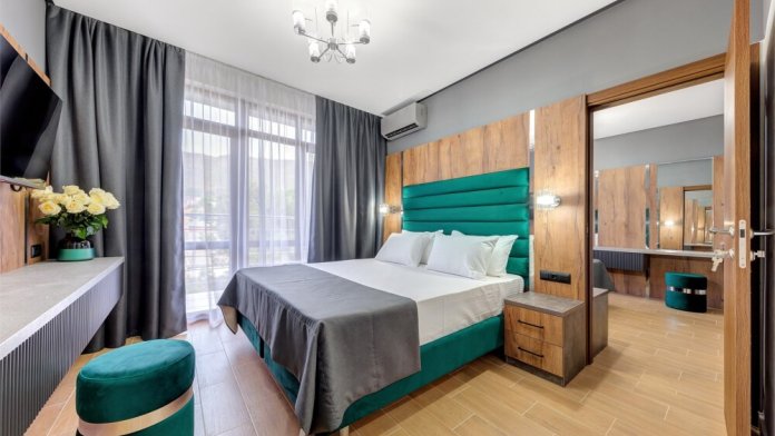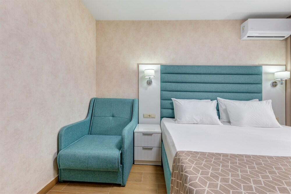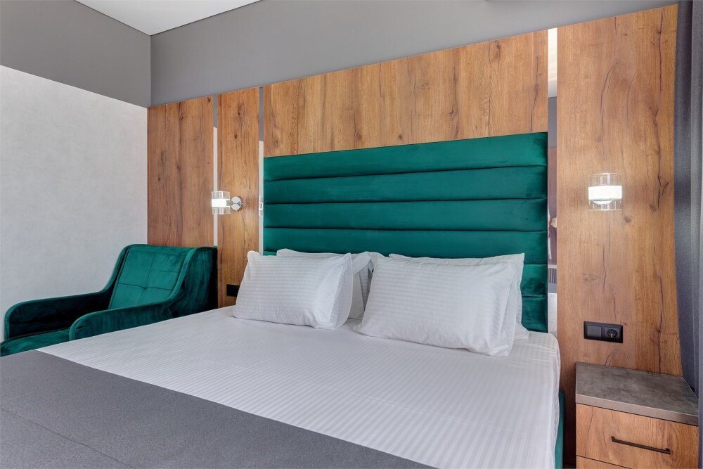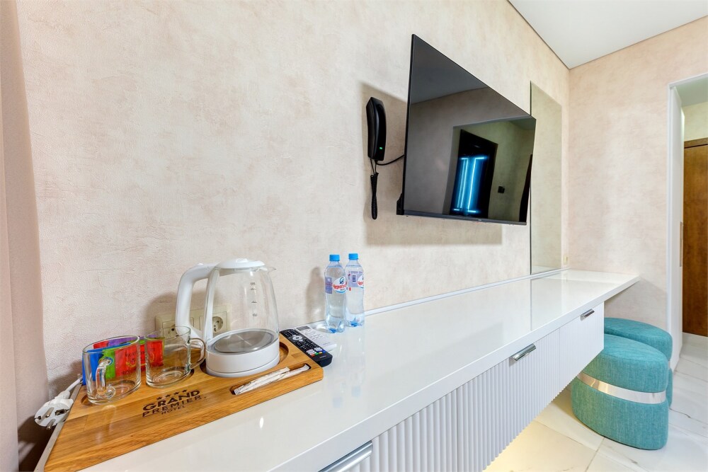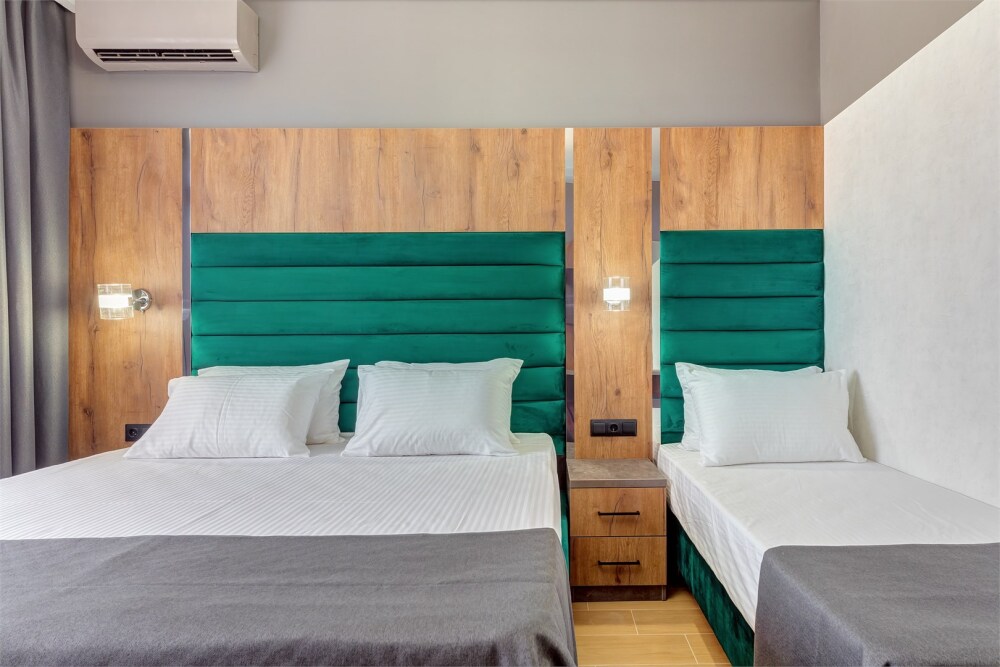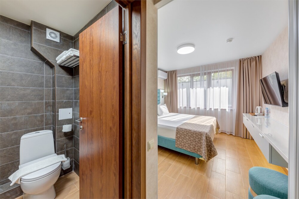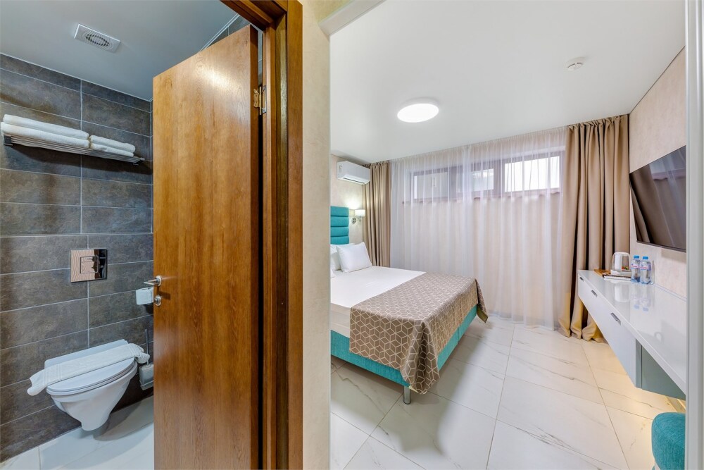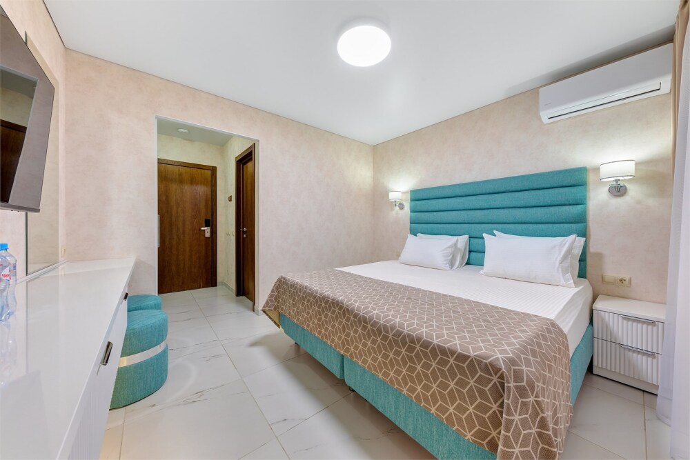 Для семьи из 4-х человек номера можно объединить между собой открыв двери между комнатами и получить 2-комнатный люкс с двумя балконами, с которых открывается чудесный вид на горы и город. Номер оснащен современной мебелью и техникой для комфортного проживания наших гостей.