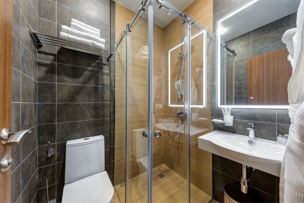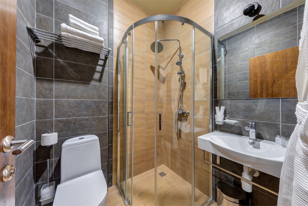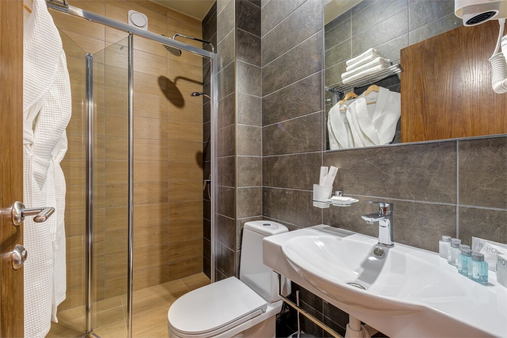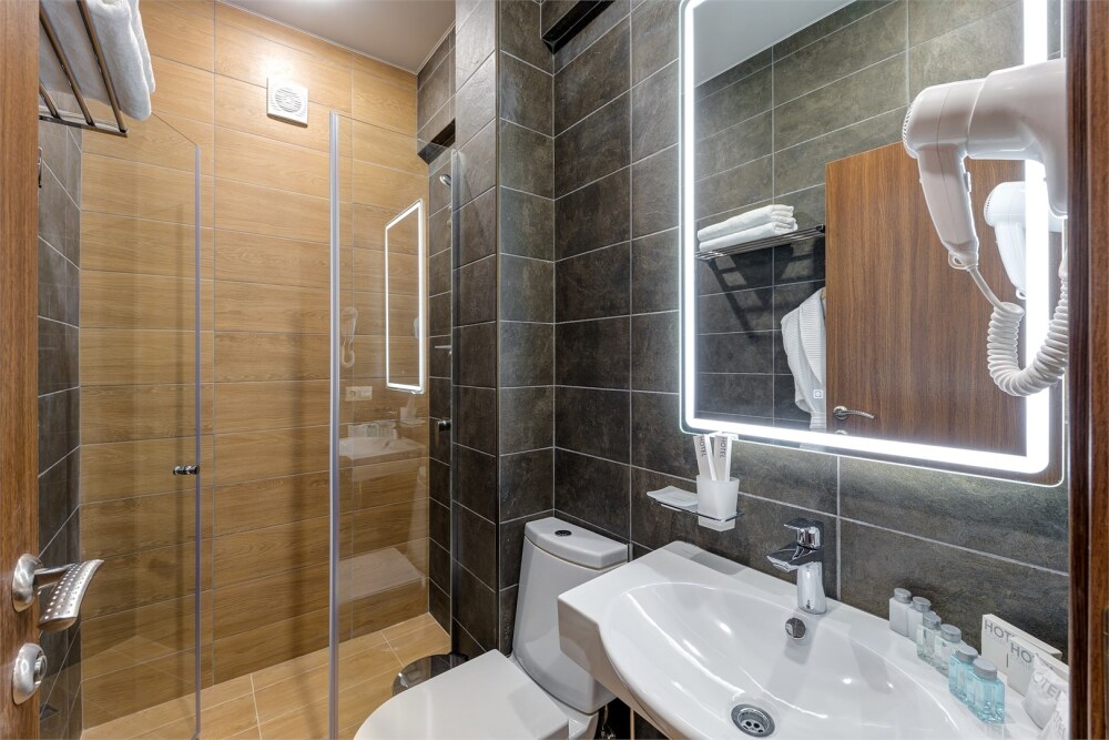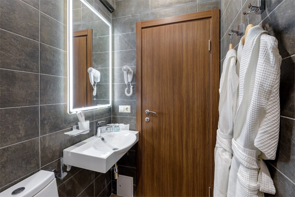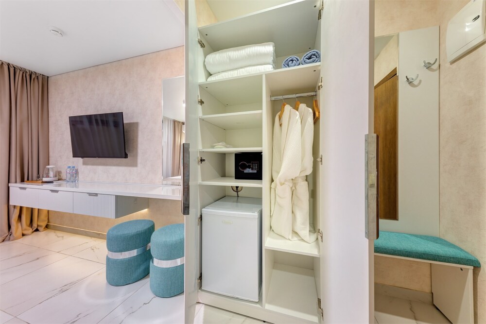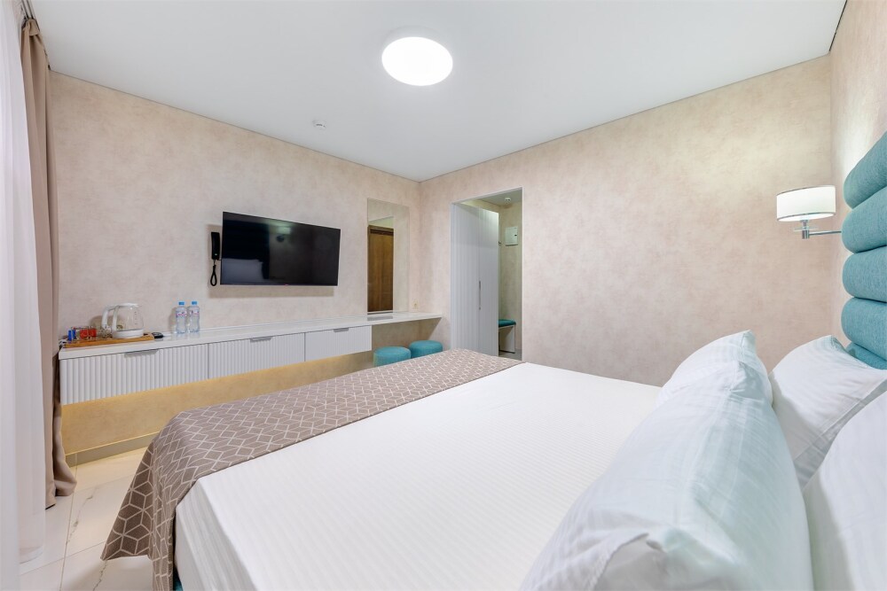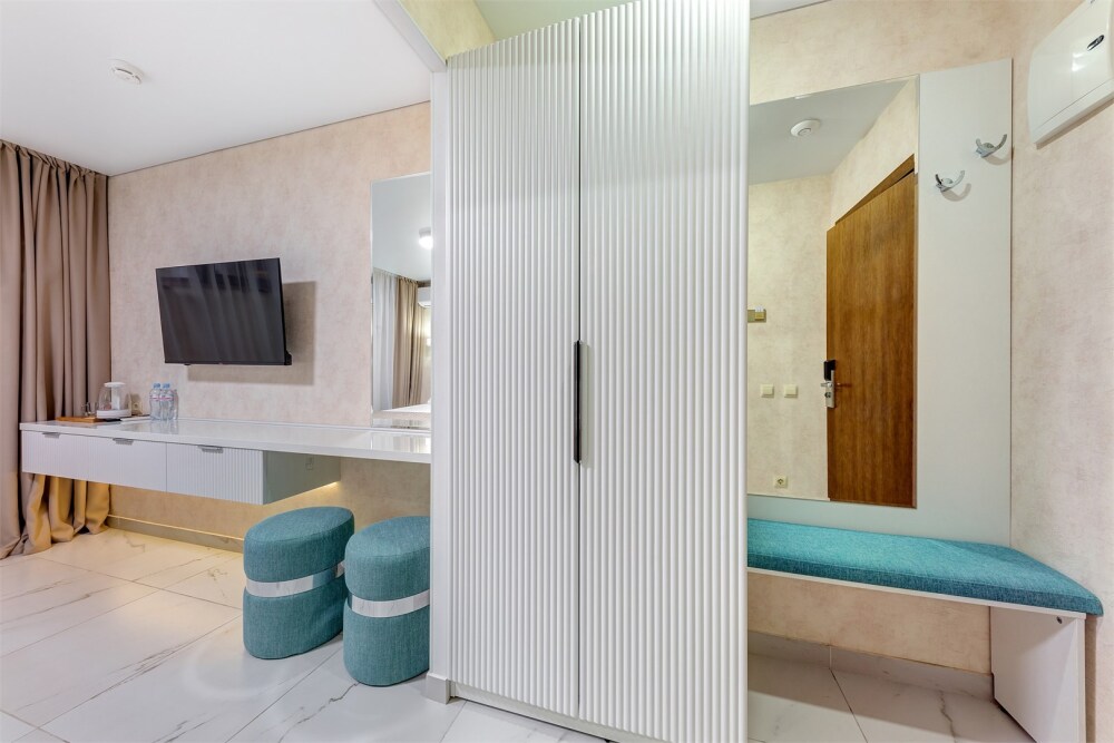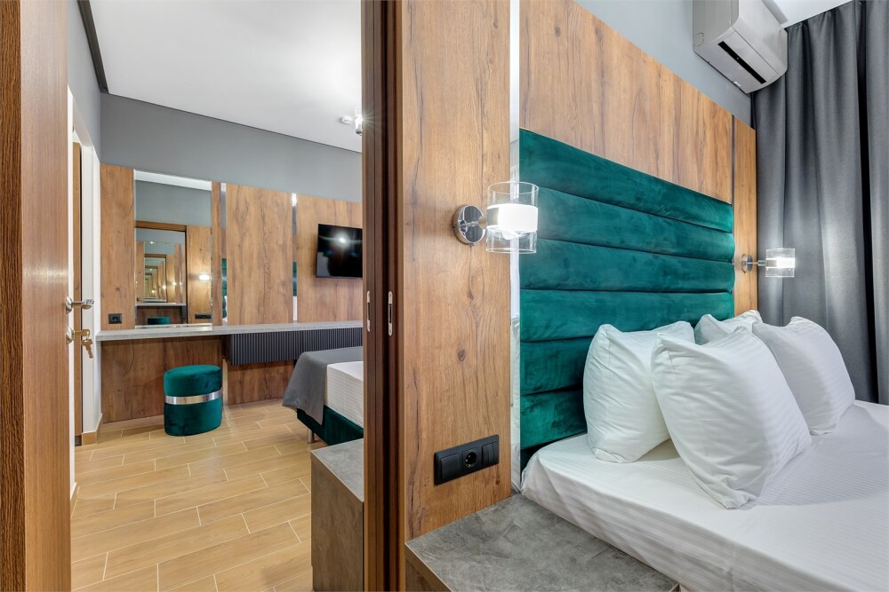 Для семьи из 4-х человек номера можно объединить между собой открыв двери между комнатами и получить 2-комнатный люкс с двумя балконами, с которых открывается чудесный вид на горы и город. Номер оснащен современной мебелью и техникой для комфортного проживания наших гостей.