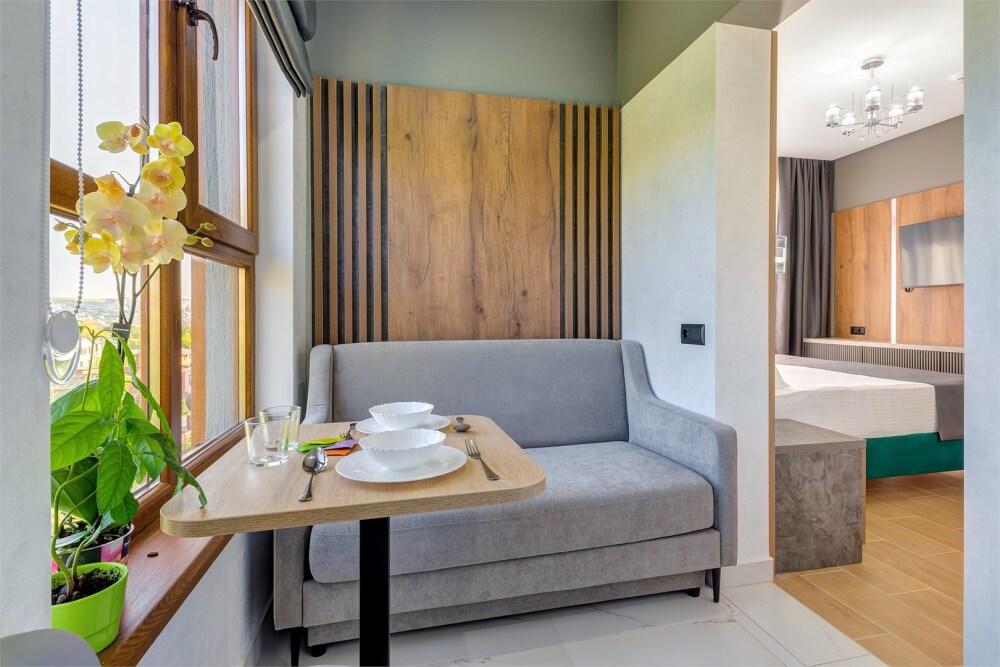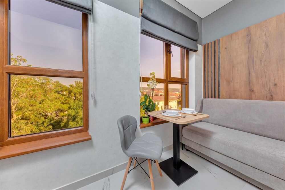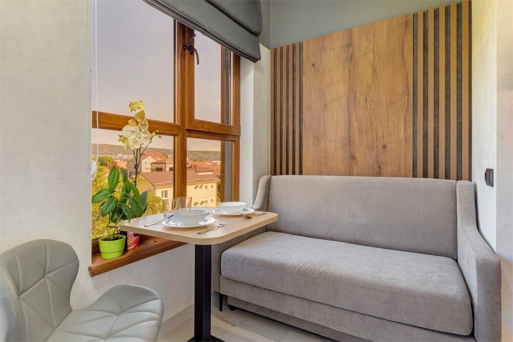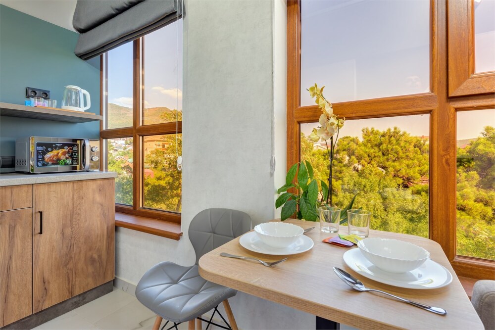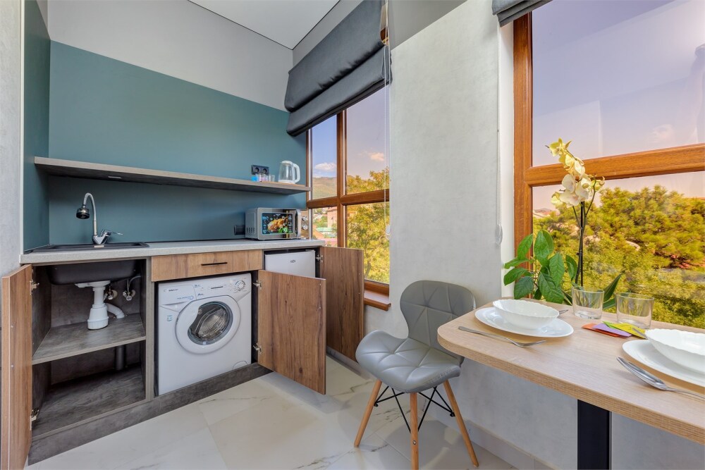 Номер с дизайнерским ремонтом для двухместного размещения с кухней. Кухня оснащена современной техникой и мебелью. С балкона открывается чудесный вид на море и город. Номер оснащен новой мебелью для комфортного проживания наших гостей.