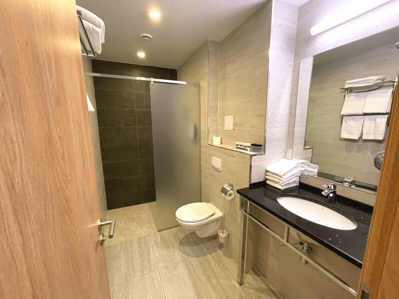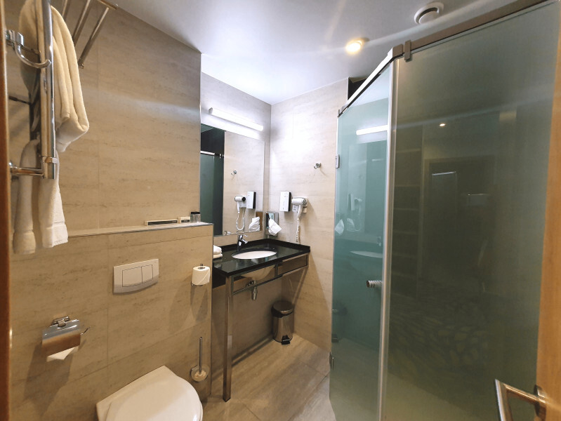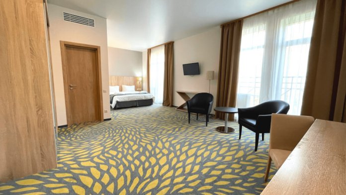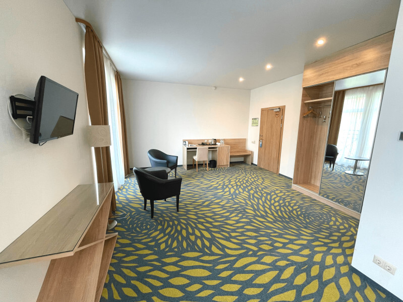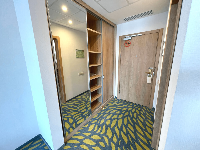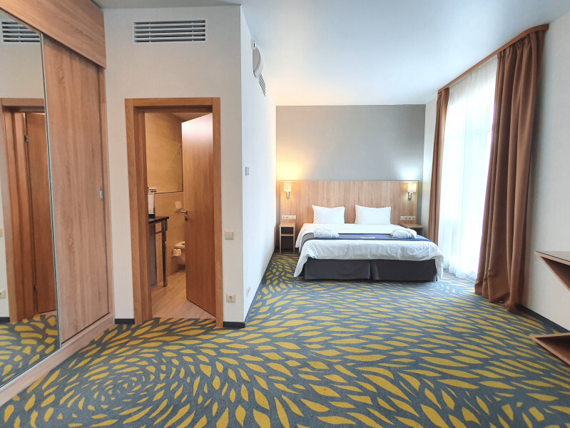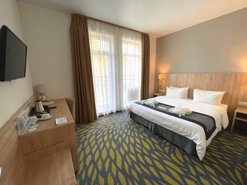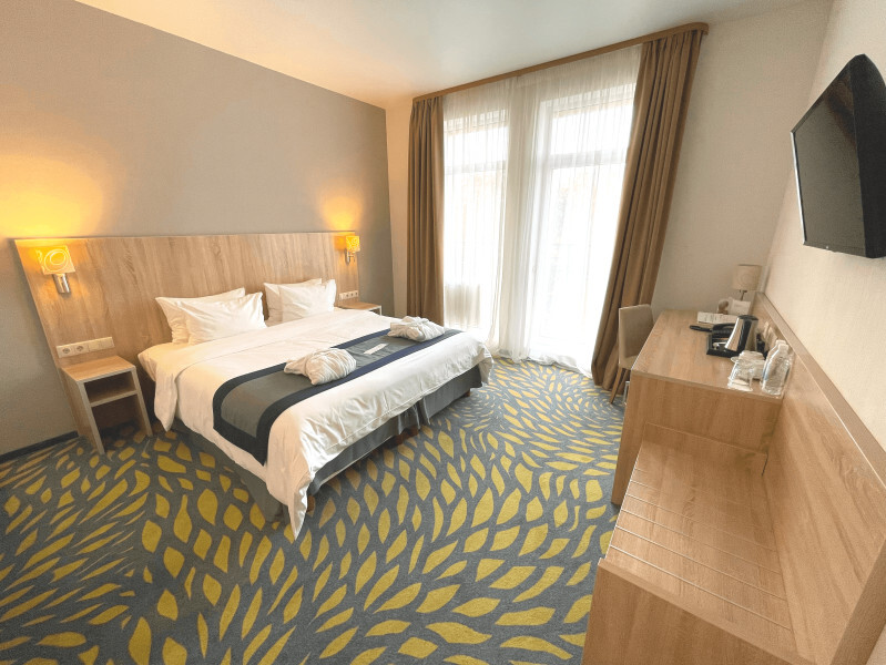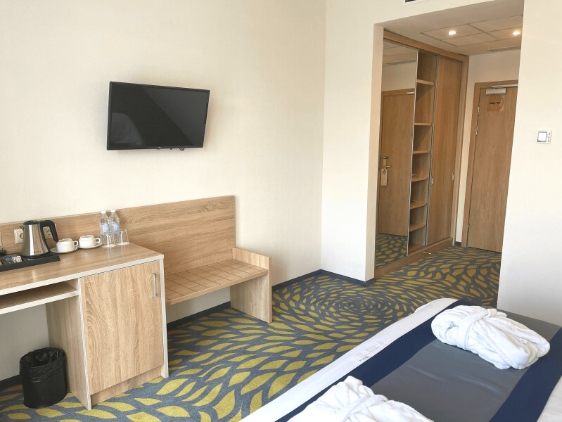 Номер укомплектован плазменной панелью, рабочим местом, телефоном, кондиционером, сейфом, чайной станцией и мини-холодильником. Предоставляются тапочки и махровые халаты, бутилированная вода. Имеется возможность предоставления дополнительного спального места: евро-раскладушка или детская кроватка-манеж.
