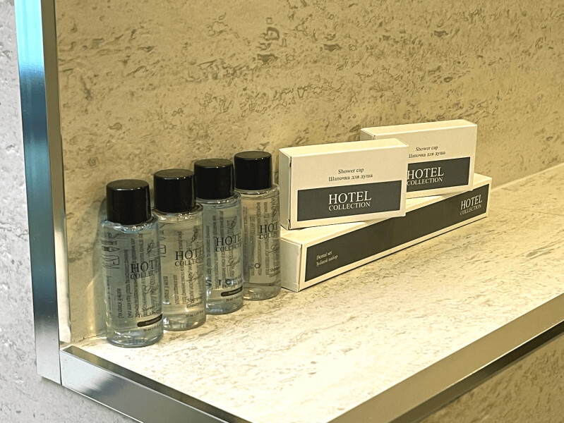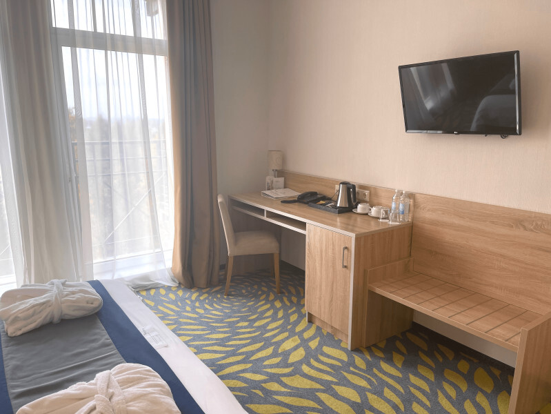 Номер укомплектован плазменной панелью, рабочим местом, телефоном, кондиционером, сейфом, чайником и мини-холодильником. . В номер при заезде предоставляются тапочки и бутилированная вода.