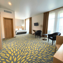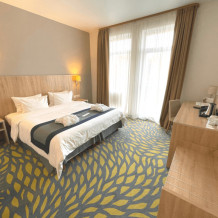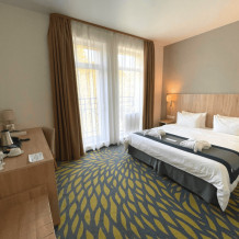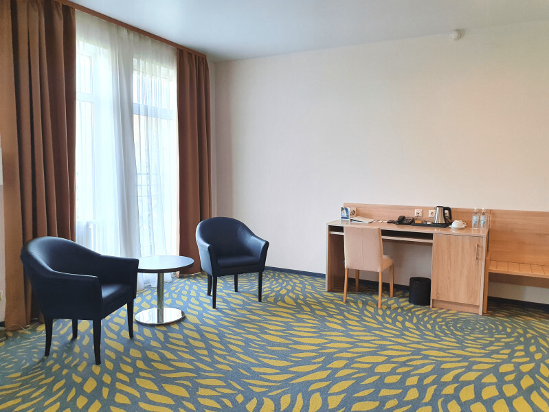 Номер с одной двуспальной кроватью «King-size» или двумя односпальными кроватями, оборудован зоной для отдыха с двумя удобными креслами и столиком.