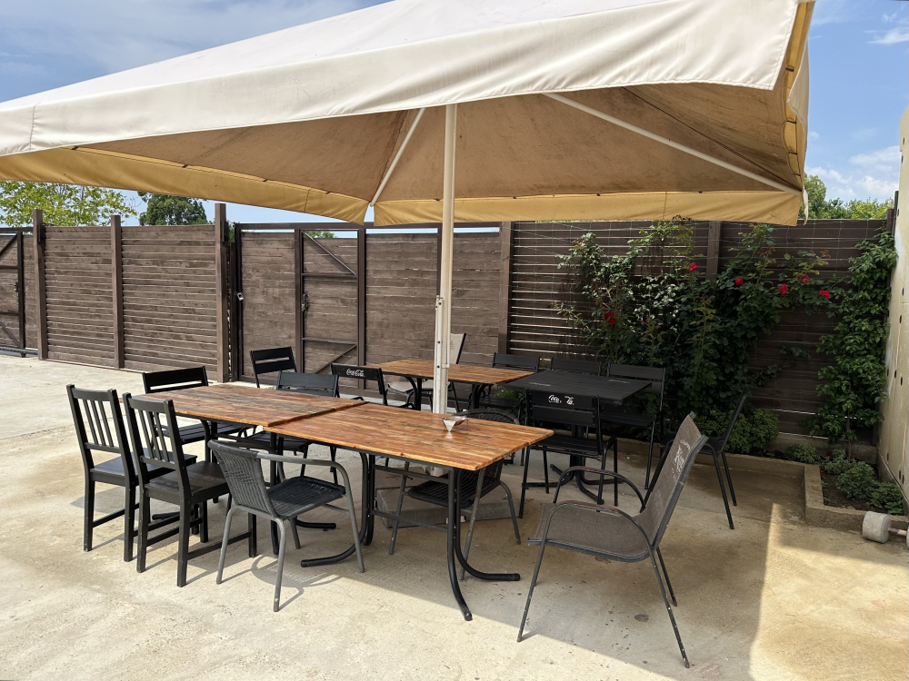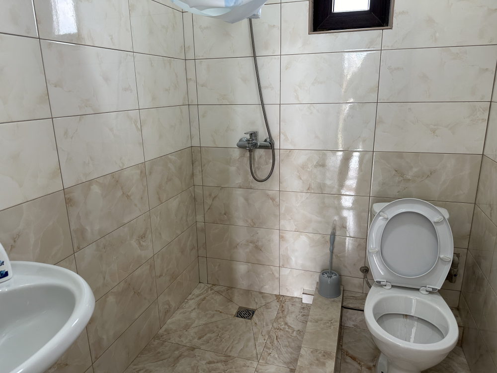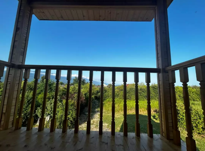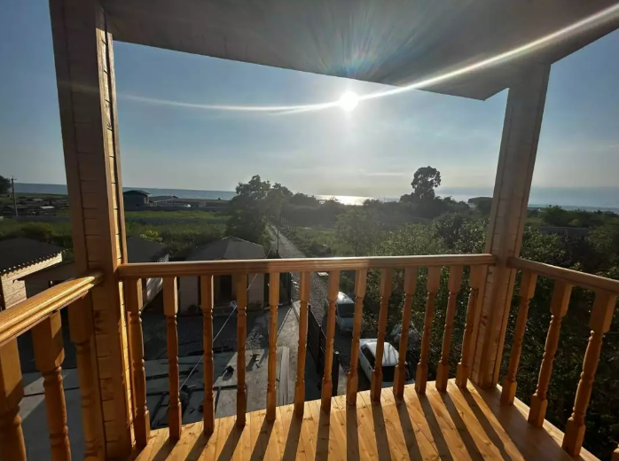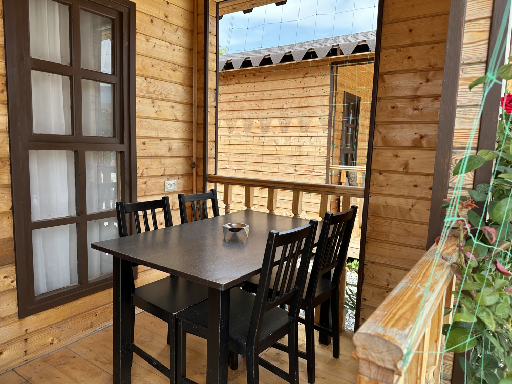 Номер с балконом рассчитан до 3х человек - в номере 2 односпальные кровати и кресло-кровать, а также всё необходимое для приятного отдыха: телевизор, спит система, холодильник, стол, зеркало, шкаф для одежды, фен. Душ и туалет также расположены в номере. Из окон открывается захватывающий вид на море и горы. На территории есть общая кухня со всем необходимым для приготовления и приема пищи, а также каркасный бассейн, зона отдыха и барбекю.