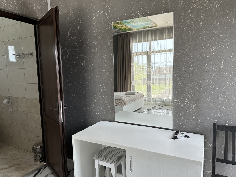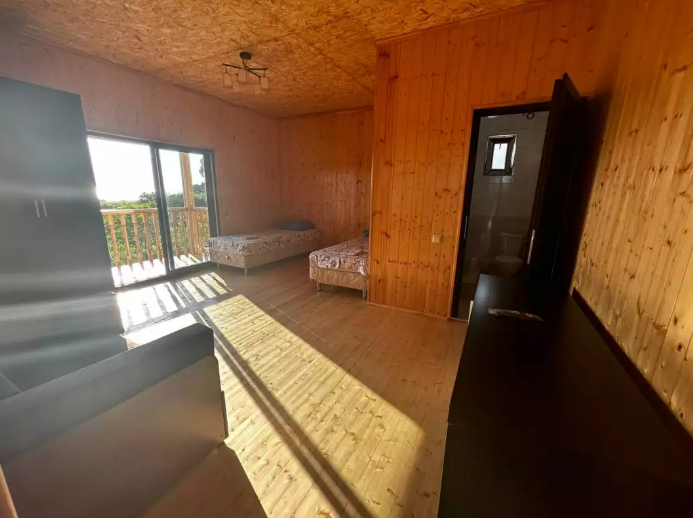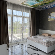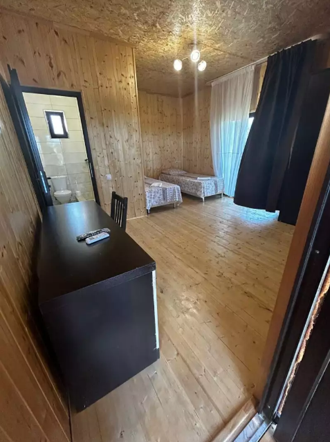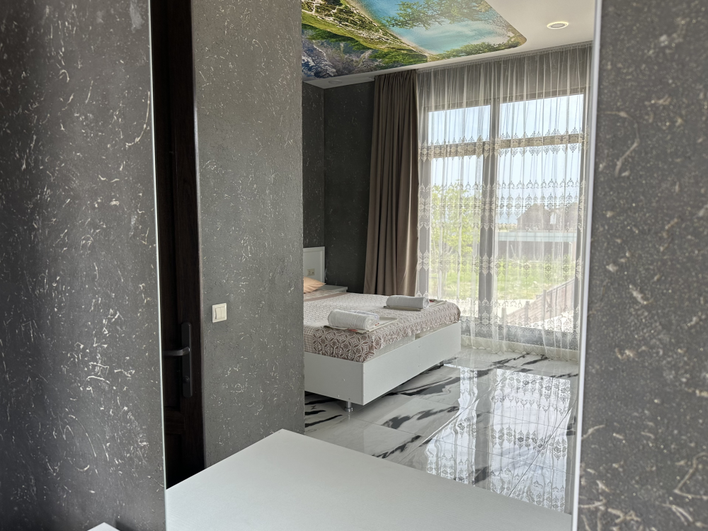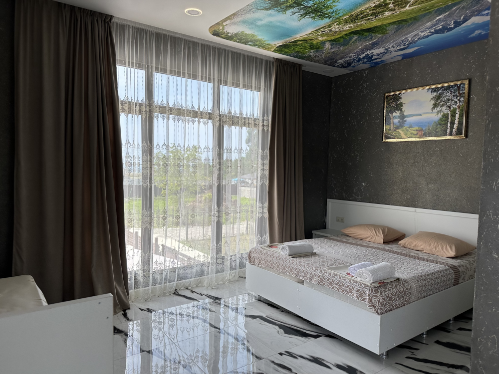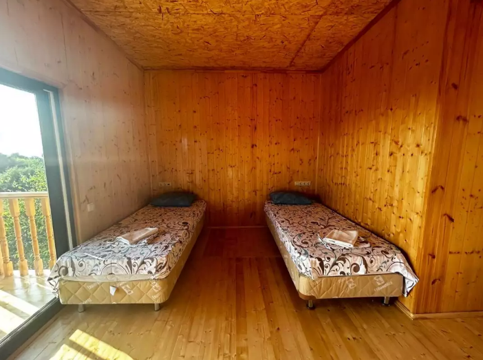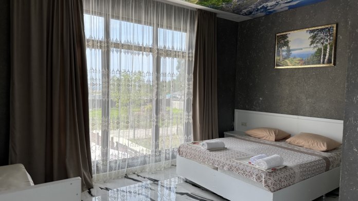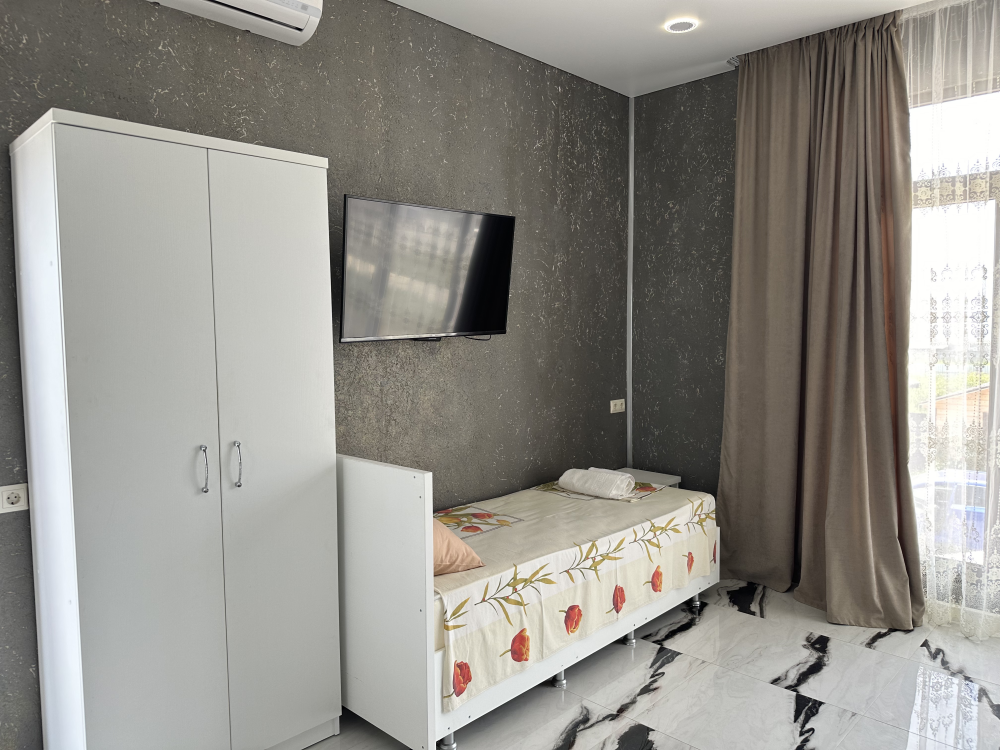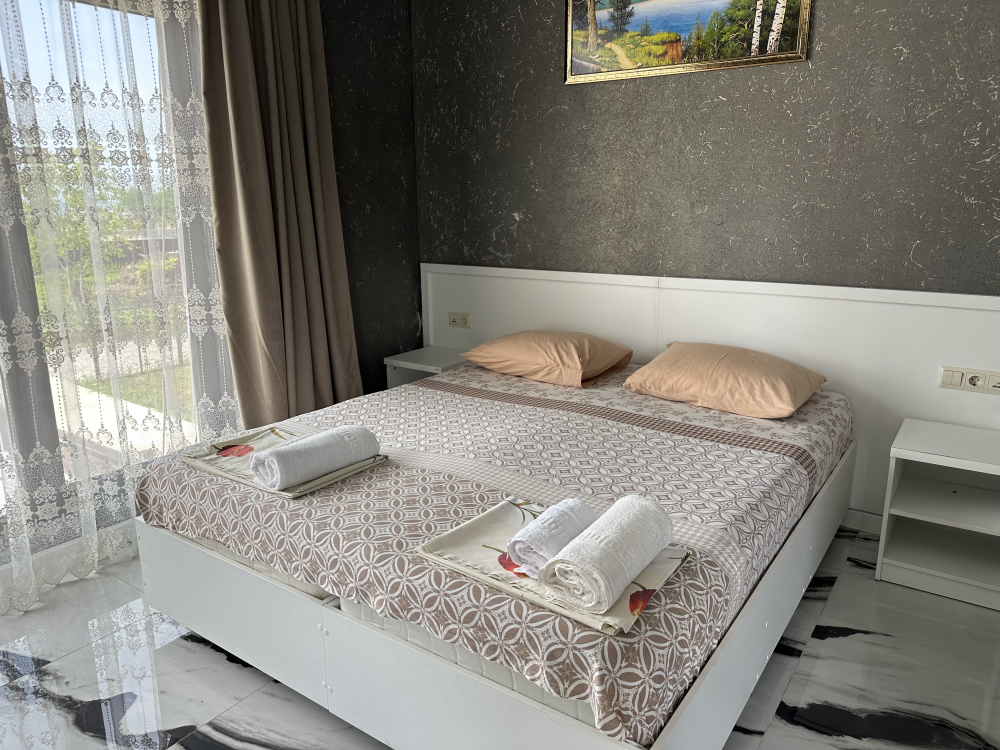 Номер рассчитан до 3х человек - в номере двуспальная и односпальная кровати, а также всё необходимое для приятного отдыха: телевизор, спит система, холодильник, стол, зеркало, шкаф для одежды, фен. Душ и туалет также расположены в номере. Из окон открывается захватывающий вид на море и горы. На территории есть общая кухня со всем необходимым для приготовления и приема пищи, а также каркасный бассейн, зона отдыха и барбекю.