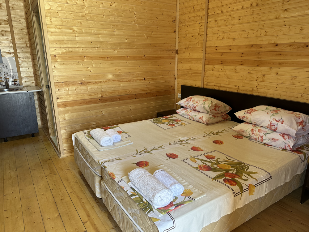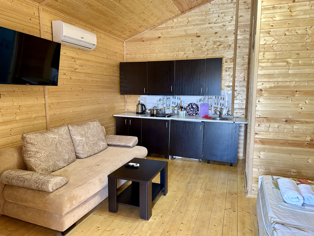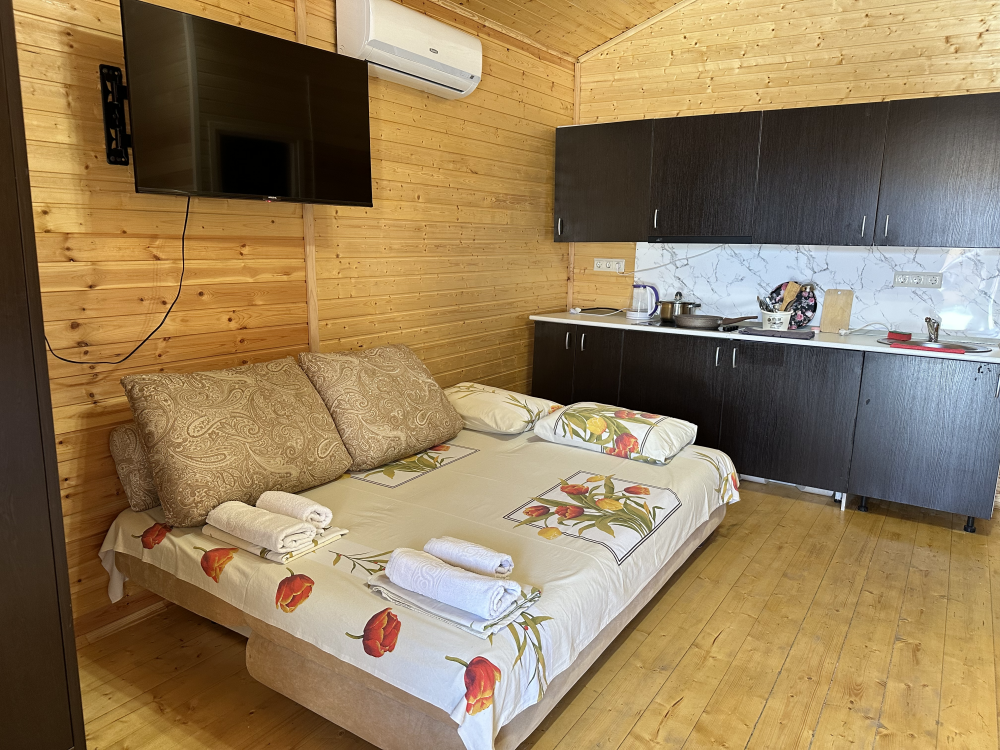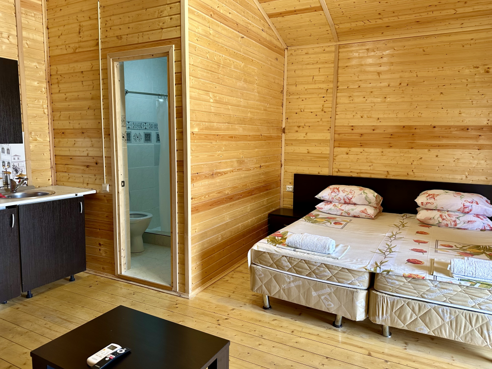 Уютный домик с двуспальной кроватью и диваном — отличный выбор для комфортного отдыха семьи или компании из 4х человек. Домик оснащён собственной террасой, где можно насладиться свежим воздухом и приятно провести время. Внутри есть своя собственная кухня со всем необходимым для приготовления пищи: холодильник, плита, чайник, микроволновая печь и посуда. В номере также есть телевизор, сплит система, фен и полотенца.