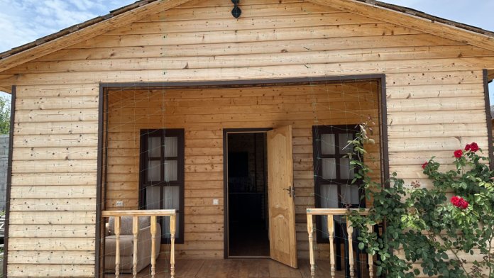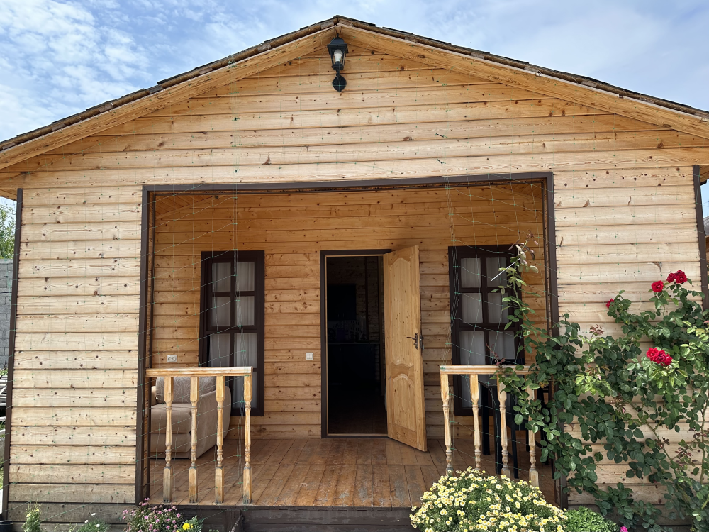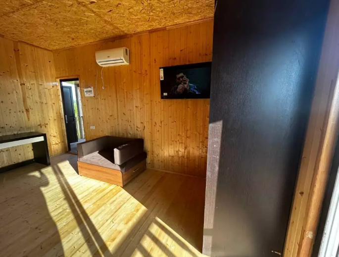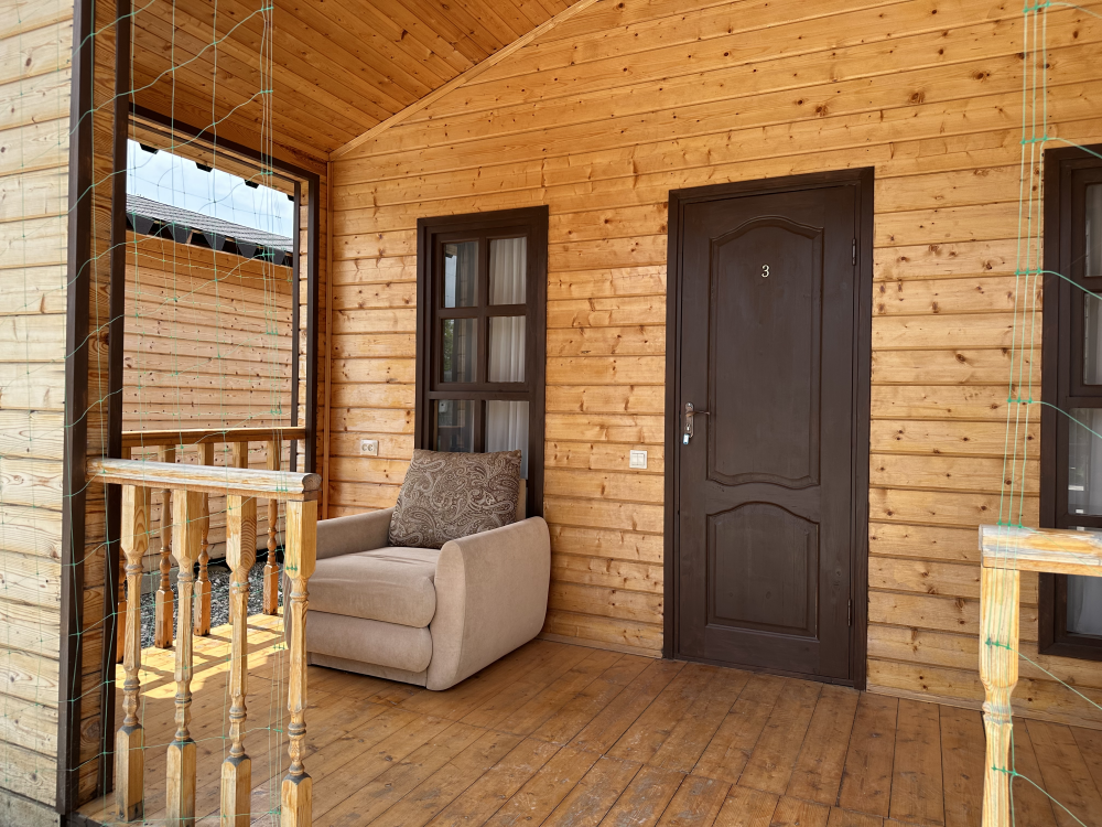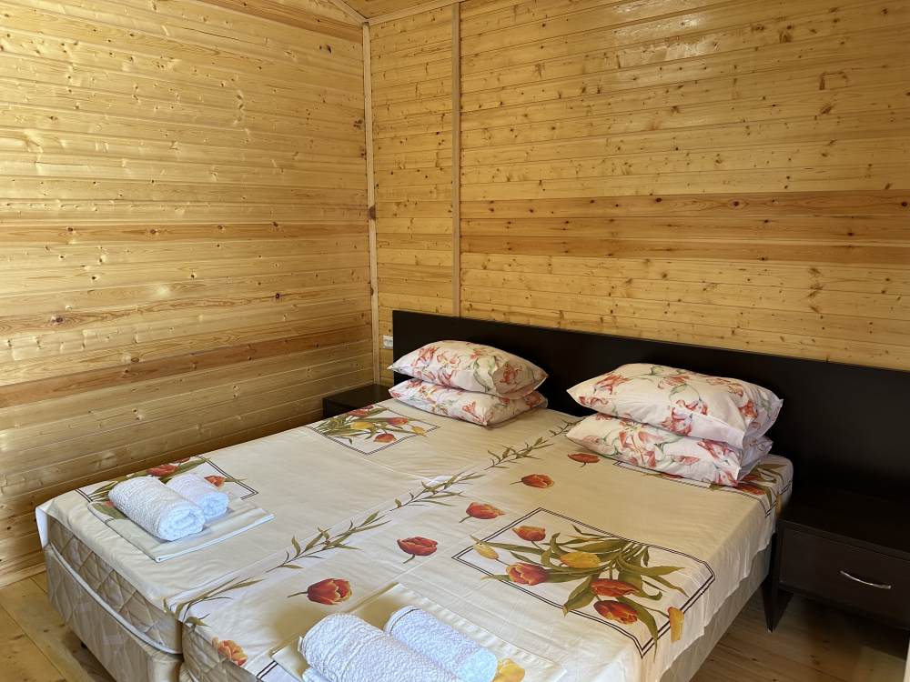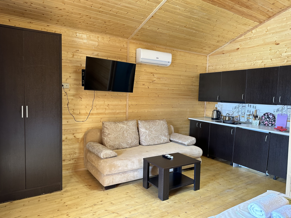 Уютный домик с двуспальной кроватью и диваном — отличный выбор для комфортного отдыха семьи или компании из 4х человек. Домик оснащён собственной террасой, где можно насладиться свежим воздухом и приятно провести время. Внутри есть своя собственная кухня со всем необходимым для приготовления пищи: холодильник, плита, чайник, микроволновая печь и посуда. В номере также есть телевизор, сплит система, фен и полотенца.