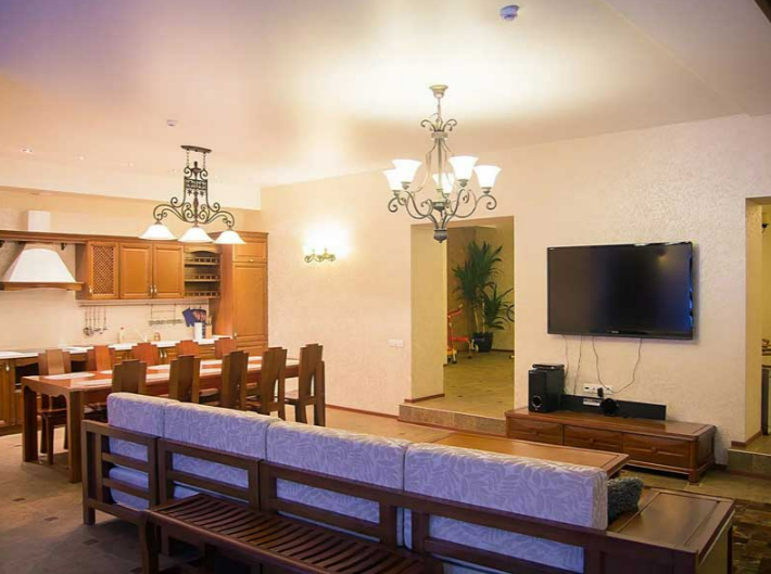 В резиденции собственная кухня (мойка, СВЧ печь, холодильник, электроплита, набор посуды) с обеденной зоной. В зоне отдыха два дивана, 3D телевизор, игровая приставка, кедровая сауна.