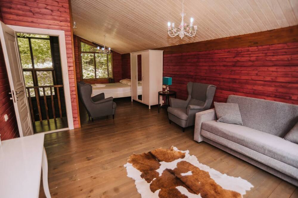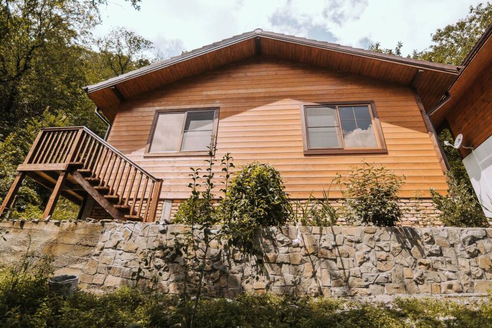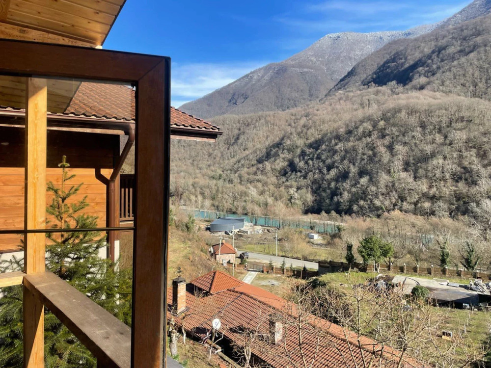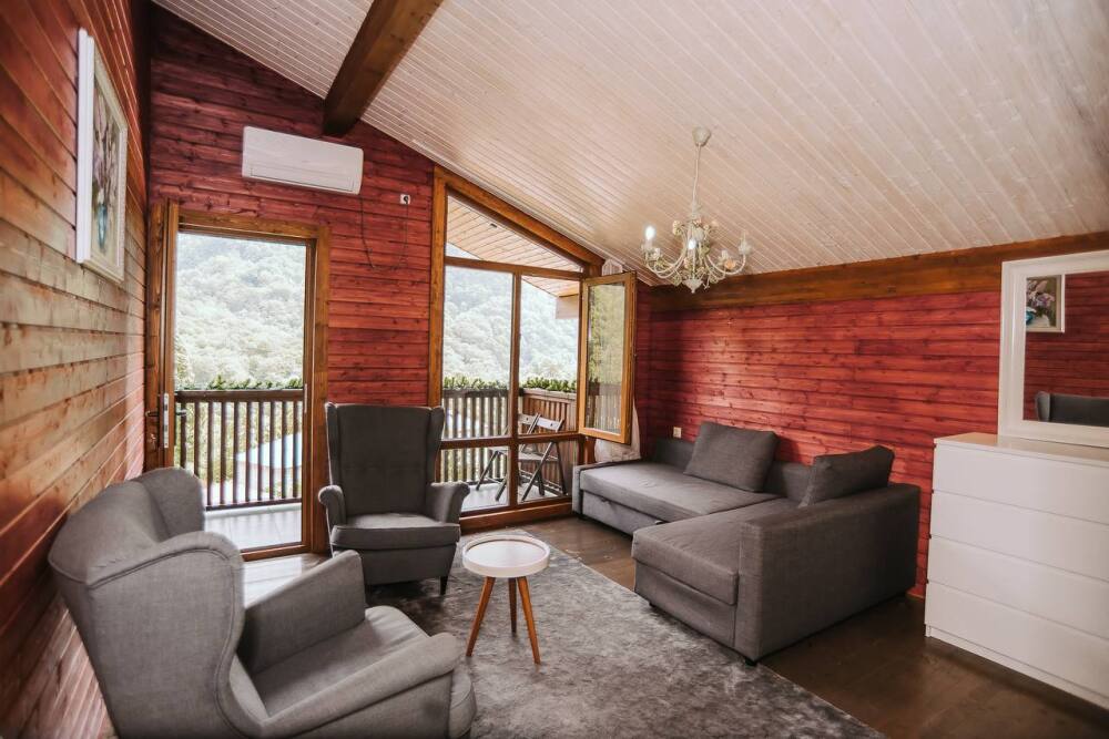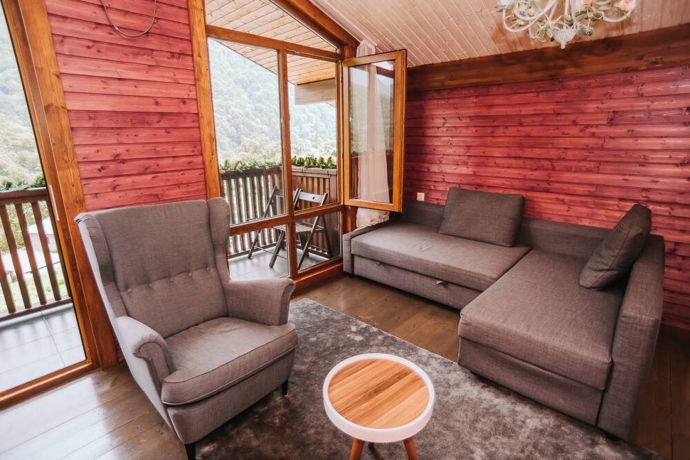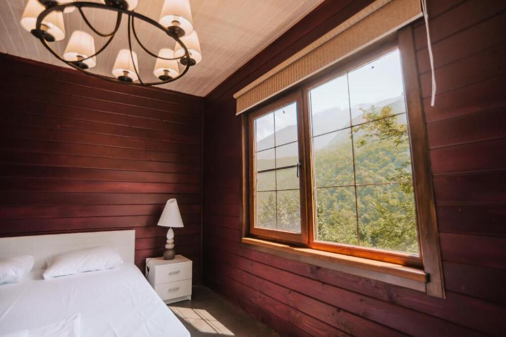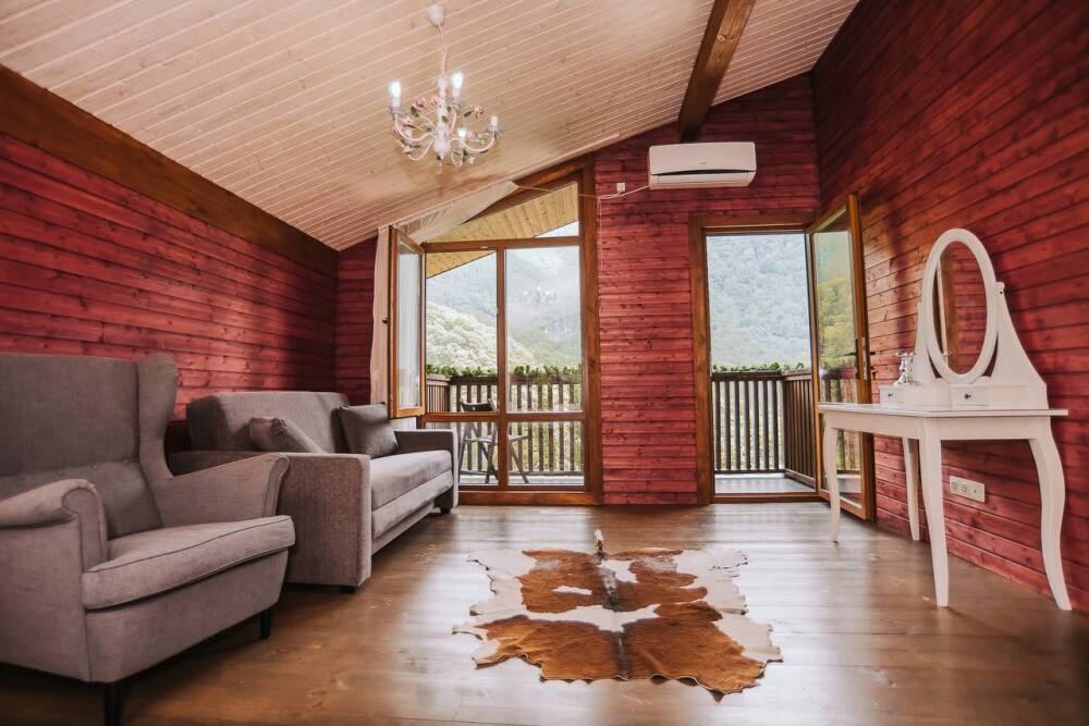 Отдельный комплекс, расположенный среди живописной природы, состоит из двухэтажных коттеджей, которые рассчитаны на размещение от 2 до 10 человек. Домики выстроены с применением экологически чистых материалов, в каждом номере имеется санузел с душем, кондиционер, телевизор и холодильник. С балконов открываются живописные виды на горы, реку Бзыбь и ущелье.
