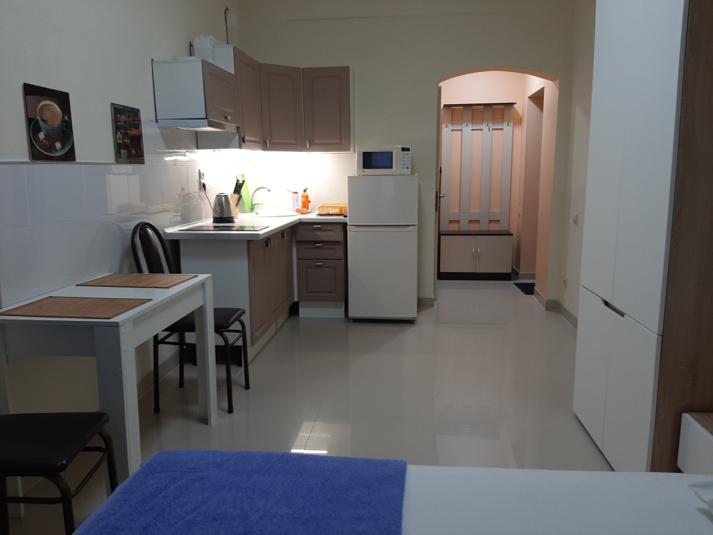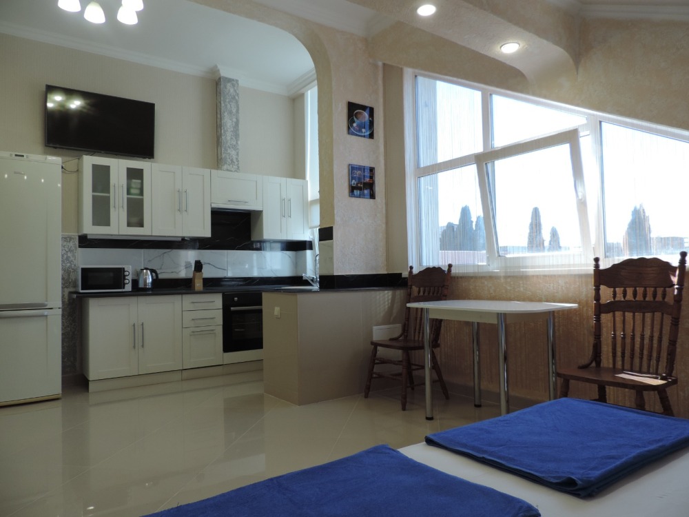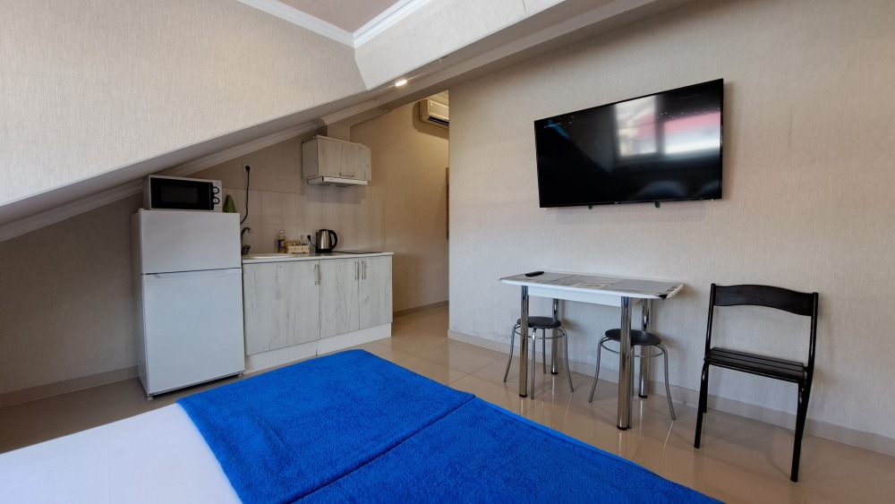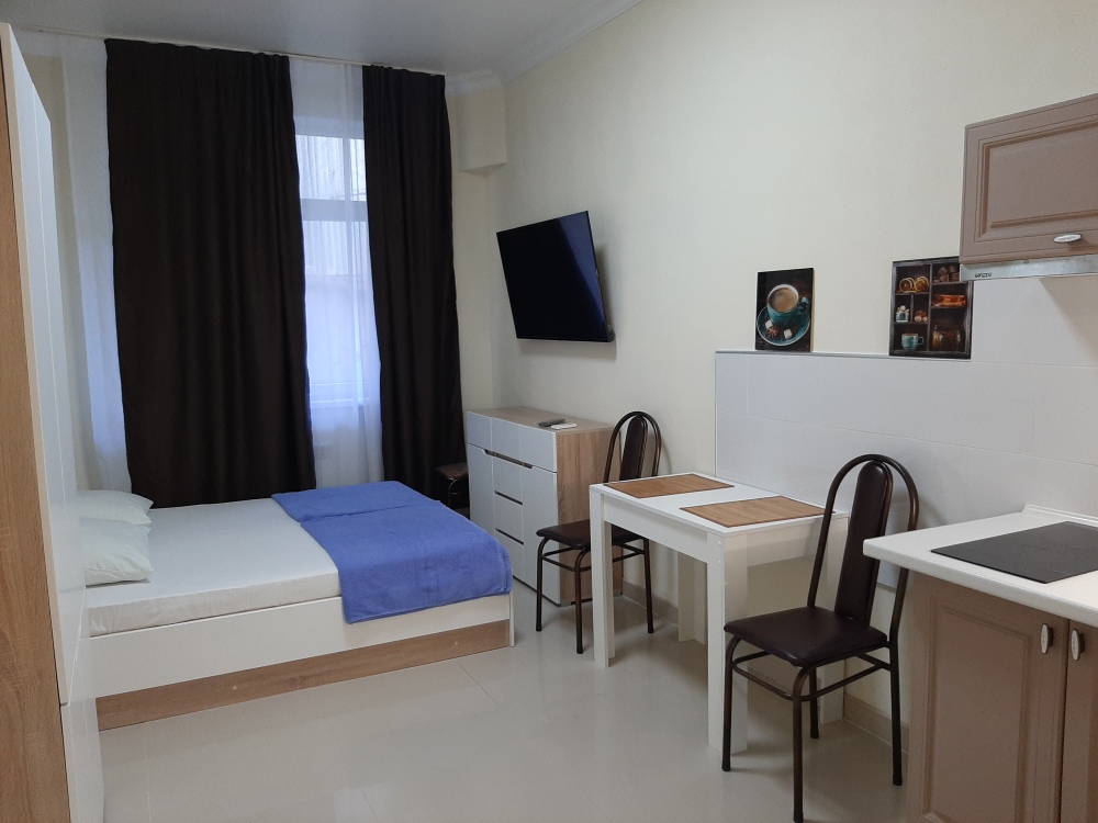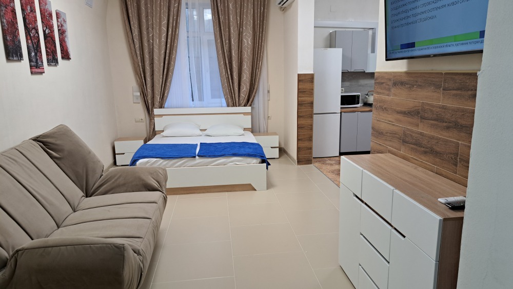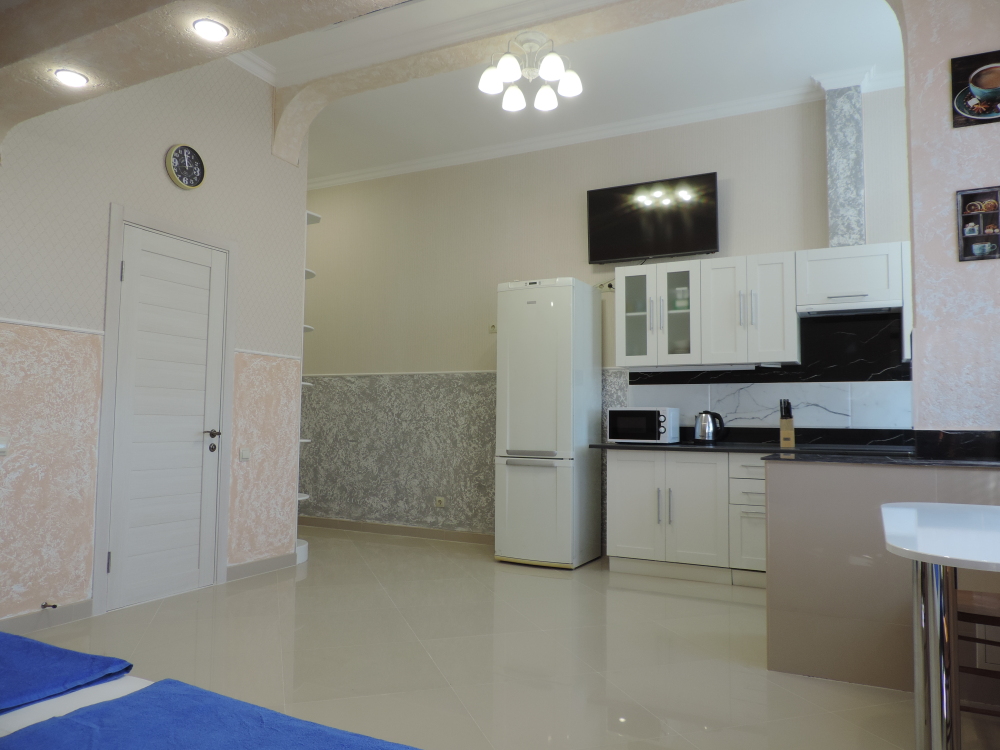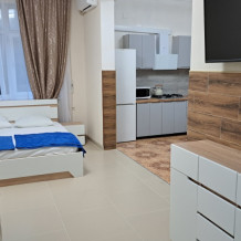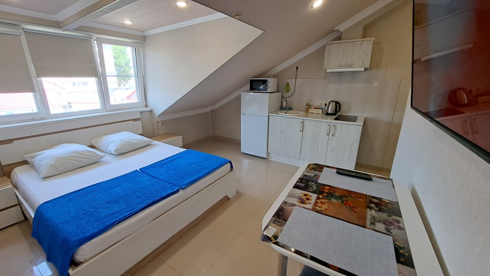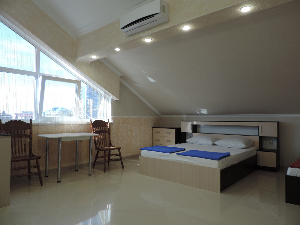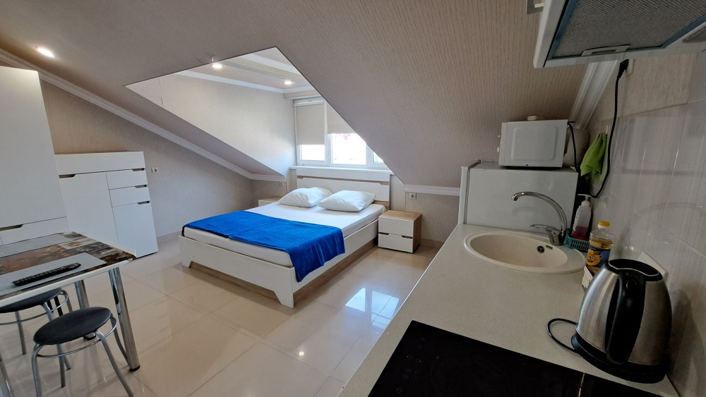 Большой, просторный, светлый, номер студия с кухней. Есть все кухонные принадлежности, мебель, постельное белье, стиральная машинка, кондиционер.