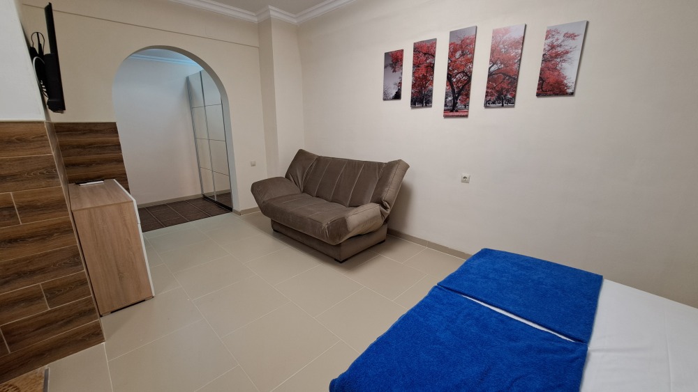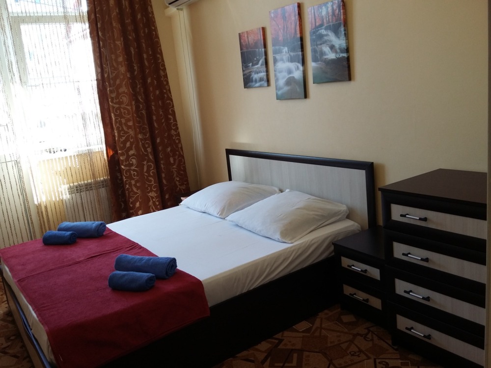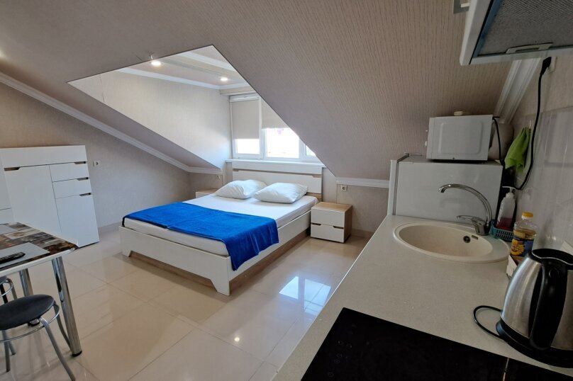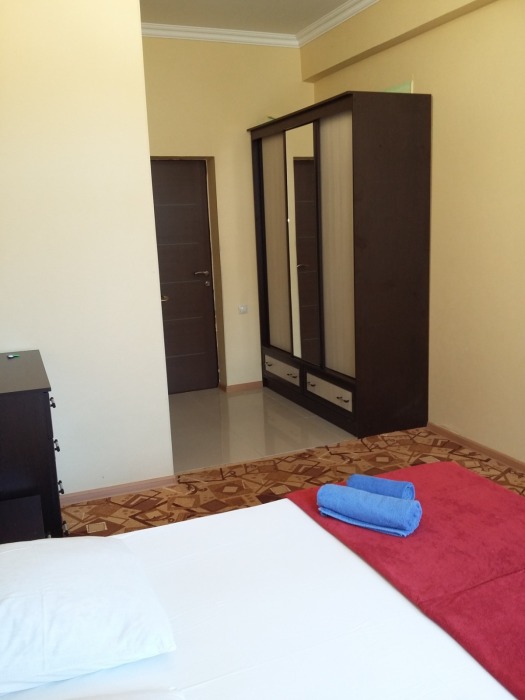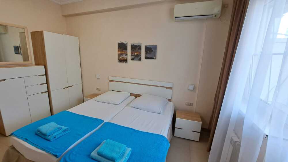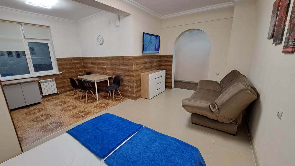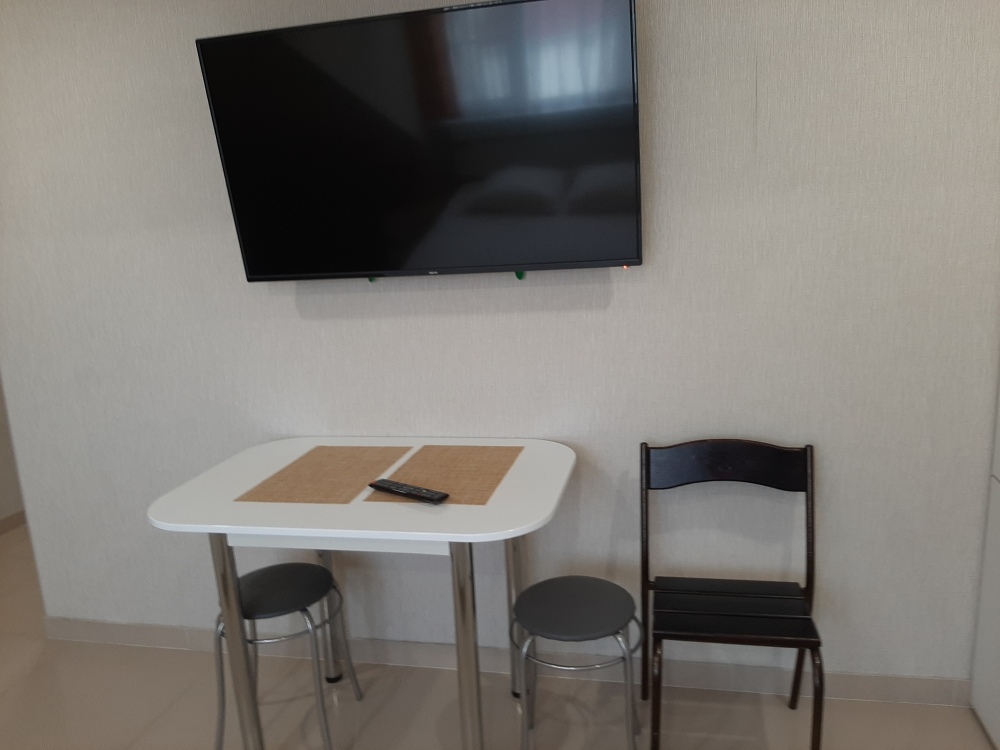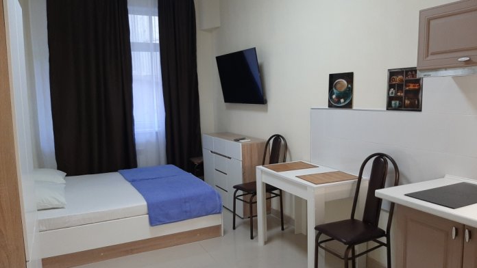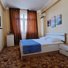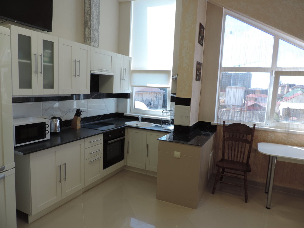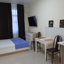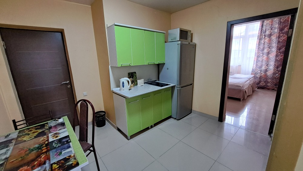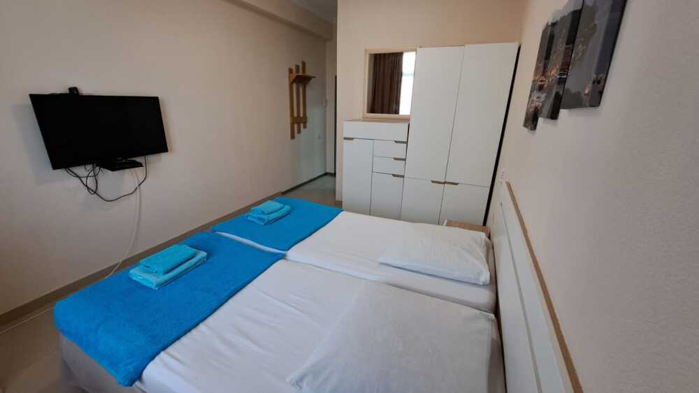 Большой, просторный, светлый, номер студия с кухней. Есть все кухонные принадлежности, мебель, постельное белье, стиральная машинка, кондиционер.