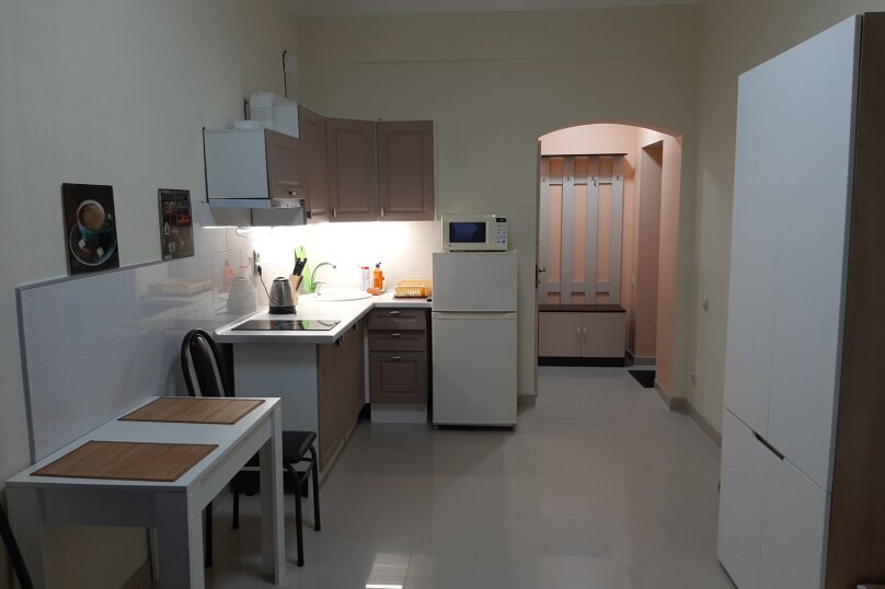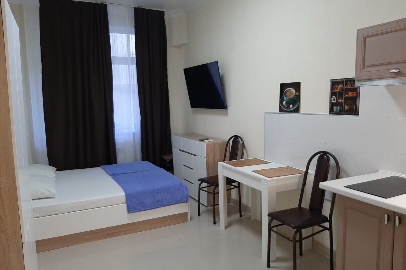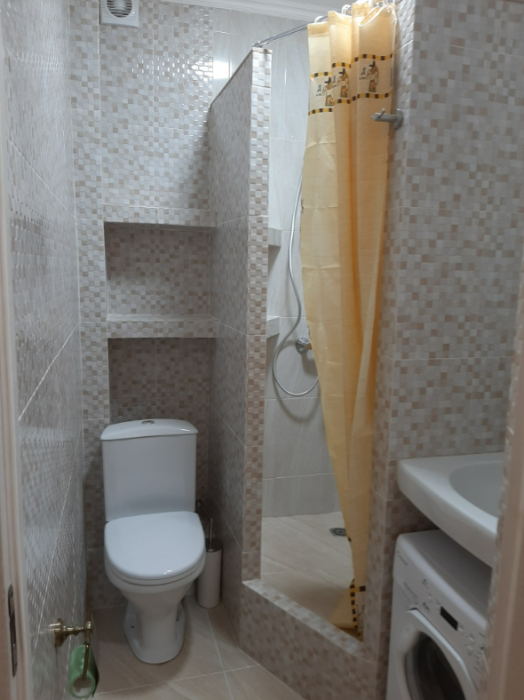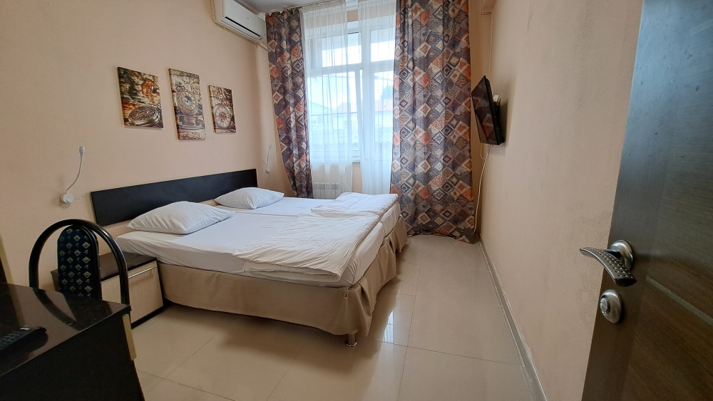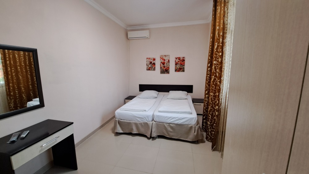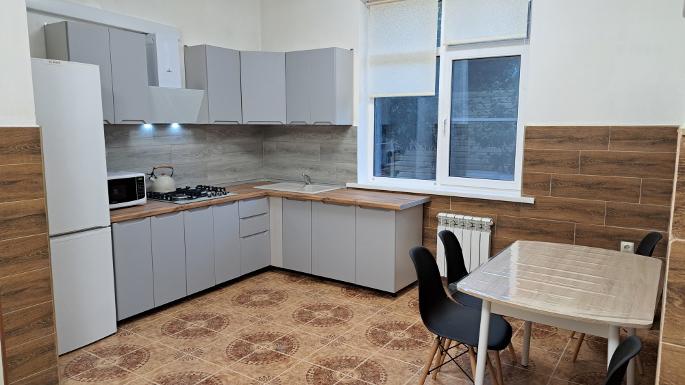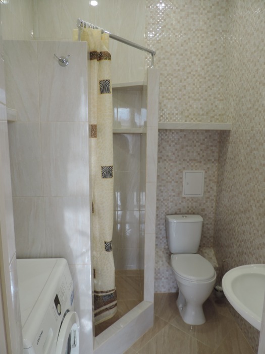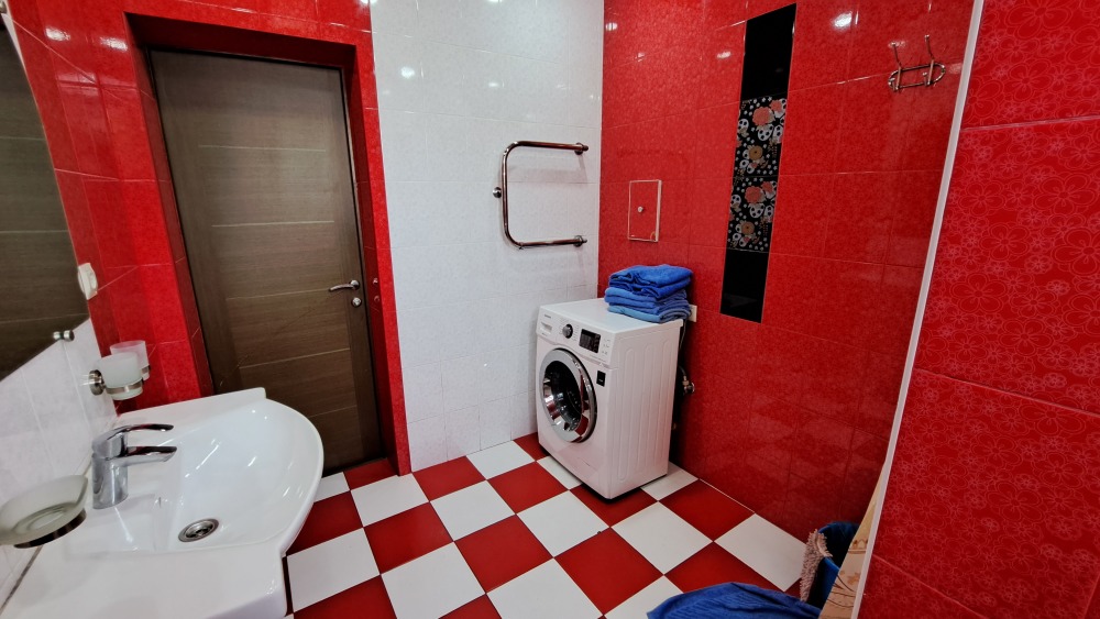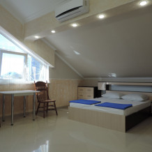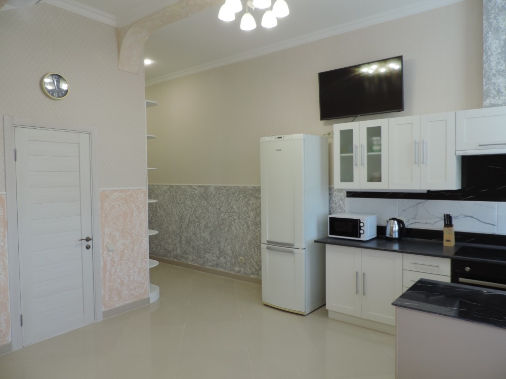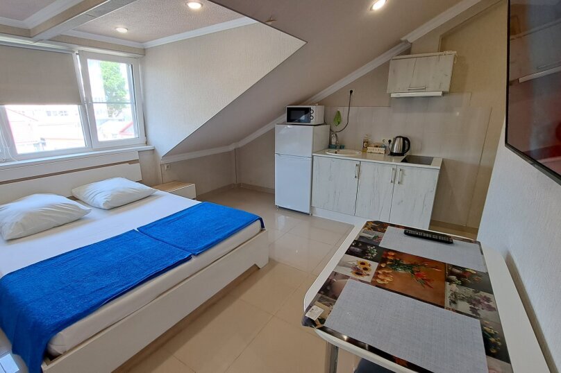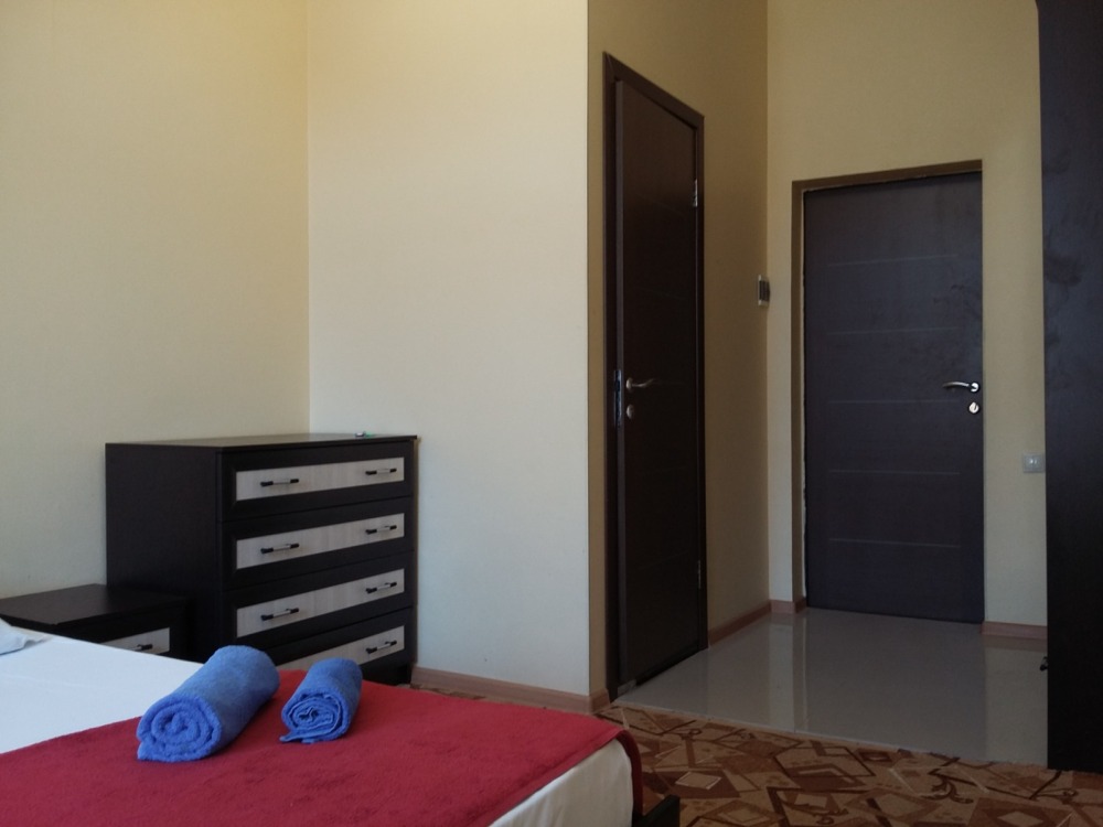 Большой, просторный, светлый, номер студия с кухней. Есть все кухонные принадлежности, мебель, постельное белье, стиральная машинка, кондиционер.