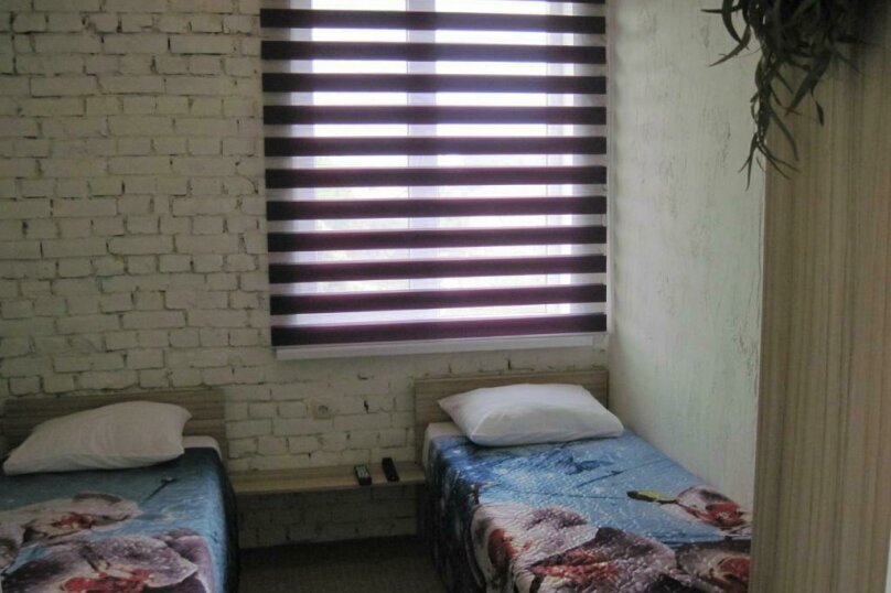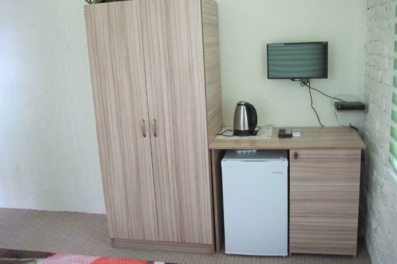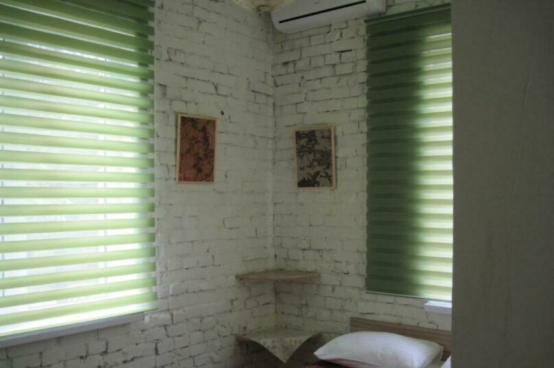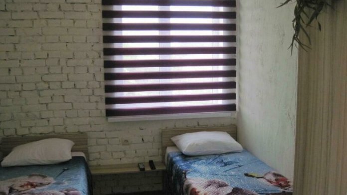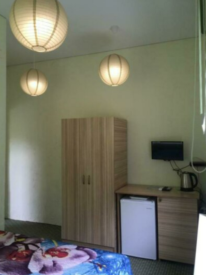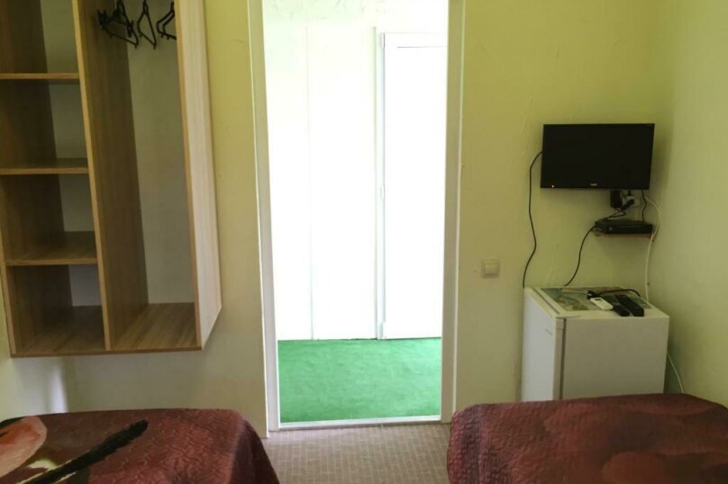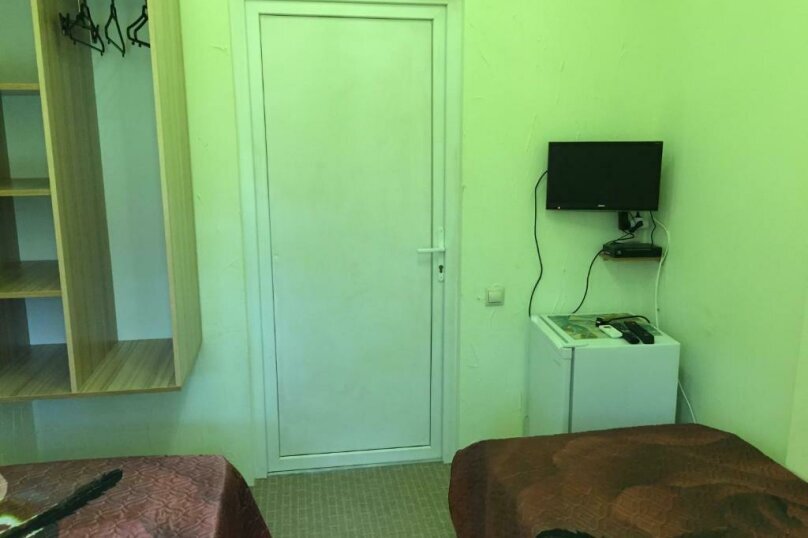 Две раздельные кровати, холодильник, кондиционер, телевизор. Санузел во дворе только для этих двух номеров (2 номера);