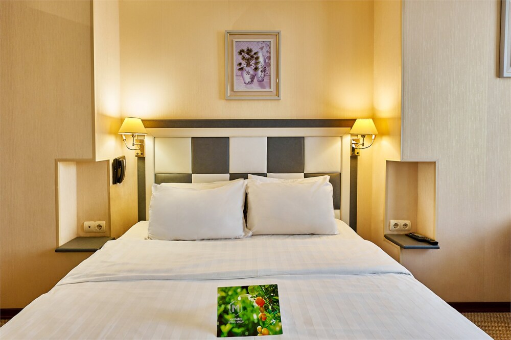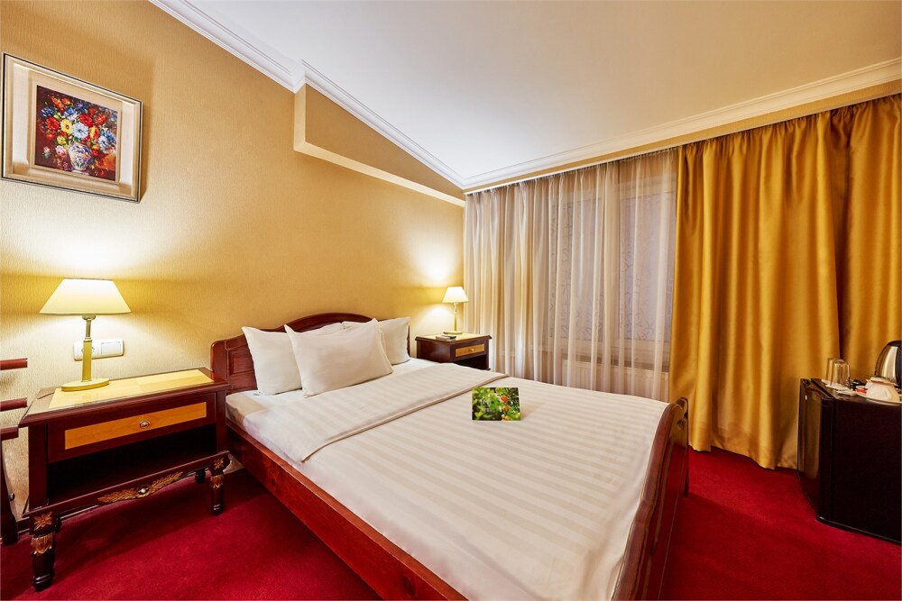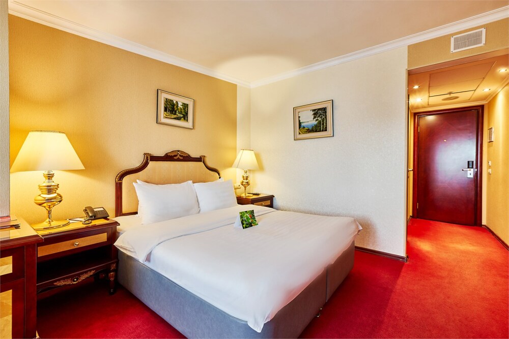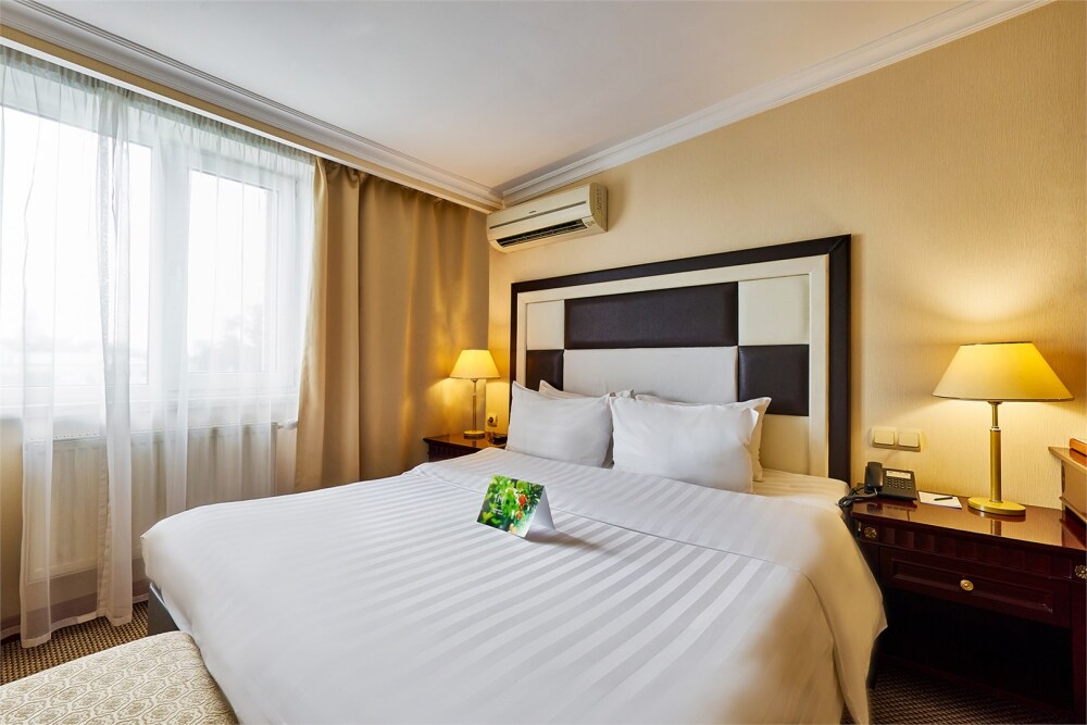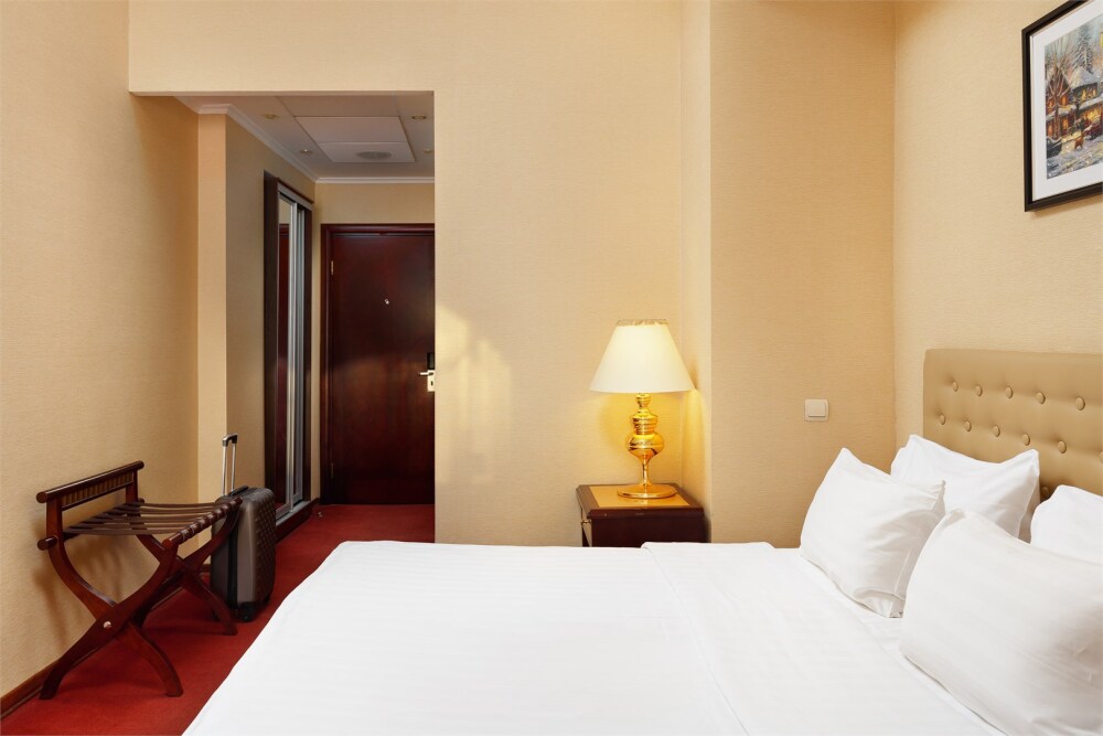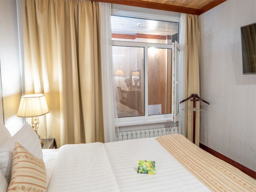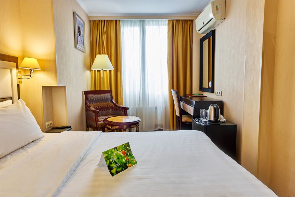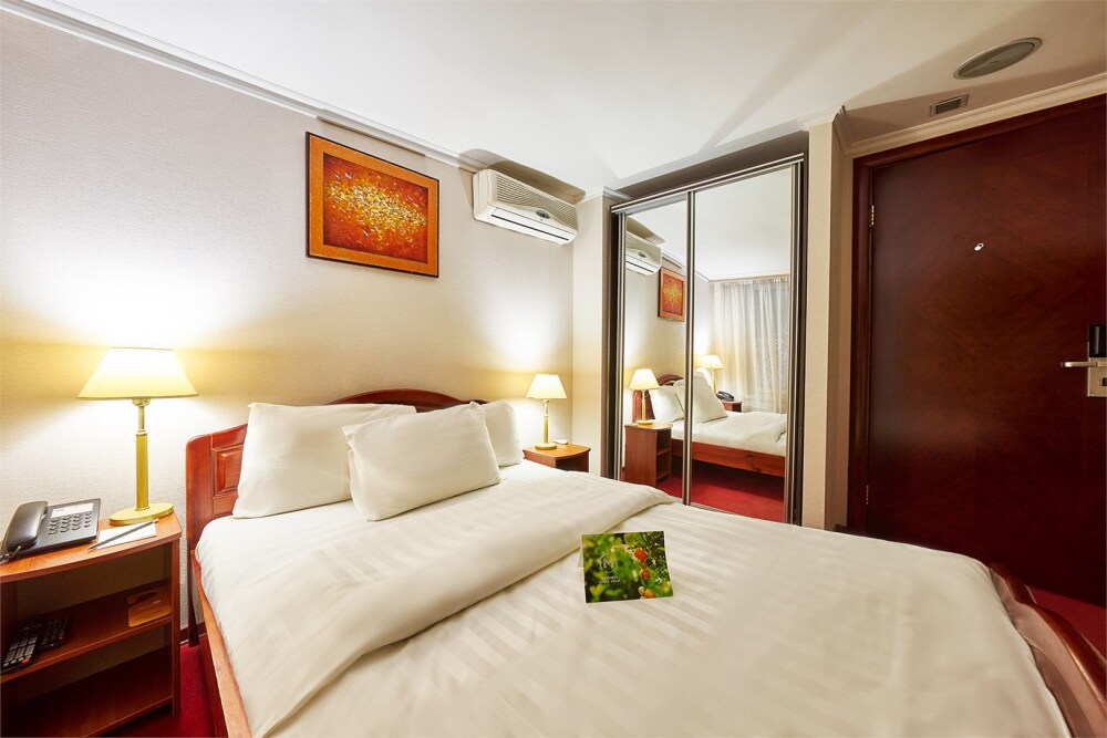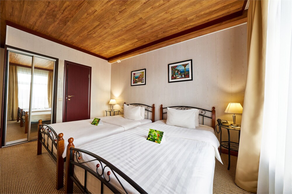 В номере: одна двуспальная (160 см*200 см, или 180 см*200 см) или две раздельные кровати ( 90 см*200 см, или 120 см*200 см).