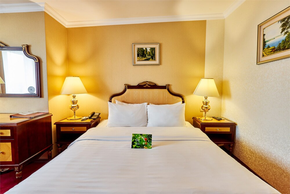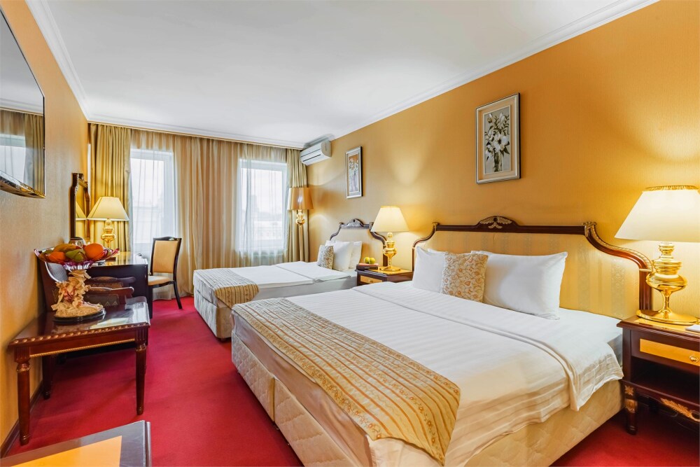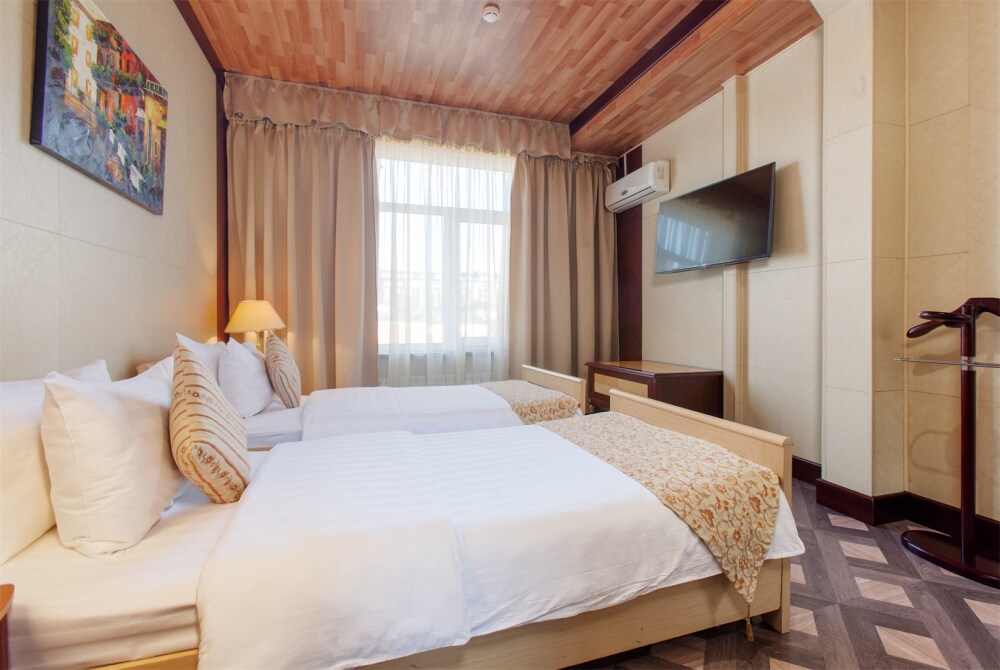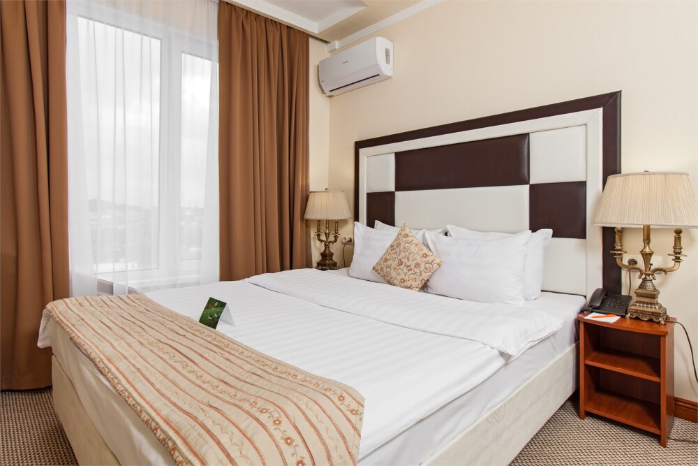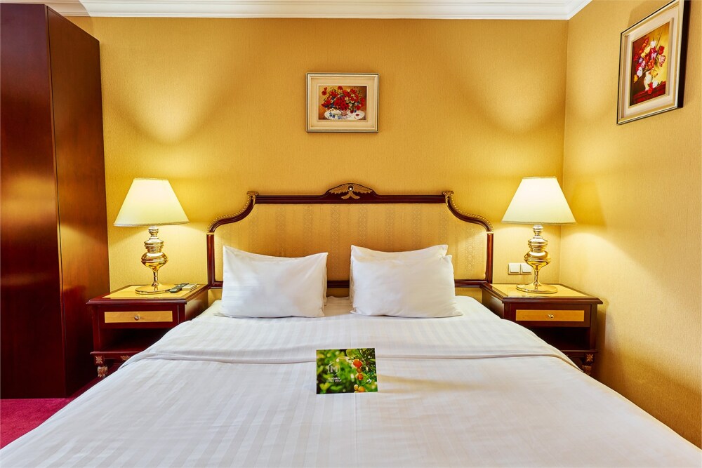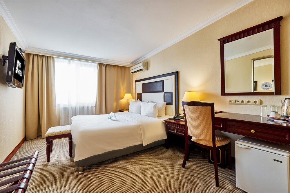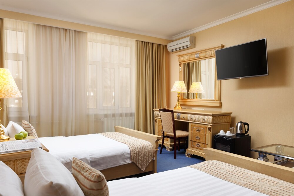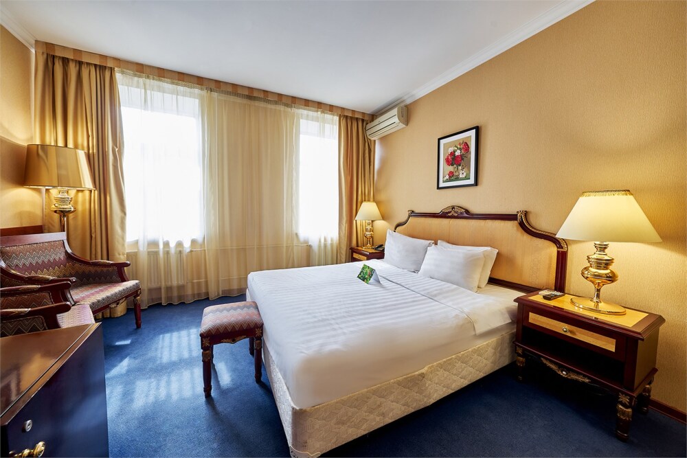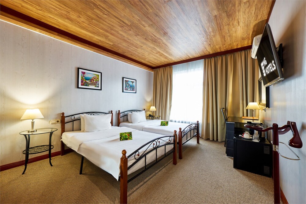 В номере: одна двуспальная (160 см*200 см, или 180 см*200 см) или две раздельные кровати ( 90 см*200 см, или 120 см*200 см).