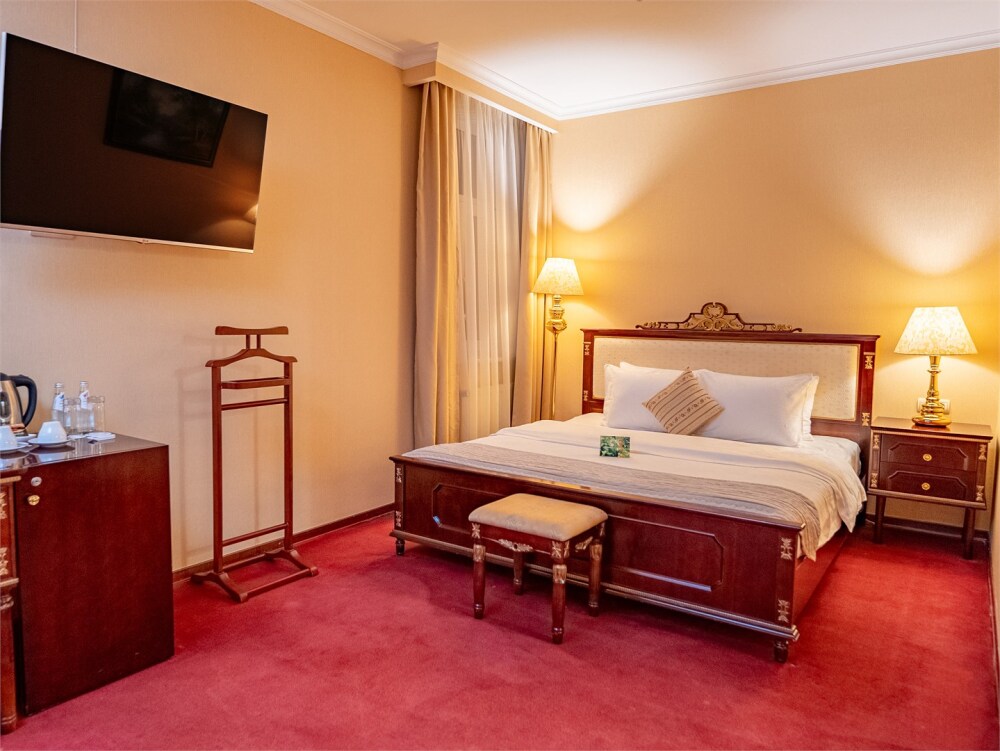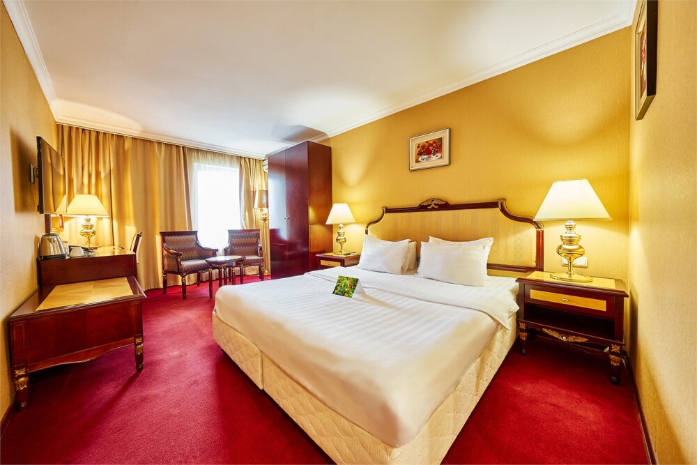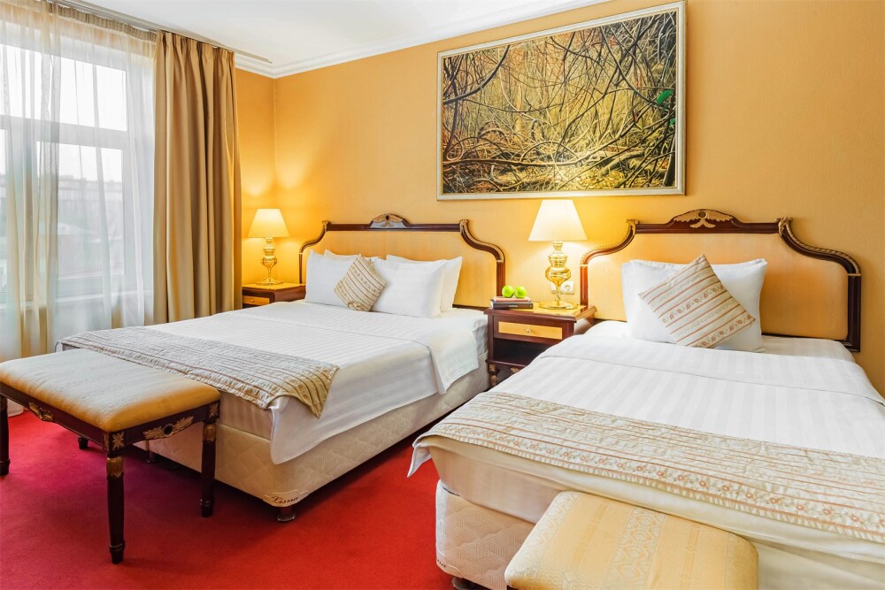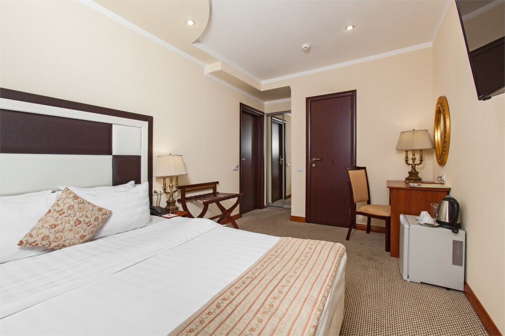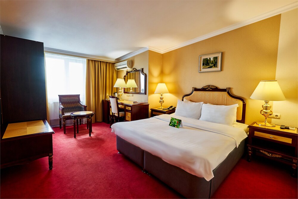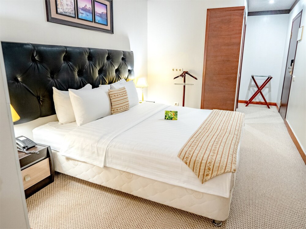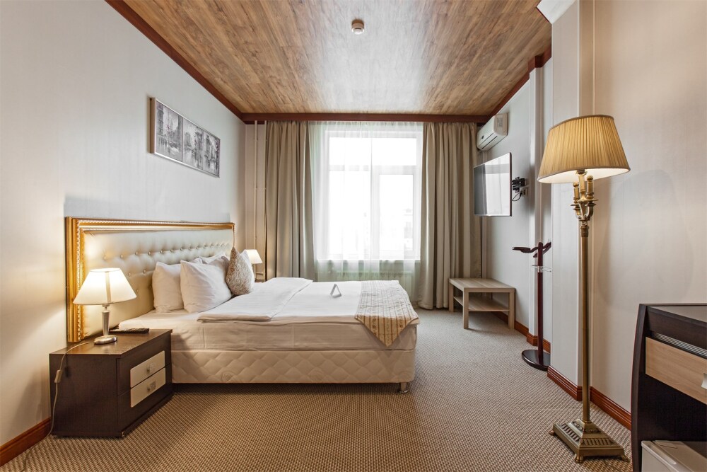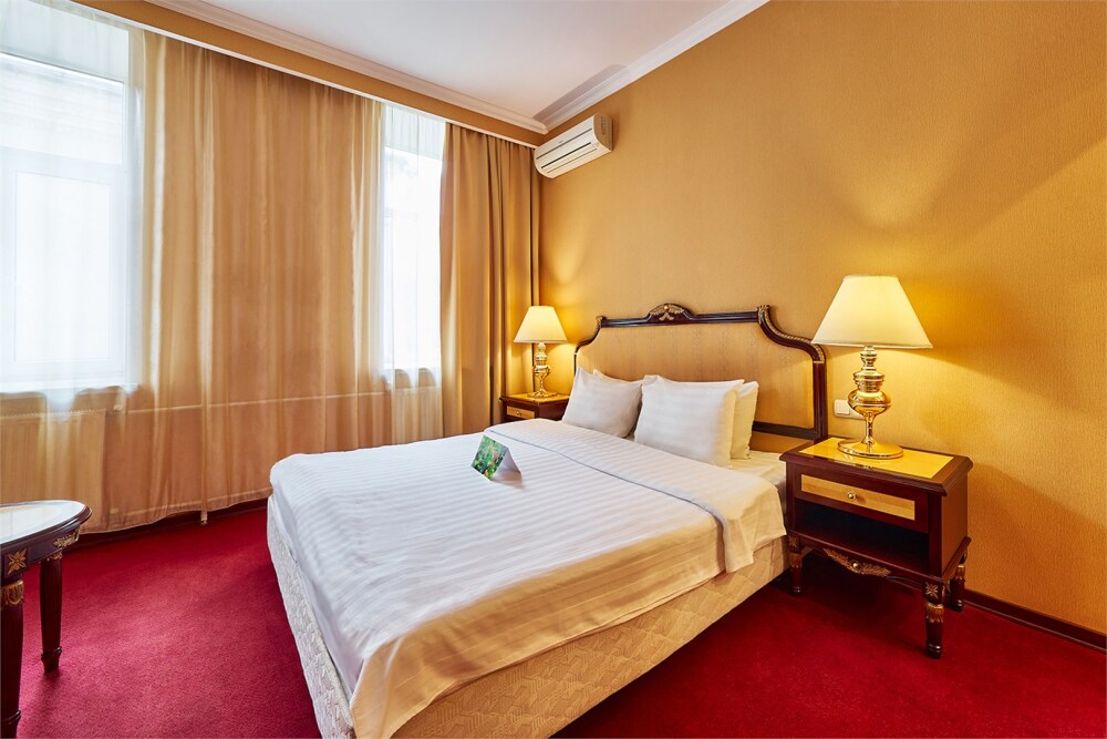 В номере: одна двуспальная (160 см*200 см, или 180 см*200 см) или две раздельные кровати ( 90 см*200 см, или 120 см*200 см).