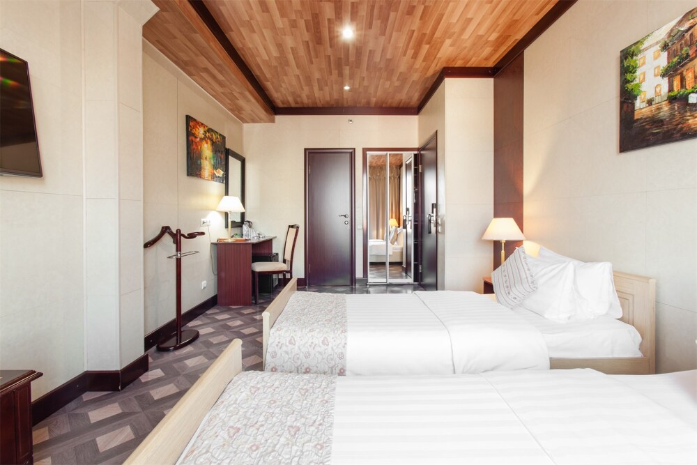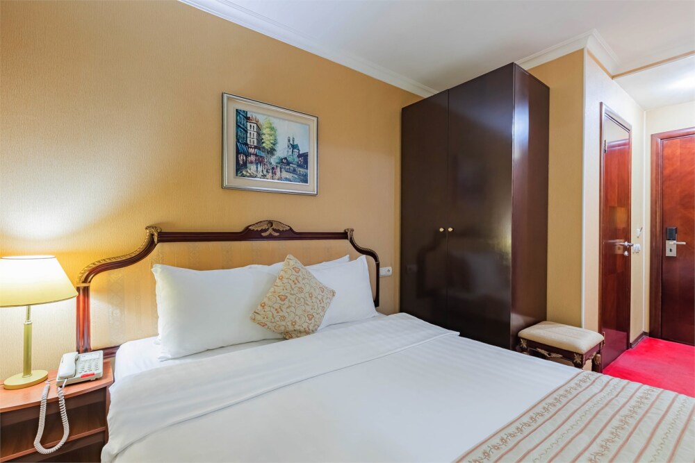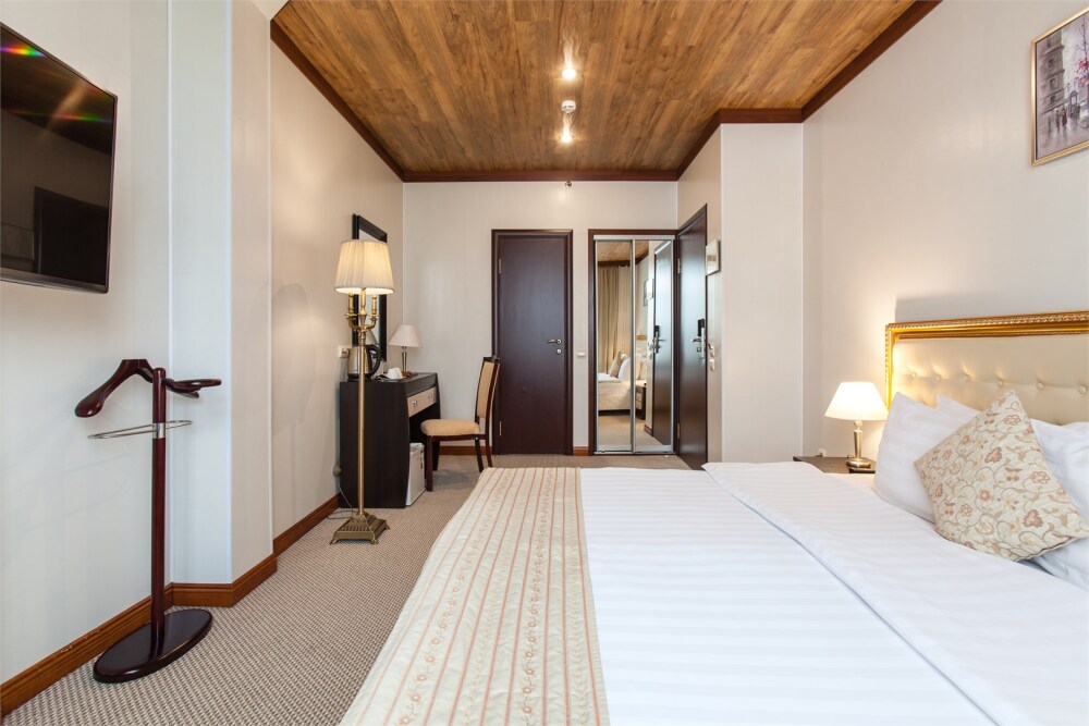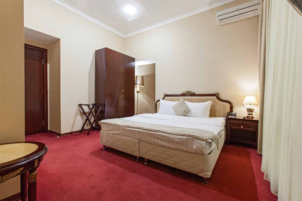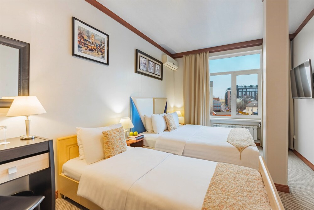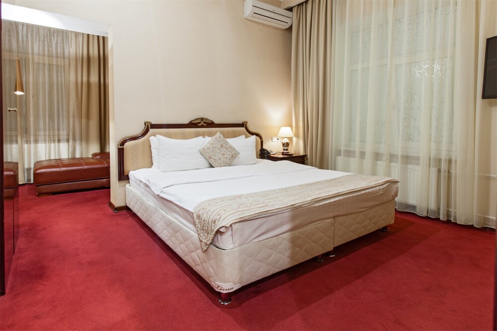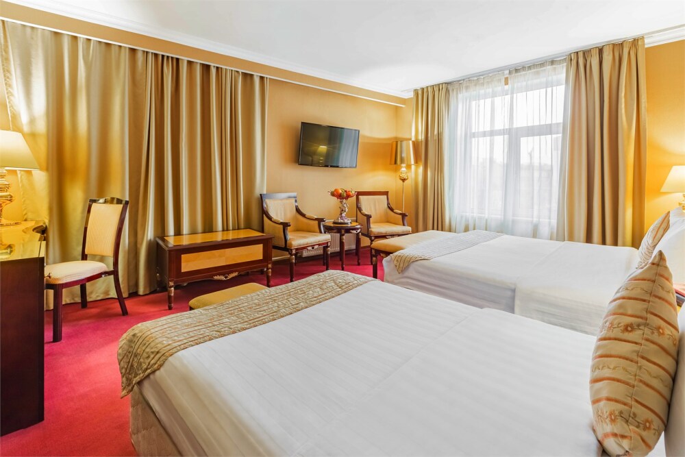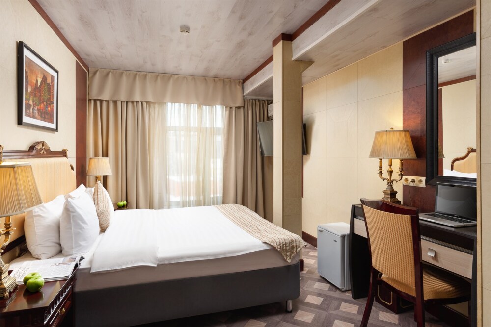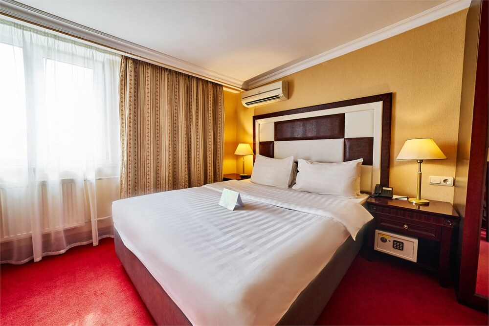 В номере: одна двуспальная (160 см*200 см, или 180 см*200 см) или две раздельные кровати ( 90 см*200 см, или 120 см*200 см).